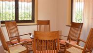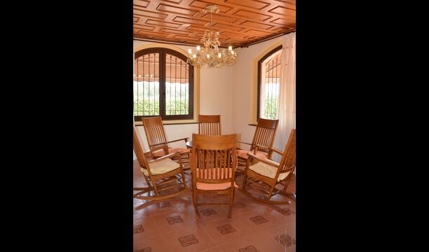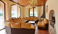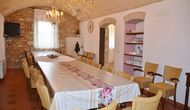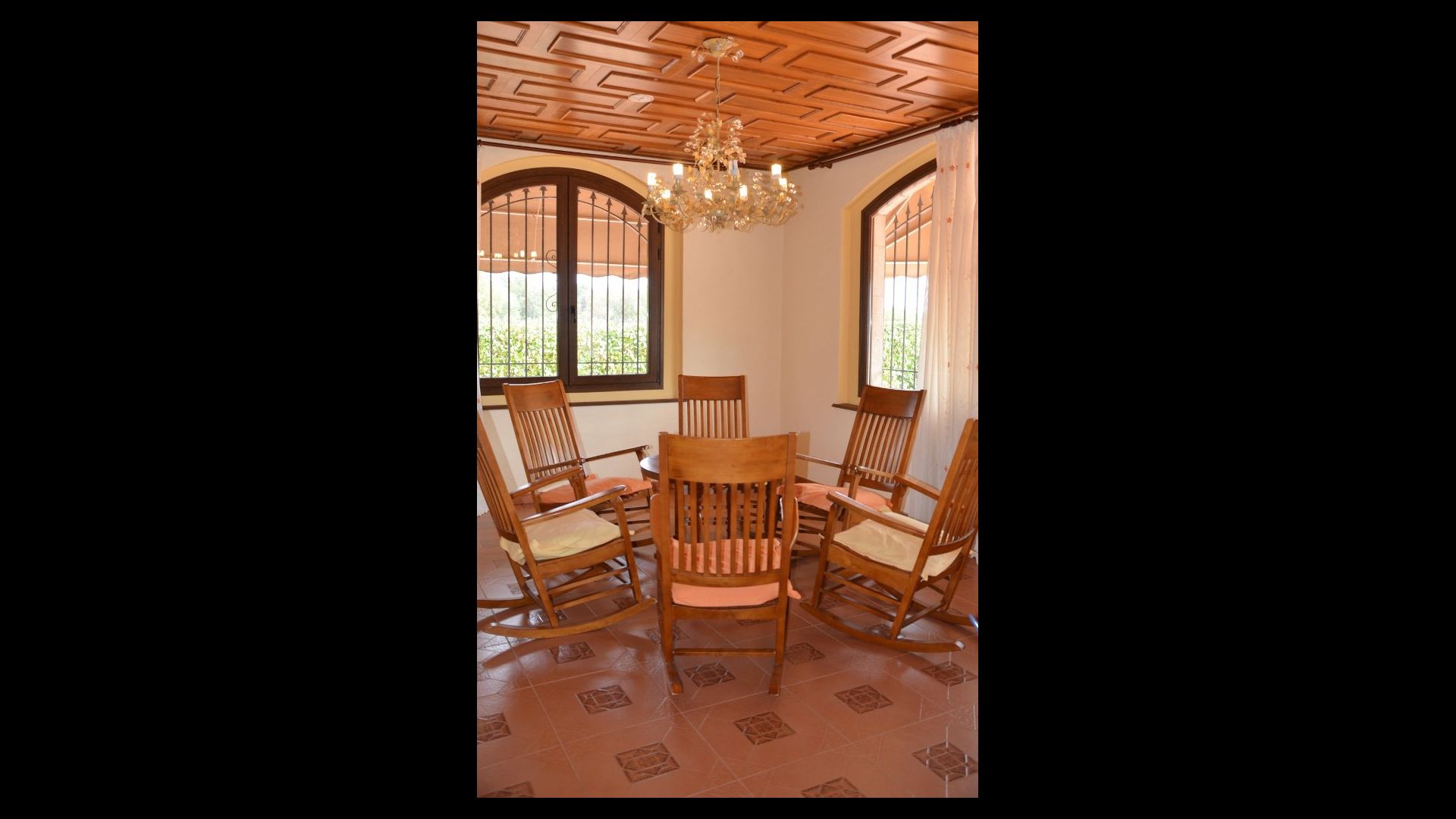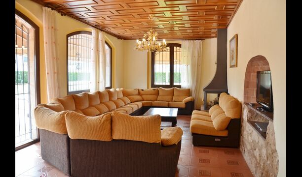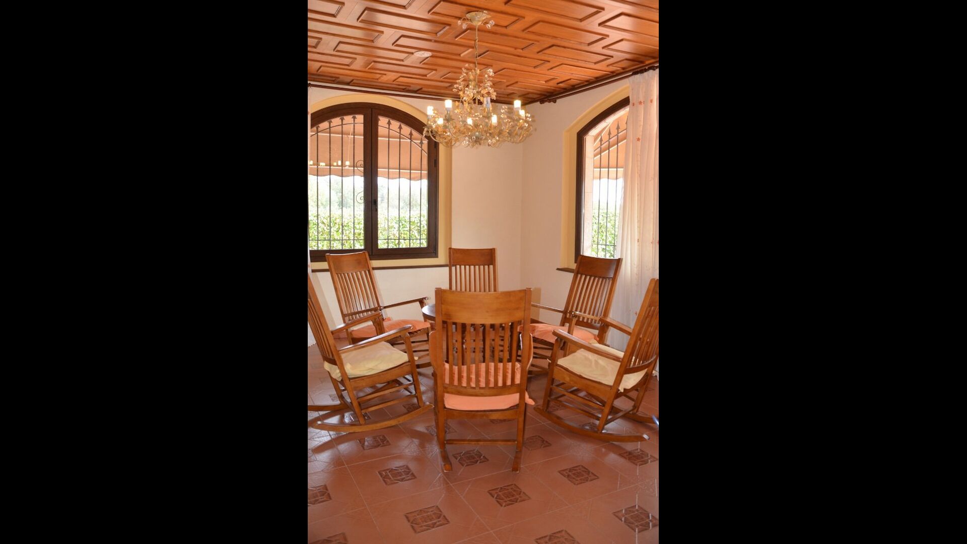 Dentro de la casa, la cocina está conectada directamente al comedor muy grande, con una larga mesa de comedor, por lo que también pueden cenar juntos si lo prefieren. A la izquierda, hay una espaciosa sala de estar donde puedes relajarte en el área de la "abuela" con 8 mecedoras, o en el área del sofá con el sofá más grande que hemos visto, TV y chimenea, si vienes en invierno .
