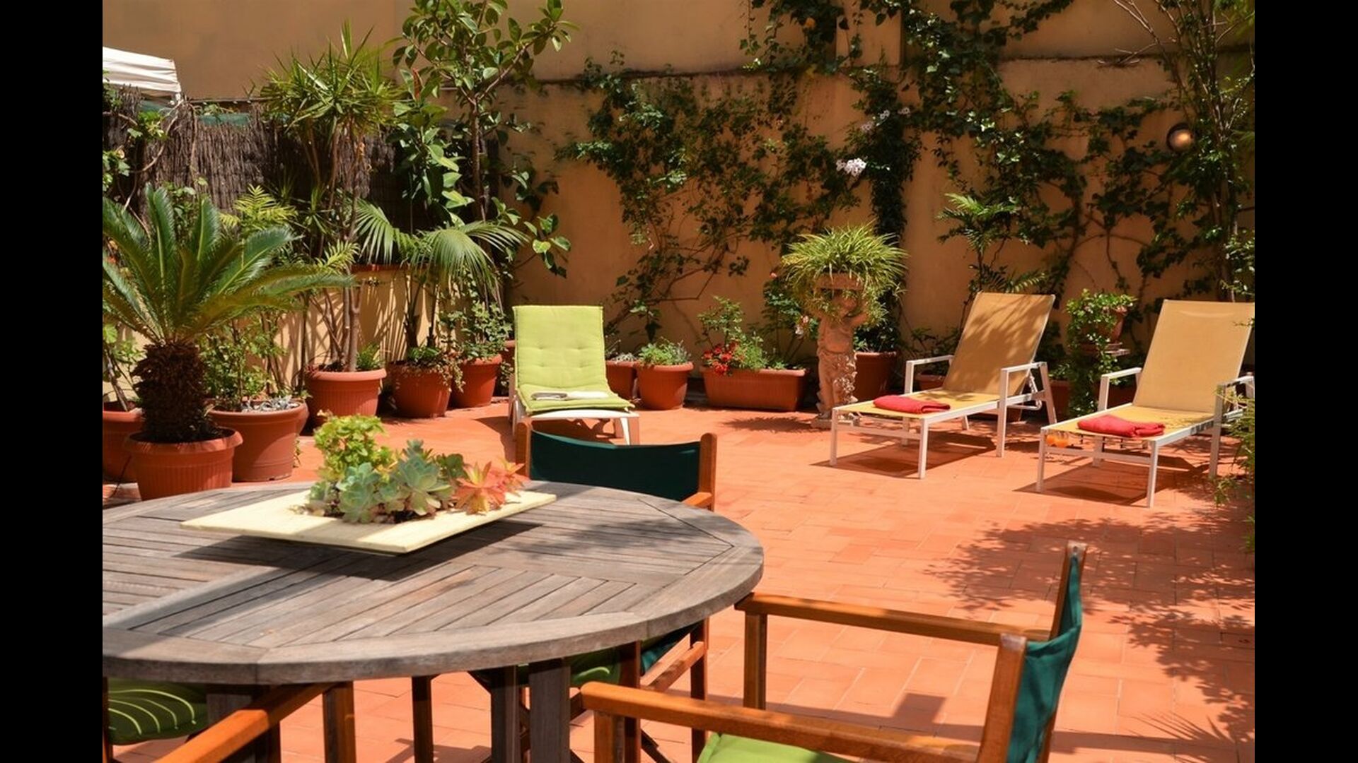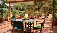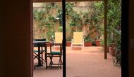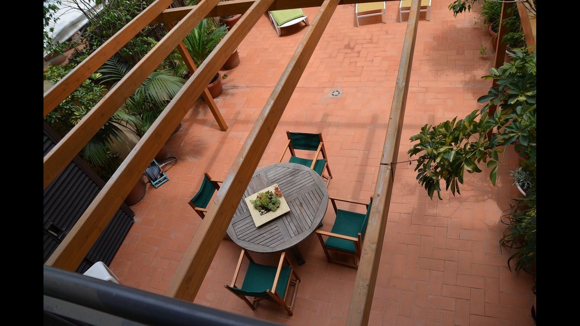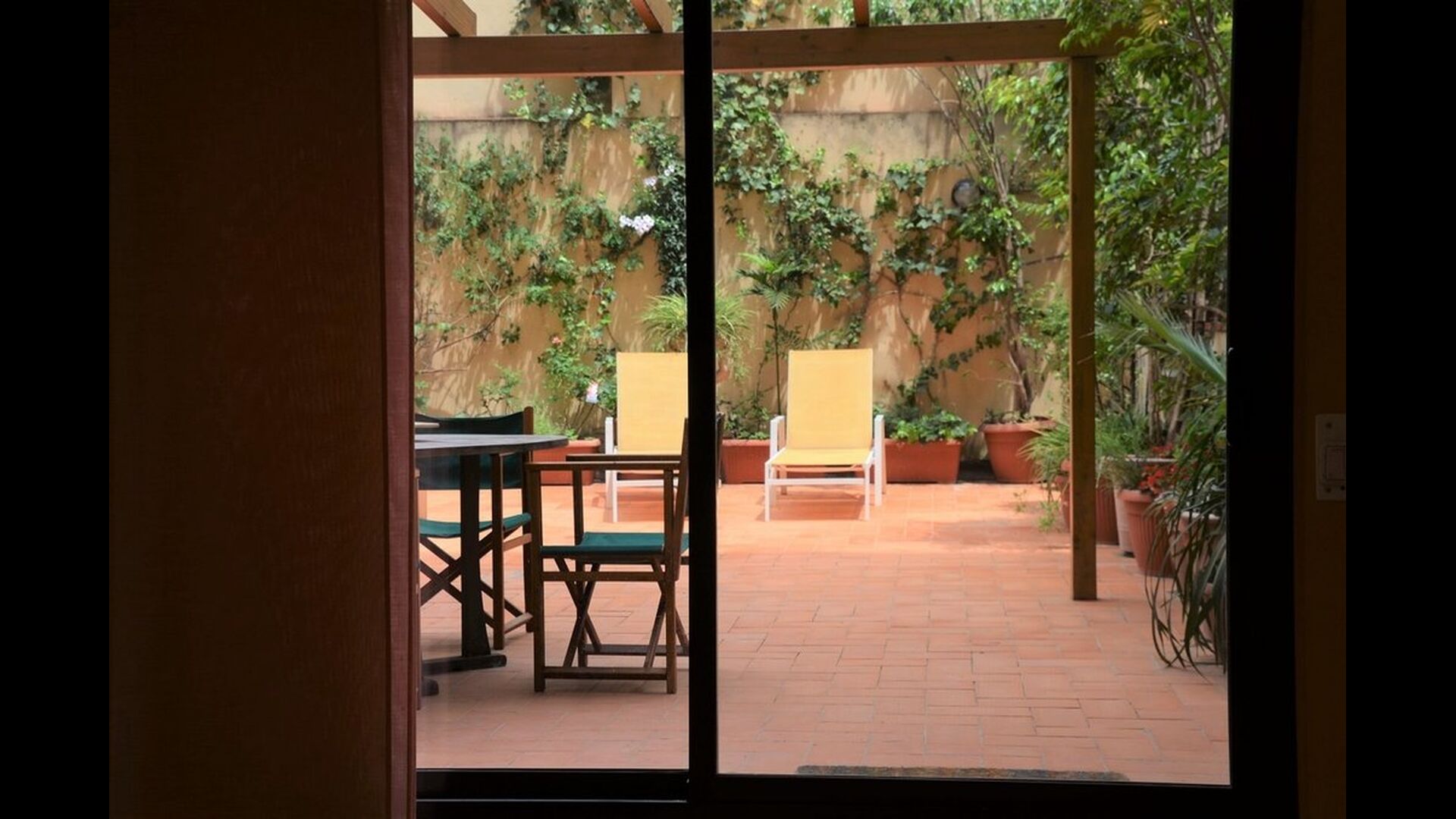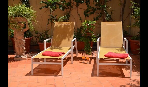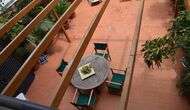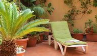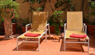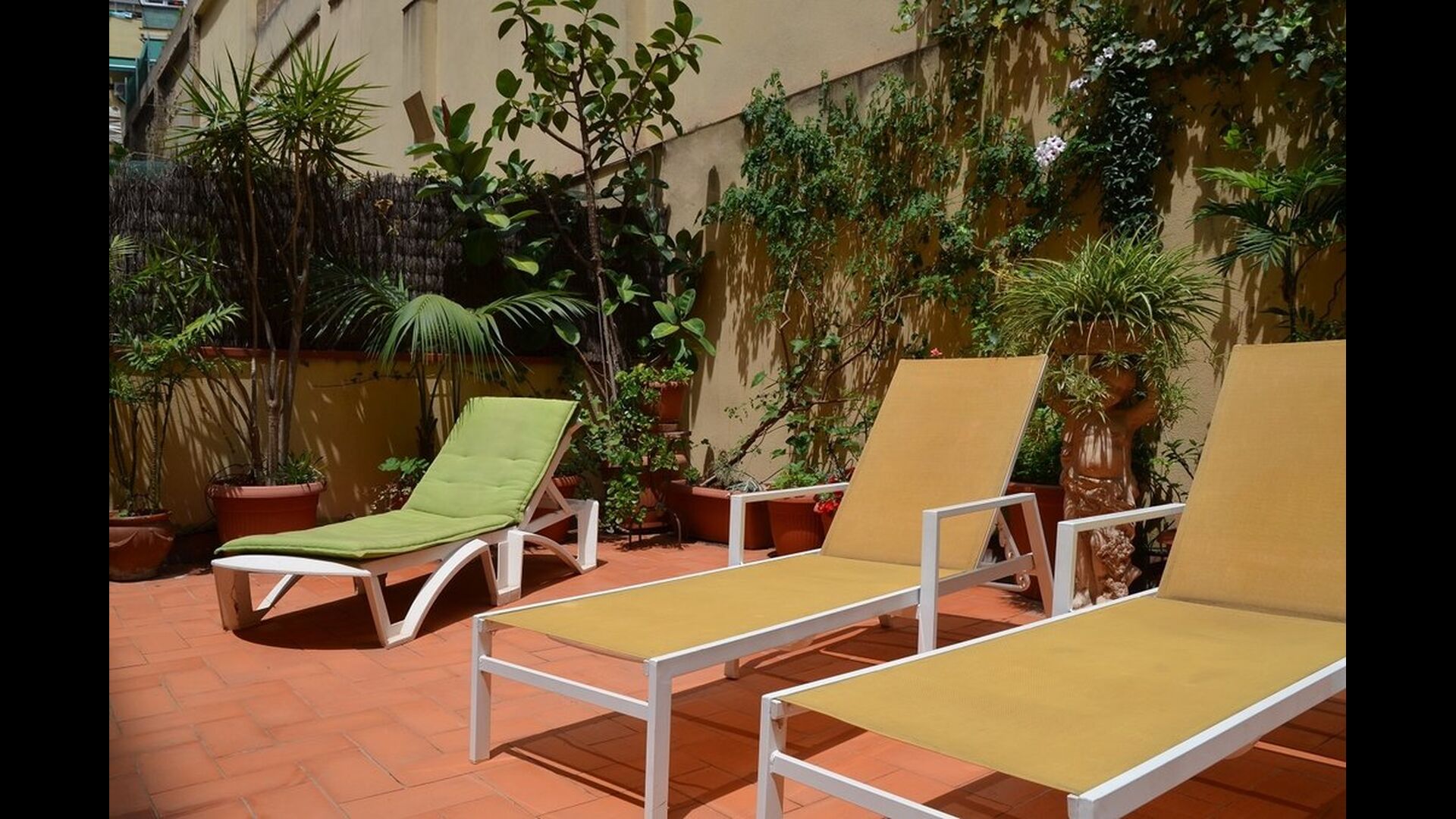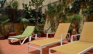 From this room and from the common room, there is view and access to the courtyard through two big sliding doors of glass. The Courtyard is almost 100m2 and has a terrace area, which is most of the time shady, and an area with sunloungers, where you can enjoy the sun most parts of the day. It is fascinating how you can stay so central in Barcelona, and still have the feeling of being all by yourself!
