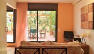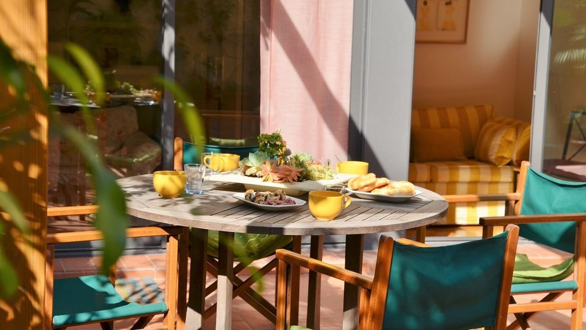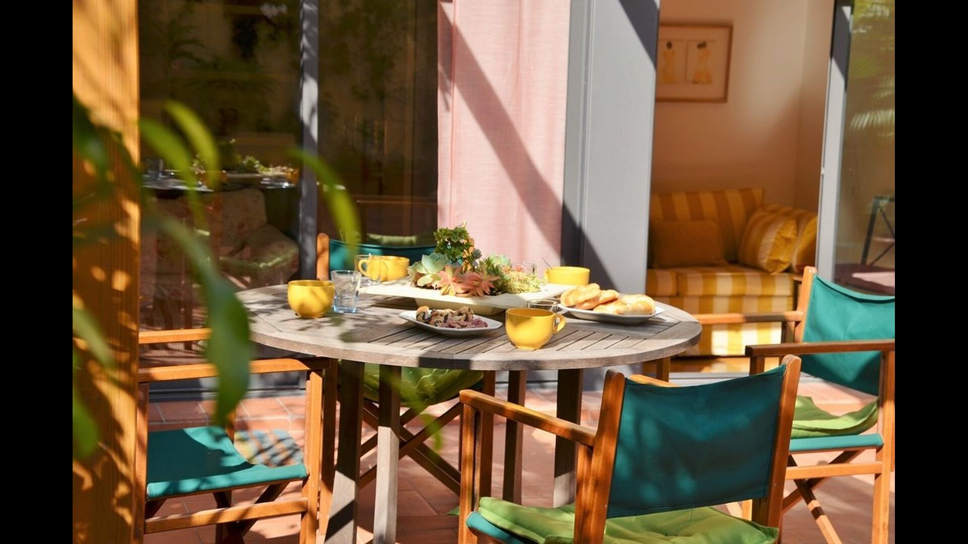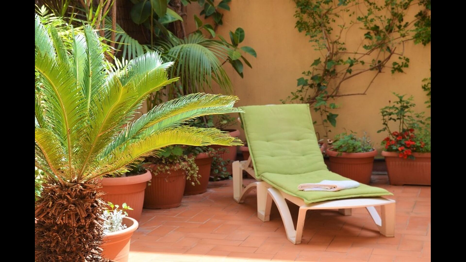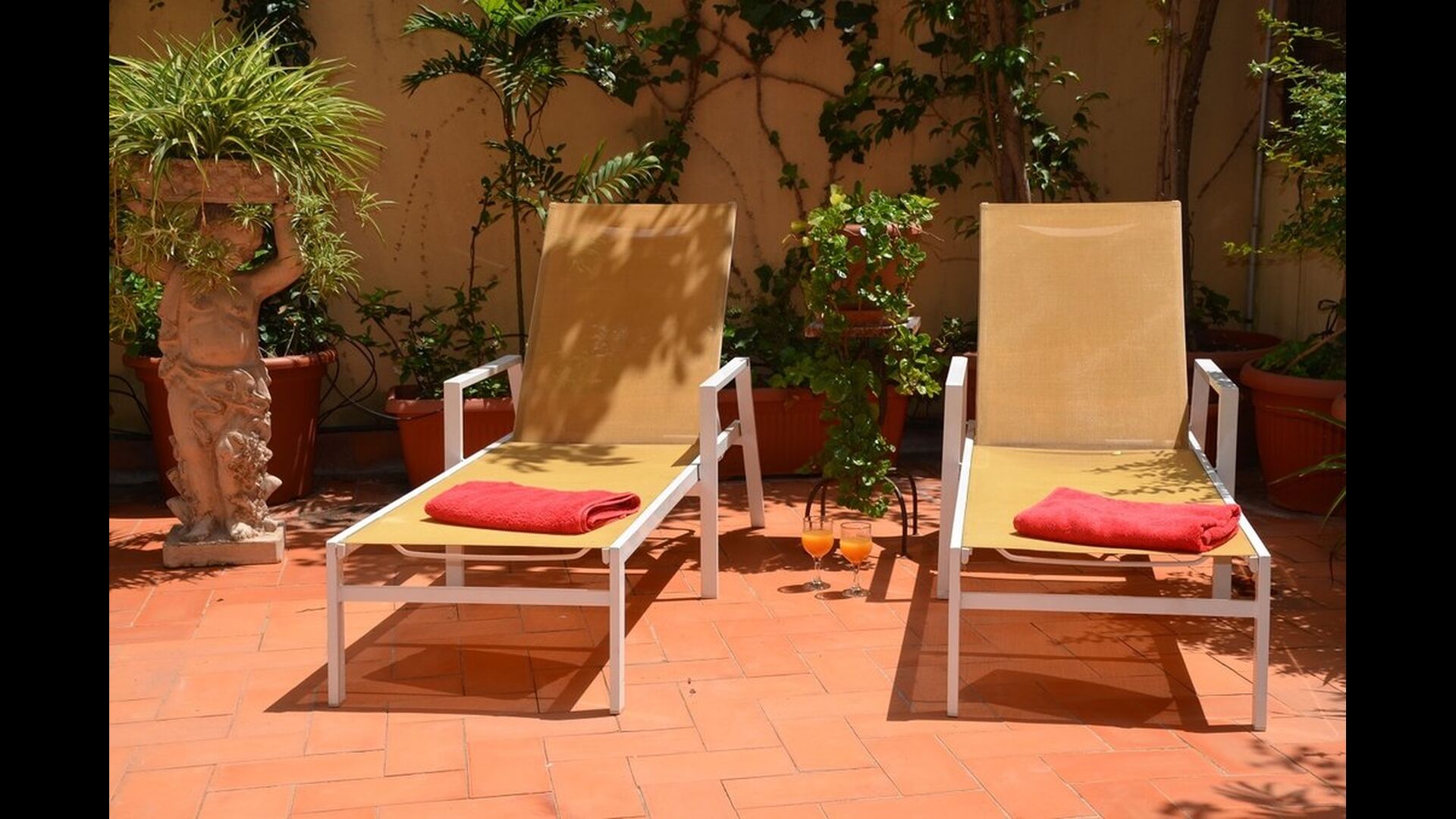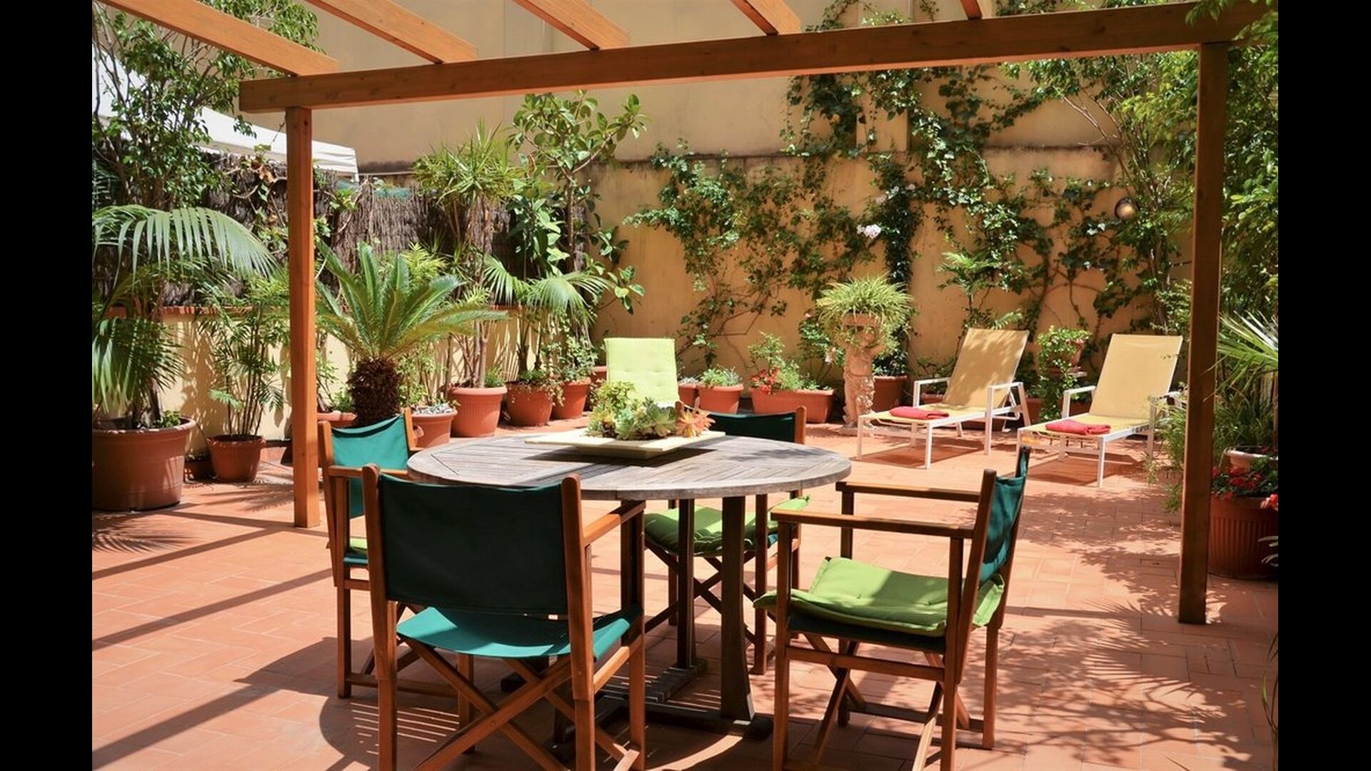 From this room and from the common room, there is view and access to the courtyard through two big sliding doors of glass. The Courtyard is almost 100m2 and has a terrace area, which is most of the time shady, and an area with sunloungers, where you can enjoy the sun most parts of the day. It is fascinating how you can stay so central in Barcelona, and still have the feeling of being all by yourself!
