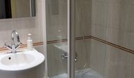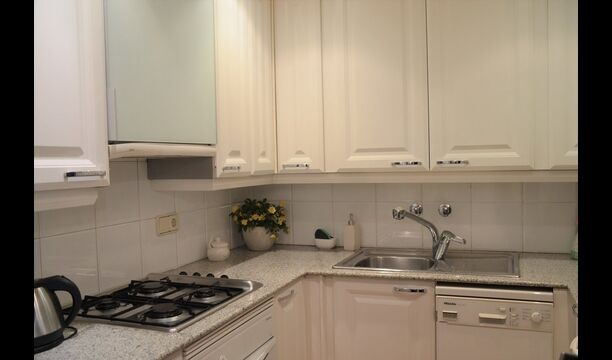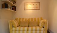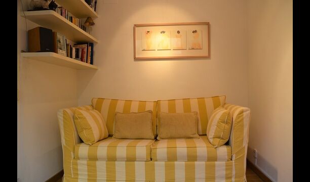 On the ground floor, there is a toilet without bath and a big common room with dining table for 6 persons, a sofa corner with TV and DVD or, if preferable, you can just enjoy the view very green courtyard. The kitchen is very well-equipped with fridge and freezer, stove, oven, microwave, coffeemaker, kettle and dishwasher. Divided by a sliding door, there is an extra room with a double sofa-bed, making it possible to stay up to 6 persons in the apartment. This floor has also aircondition, and the apartment has WIFI-internet.