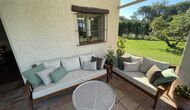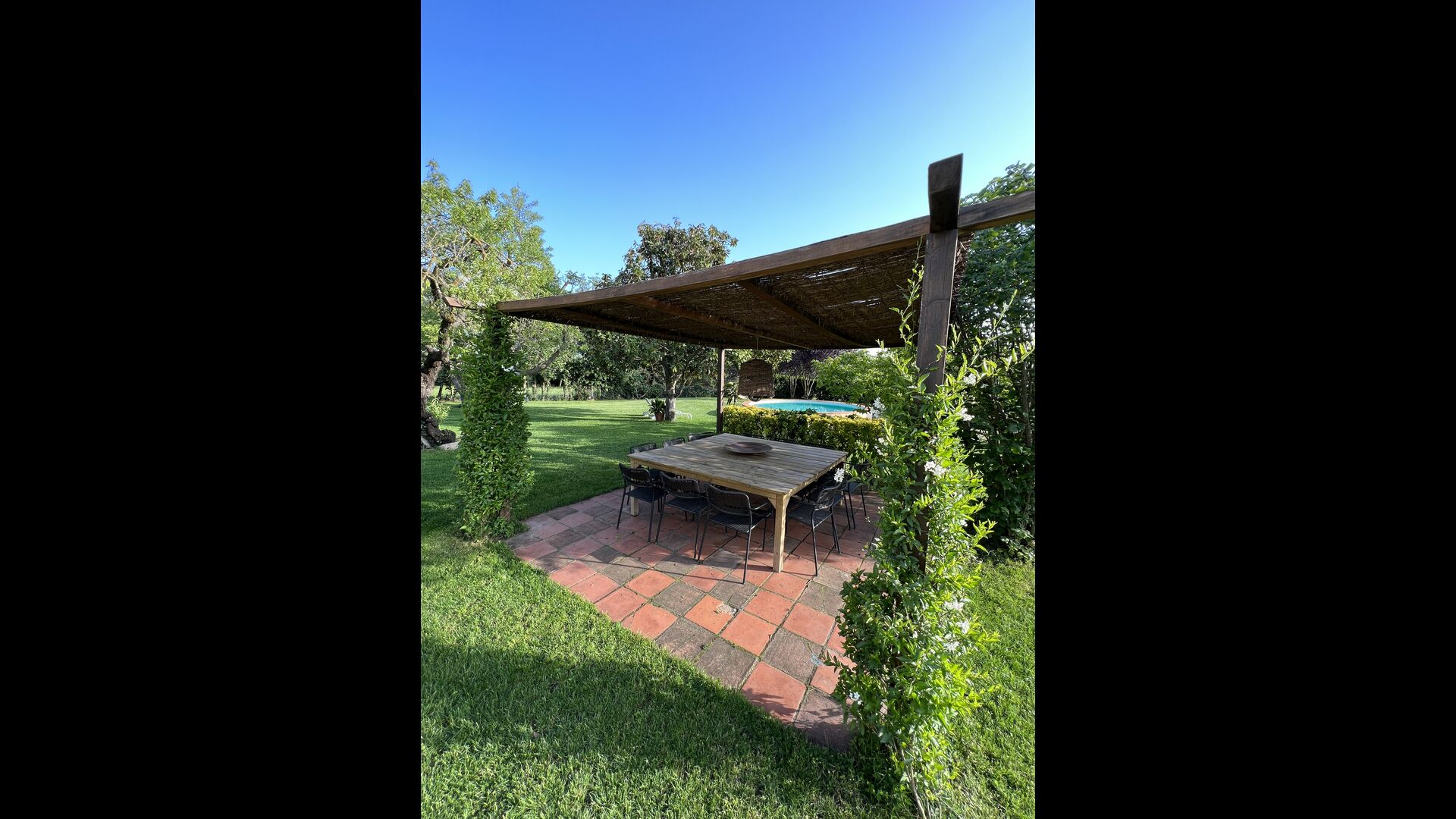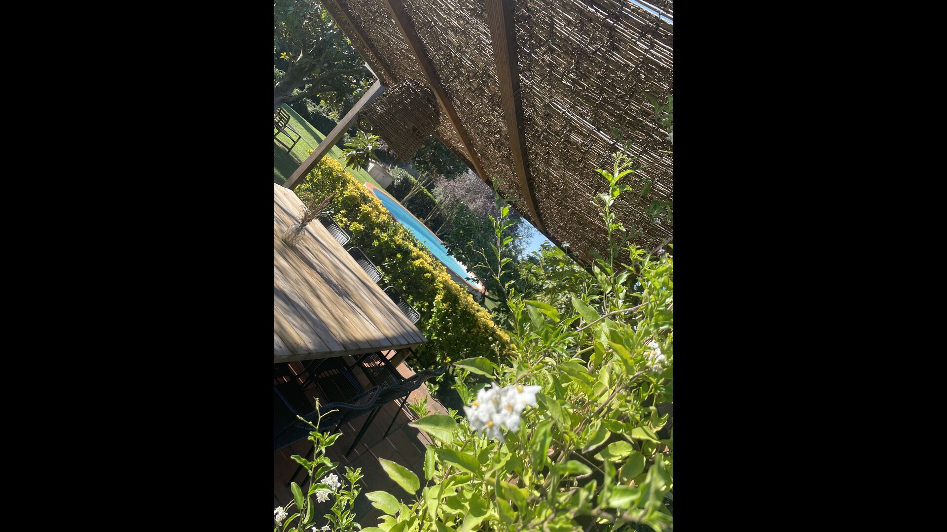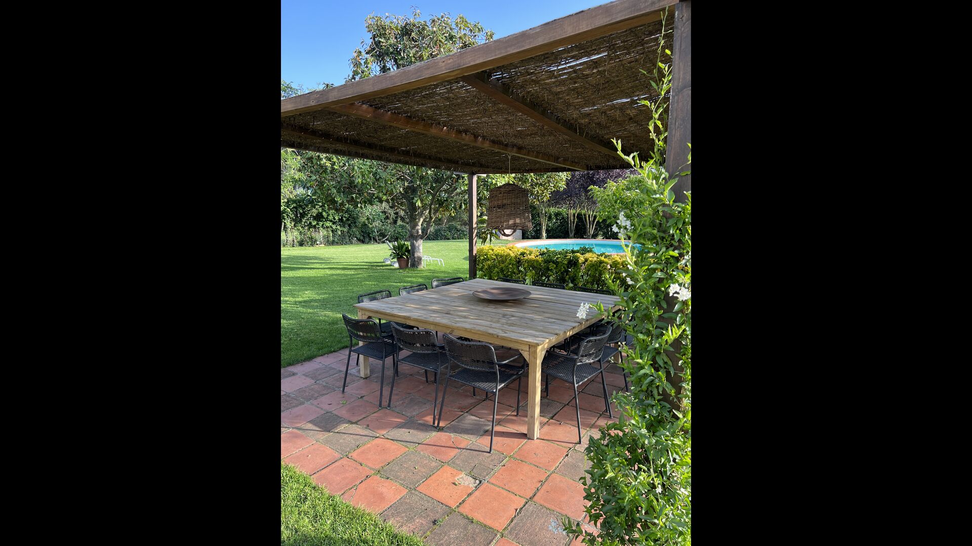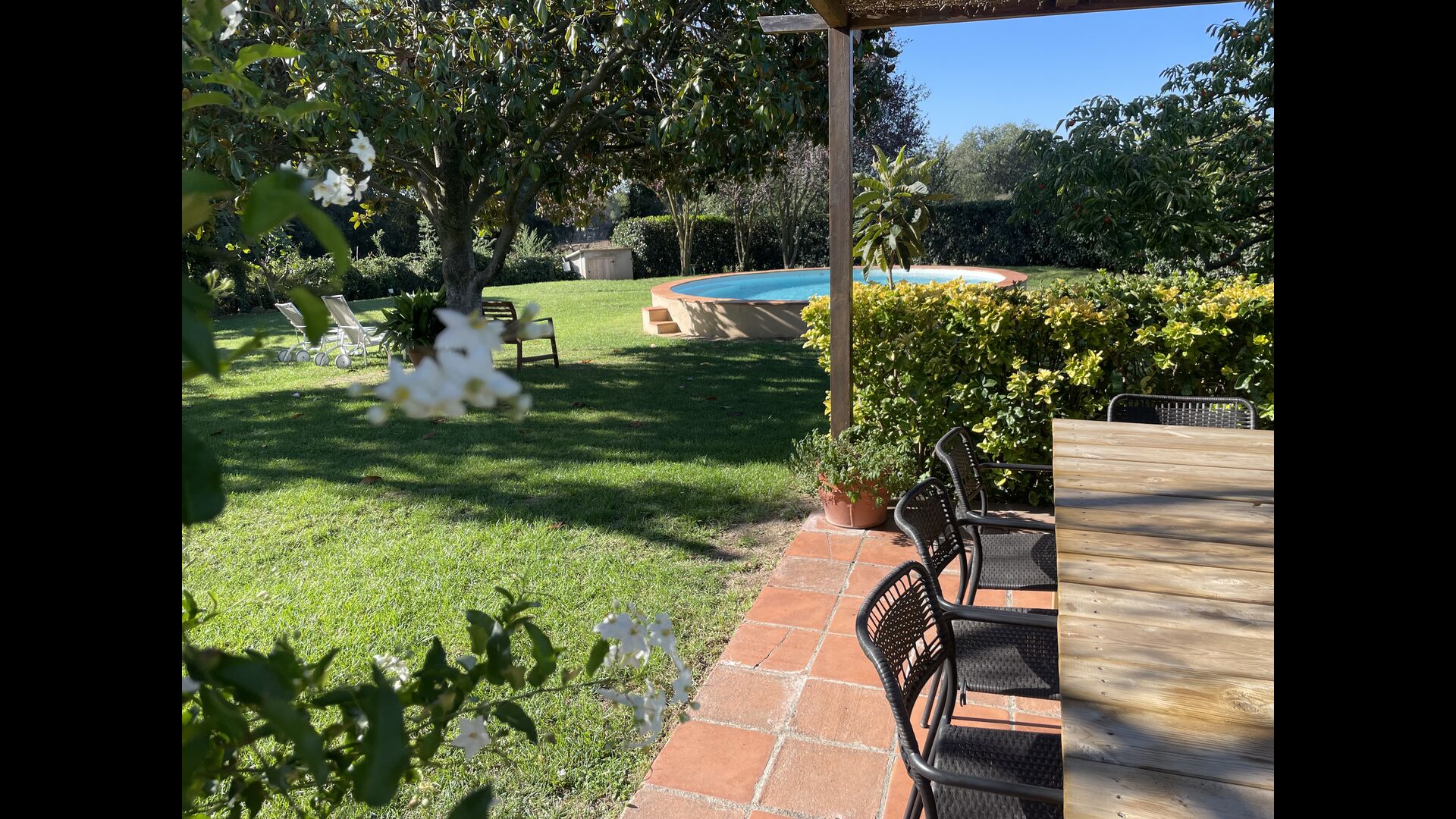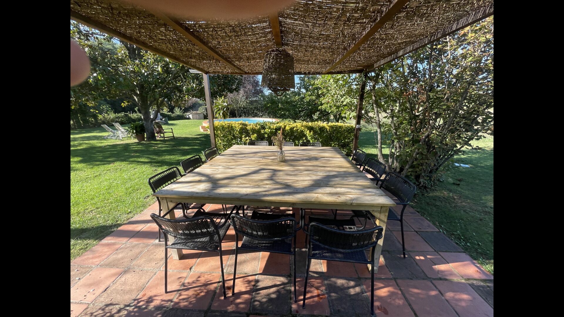 Puedes sentarte y disfrutar de la vista, a nada más que un paso de la puerta de la planta baja si el calor aumenta. Hay una zona de comedor/chill-out adicional en medio del jardín, con dosel y una bonita mesa y sillas. El jardín está adornado con hermosos árboles y arbustos, y desde la hermosa piscina podrá contemplar su pedacito de paraíso. La piscina también tiene un banco incorporado, para cuando p.e. Necesitas descansar las piernas después de jugar con los niños, o si simplemente quieres relajarte en el suave chapoteo del agua bajo el encantador sol catalán.