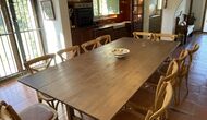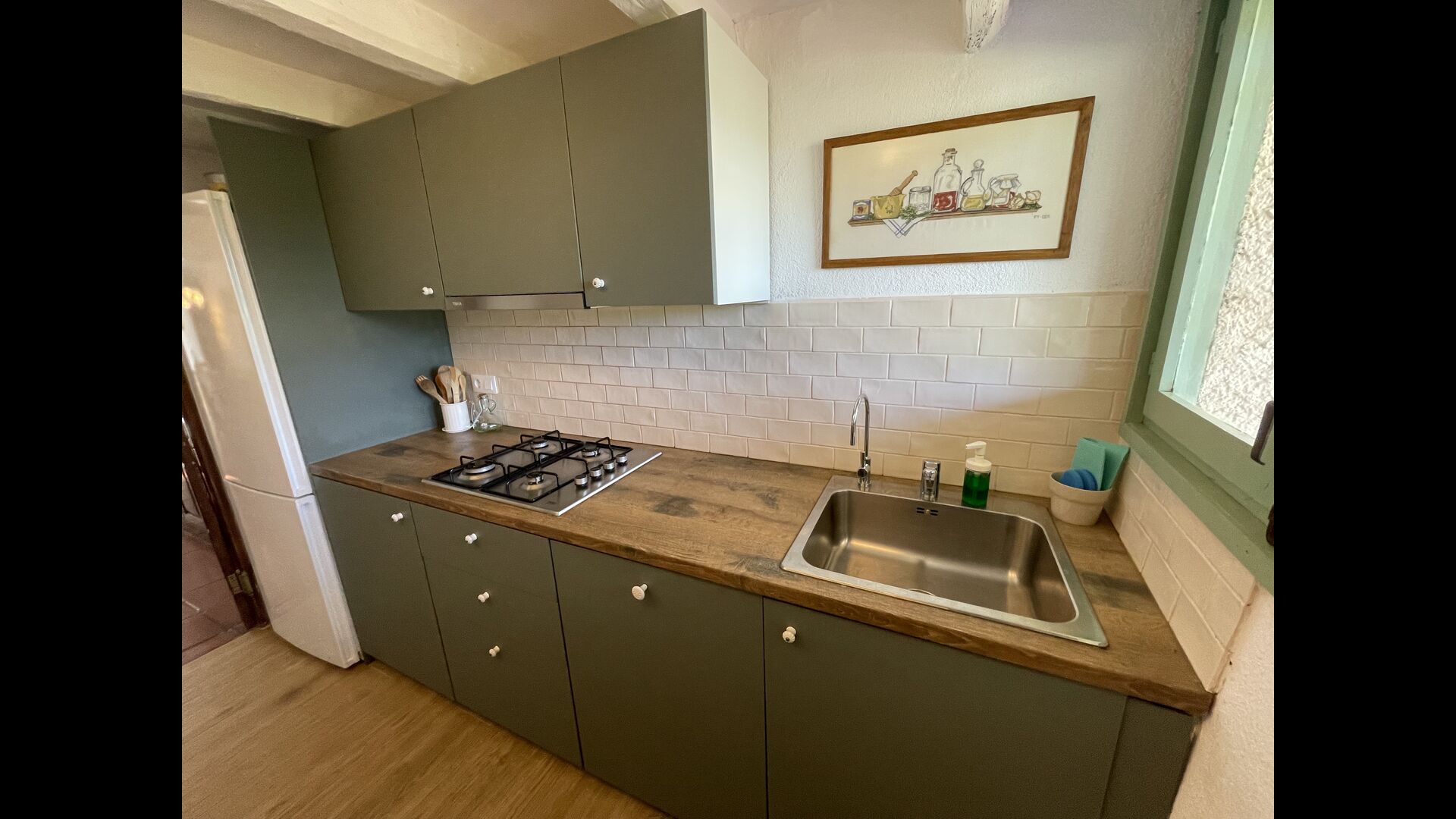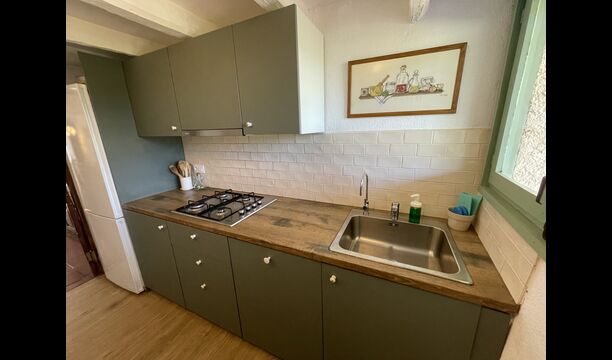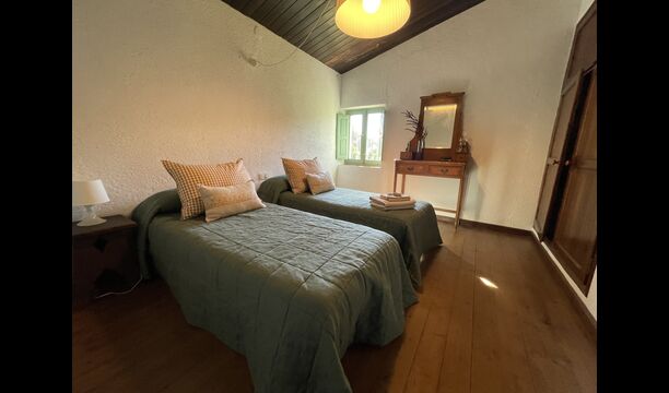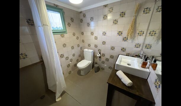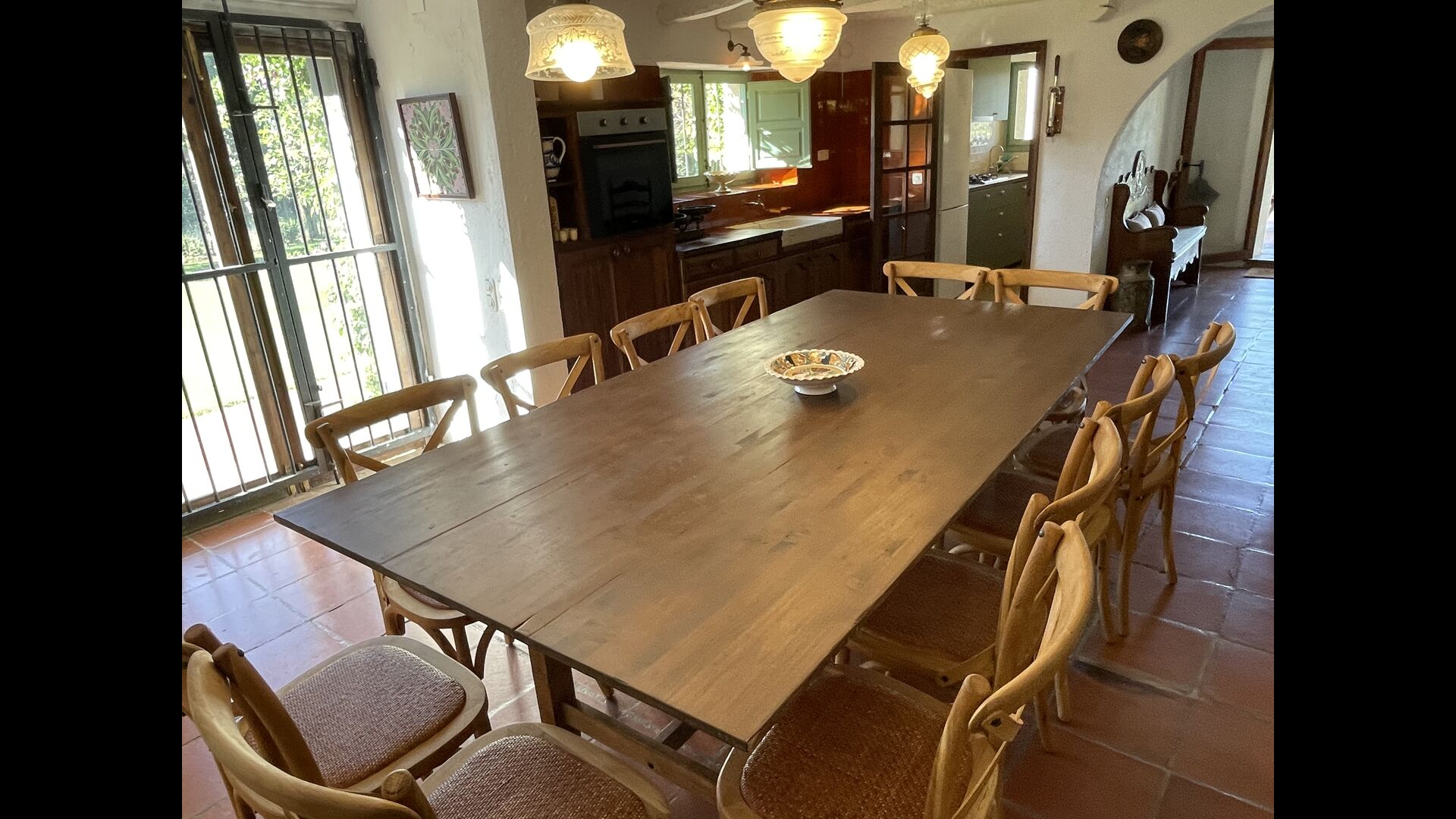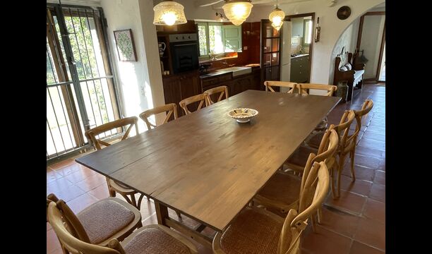 La casa consta de dos plantas – ndash; planta baja y primer piso - ndash; y tiene capacidad para 12 personas. Hay 6 habitaciones: todo på primer piso. Si entras por la puerta principal de la planta baja encontrarás un entre con mucho espacio. Si avanzas más, encontrarás el comedor y las cocinas, todas ellas equipadas. una cocina clásica, con un precioso acabado, así como una cocina moderna – justo uno al lado del otro. Hay 2 frigoríficos, cuatro cocinas de gas con campana en la cocina moderna y un horno en la cocina clásica. Aquí también encontrará el lavavajillas. Ambas cocinas disponen de fregadero. Y junto a la cocina clásica, hay una bonita mesa de comedor donde hay espacio – y sillas para – 12 personas. Hay buena iluminación en la habitación; tanto desde la puerta principal, como desde otra puerta que también da al jardín.