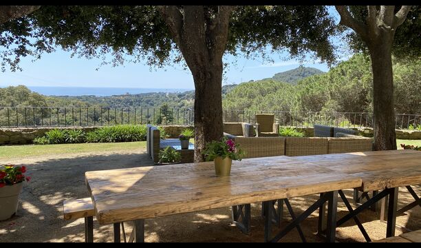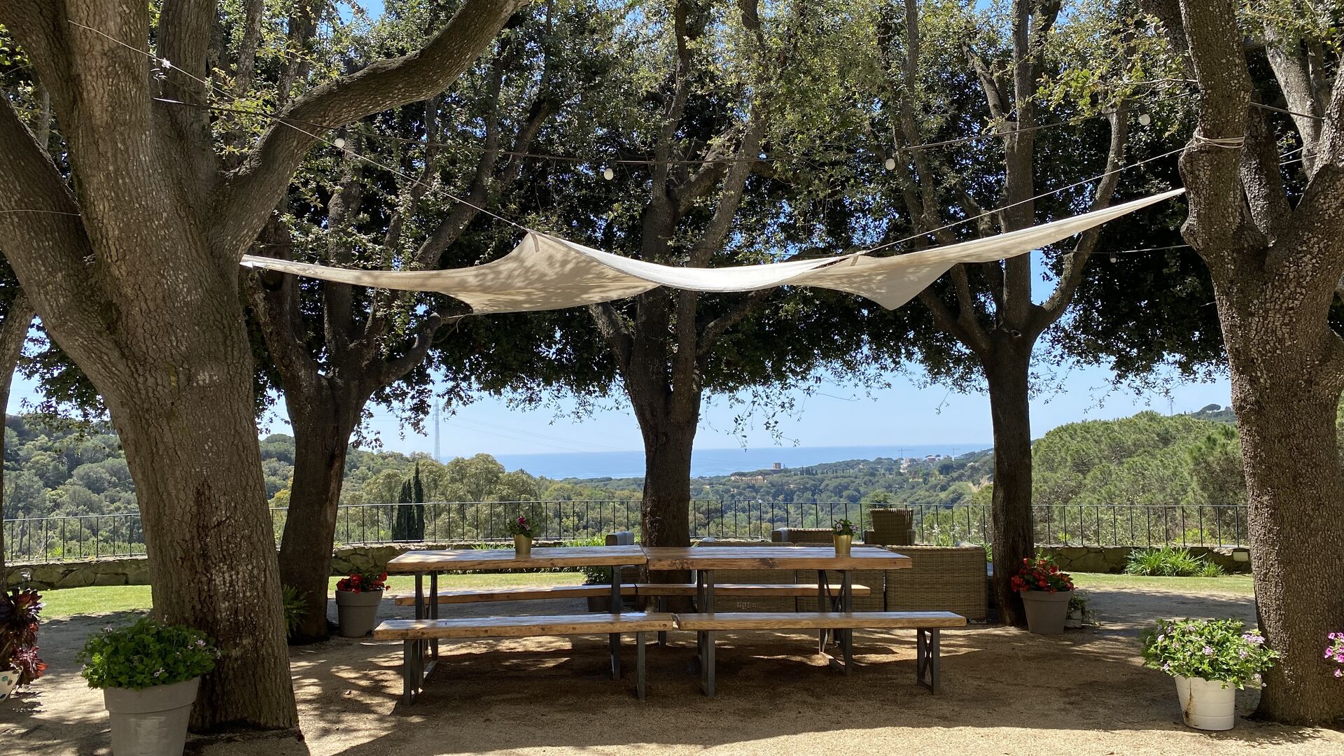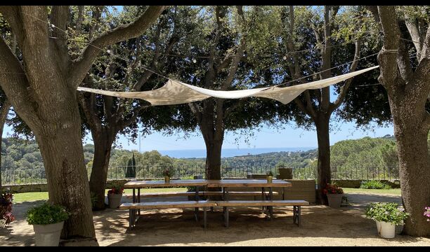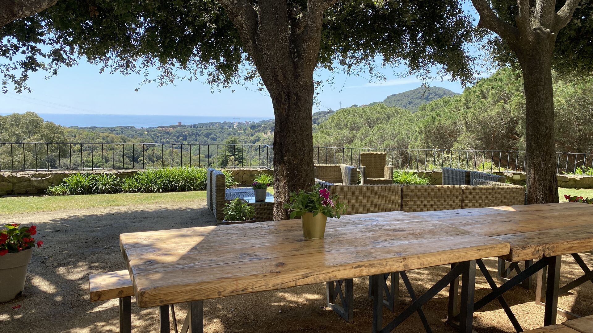 Junto al área de la piscina se encuentra un área sombreada con una gran mesa de comedor, que también comparte la increíble vista desde la piscina. El lugar perfecto para disfrutar de comidas al aire libre o de una copa con todo el grupo de vacaciones, en el cálido clima catalán.
