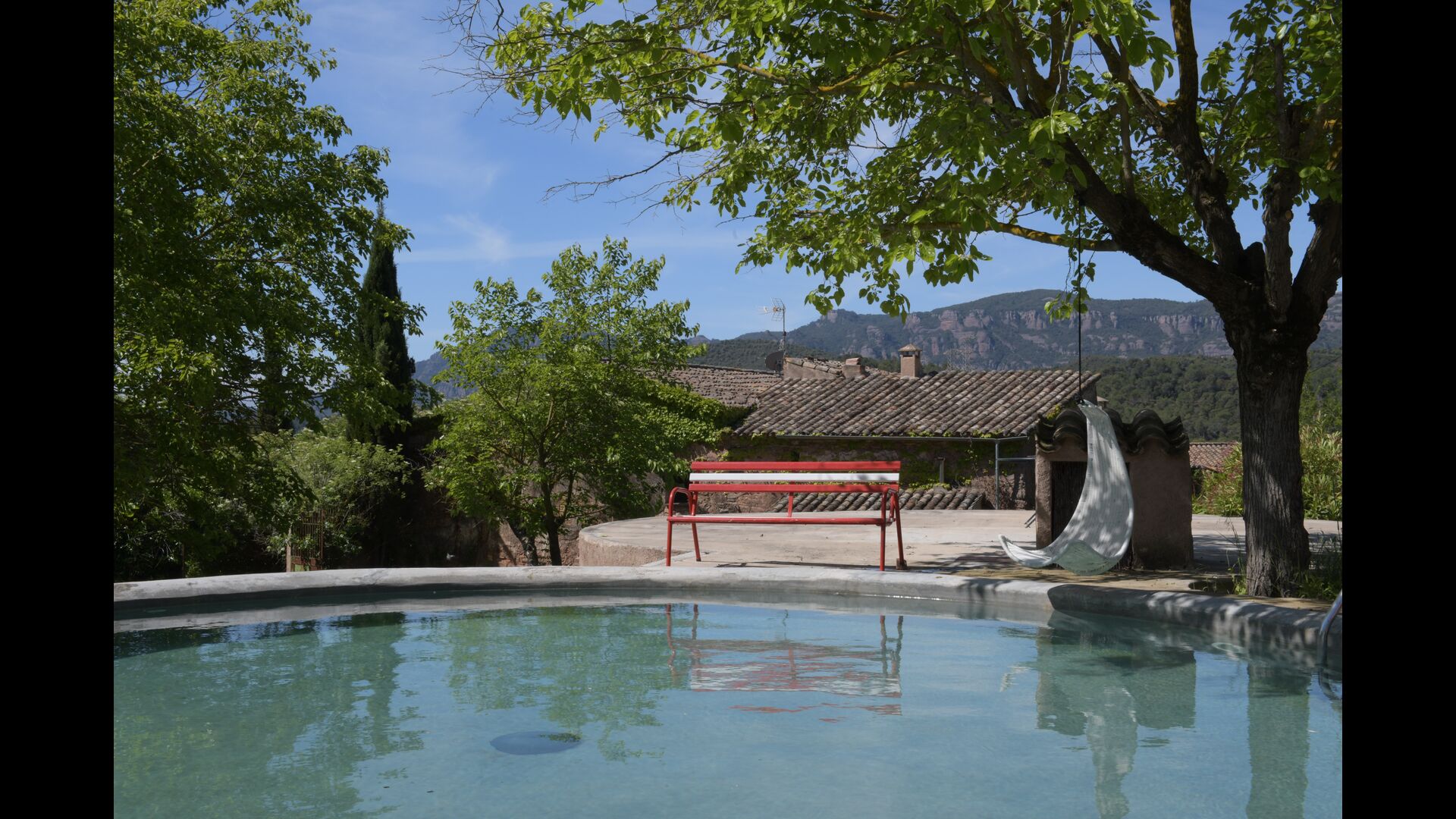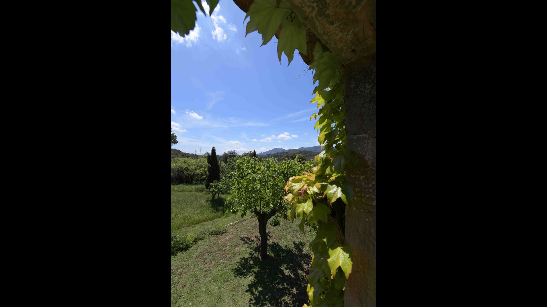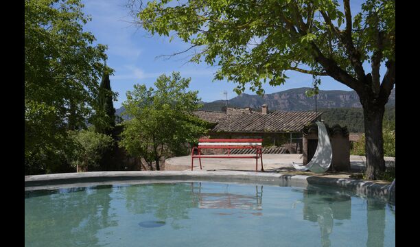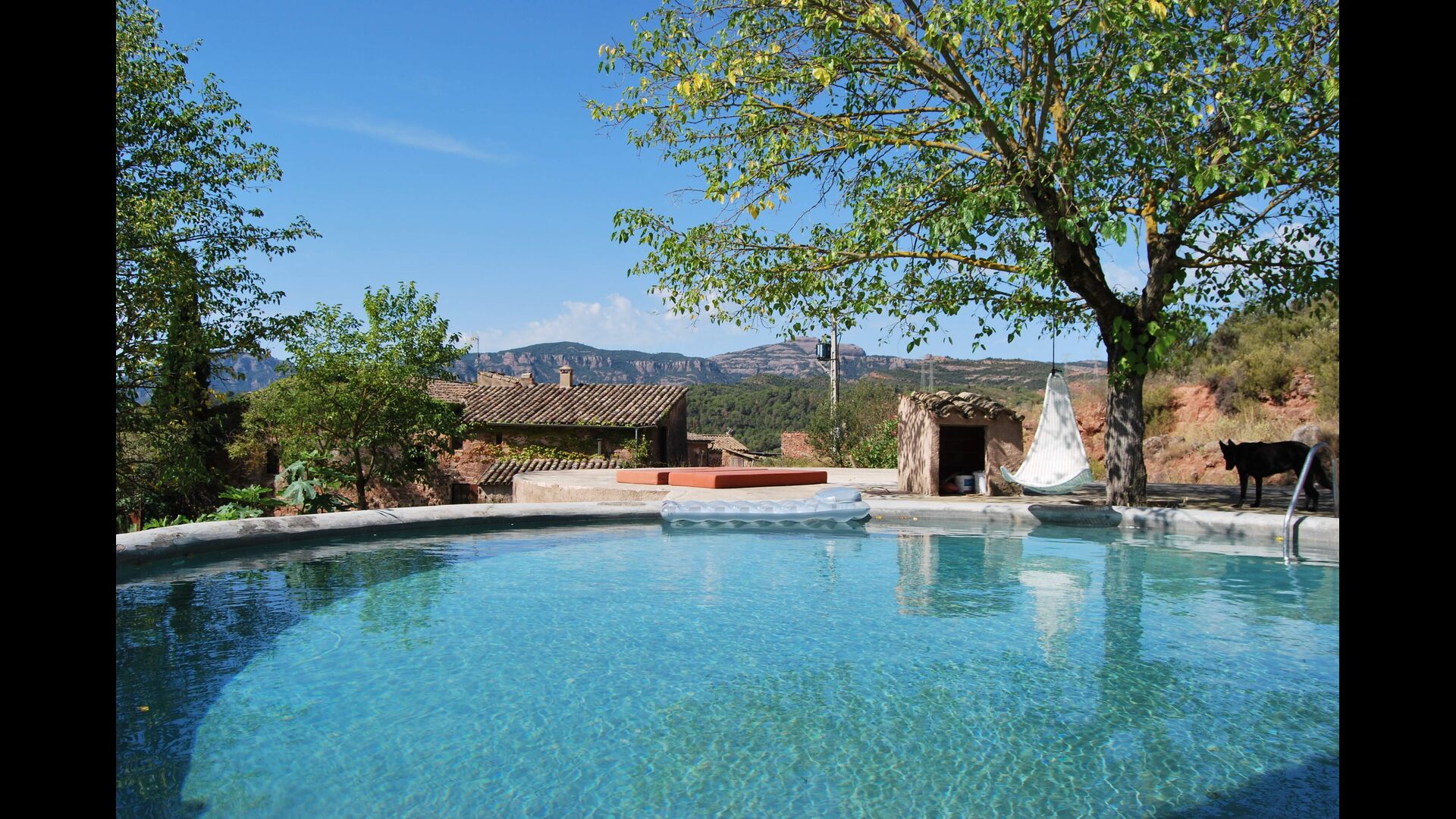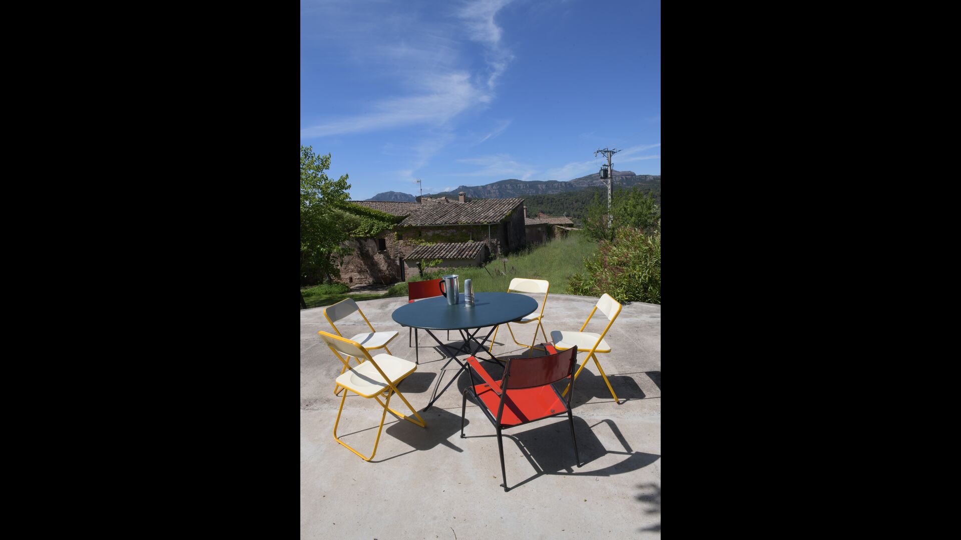 La casa tiene unas zonas exteriores muy amplias. Delante de la casa hay una pequeña arboleda, donde se puede comer con vistas, y debajo un estanque protegido con una discreta valla, que Marc pretende limpiar, para que los niños más pequeños puedan jugar allí. La vista es montañas hasta donde alcanza la vista.