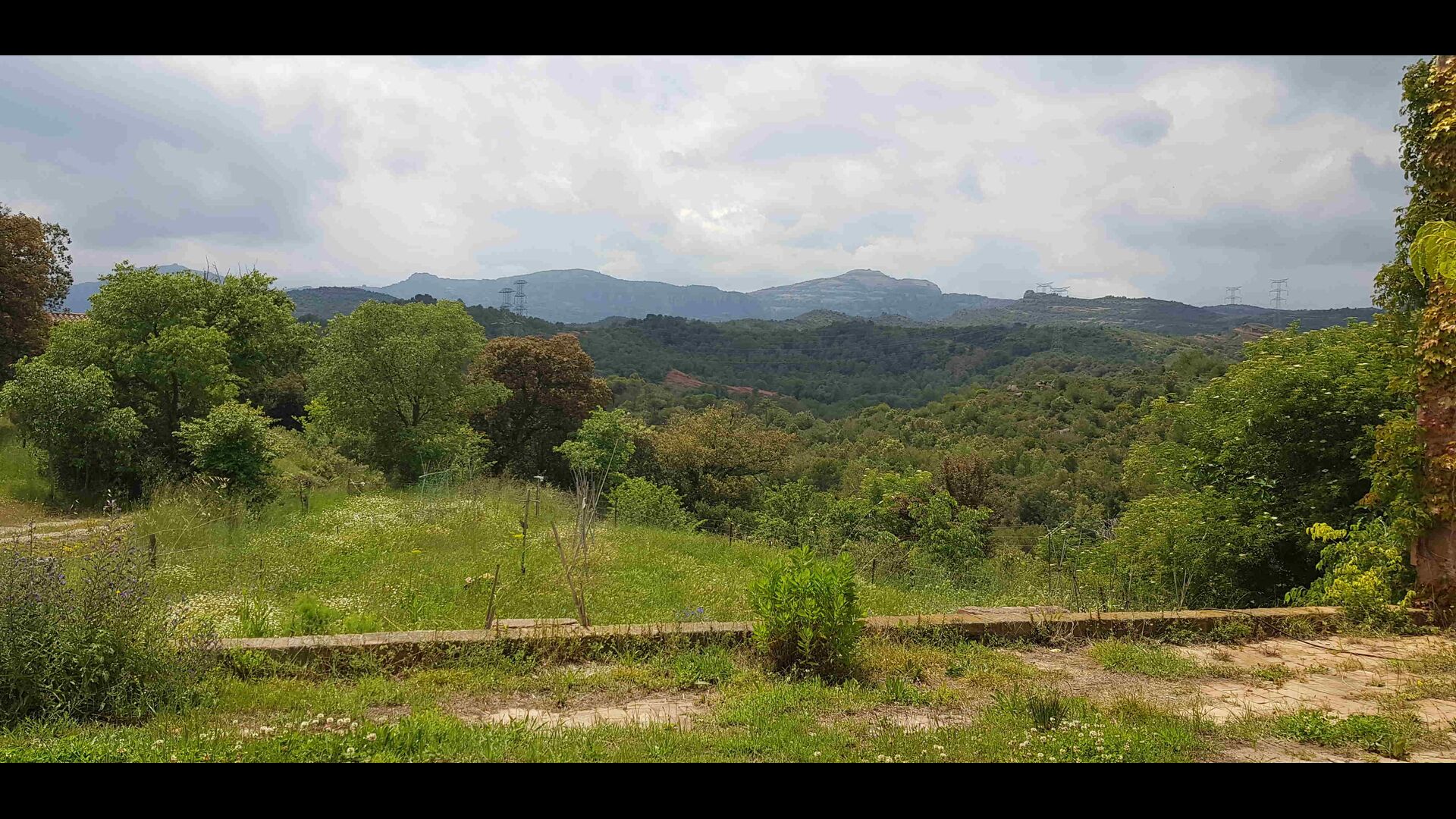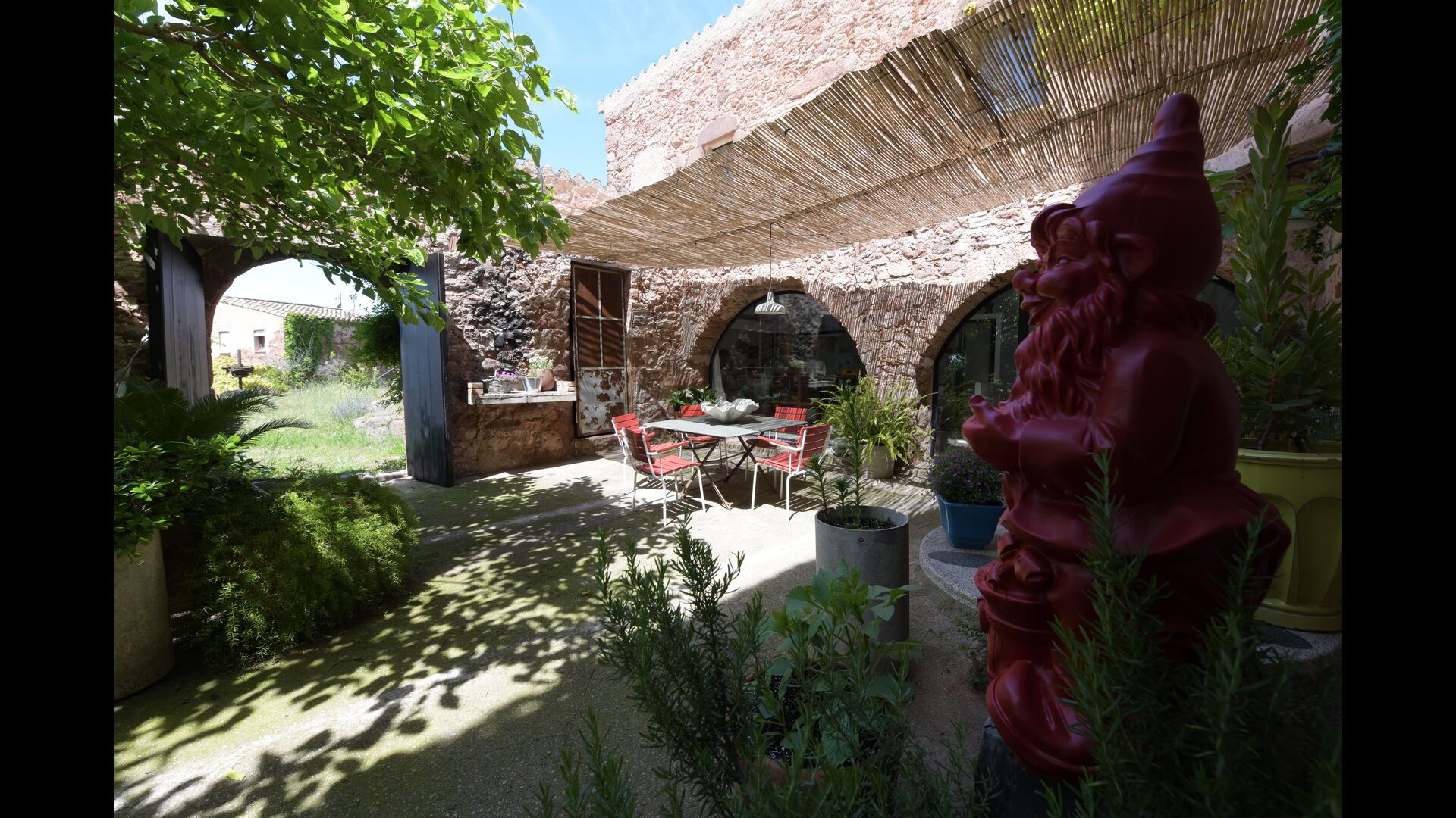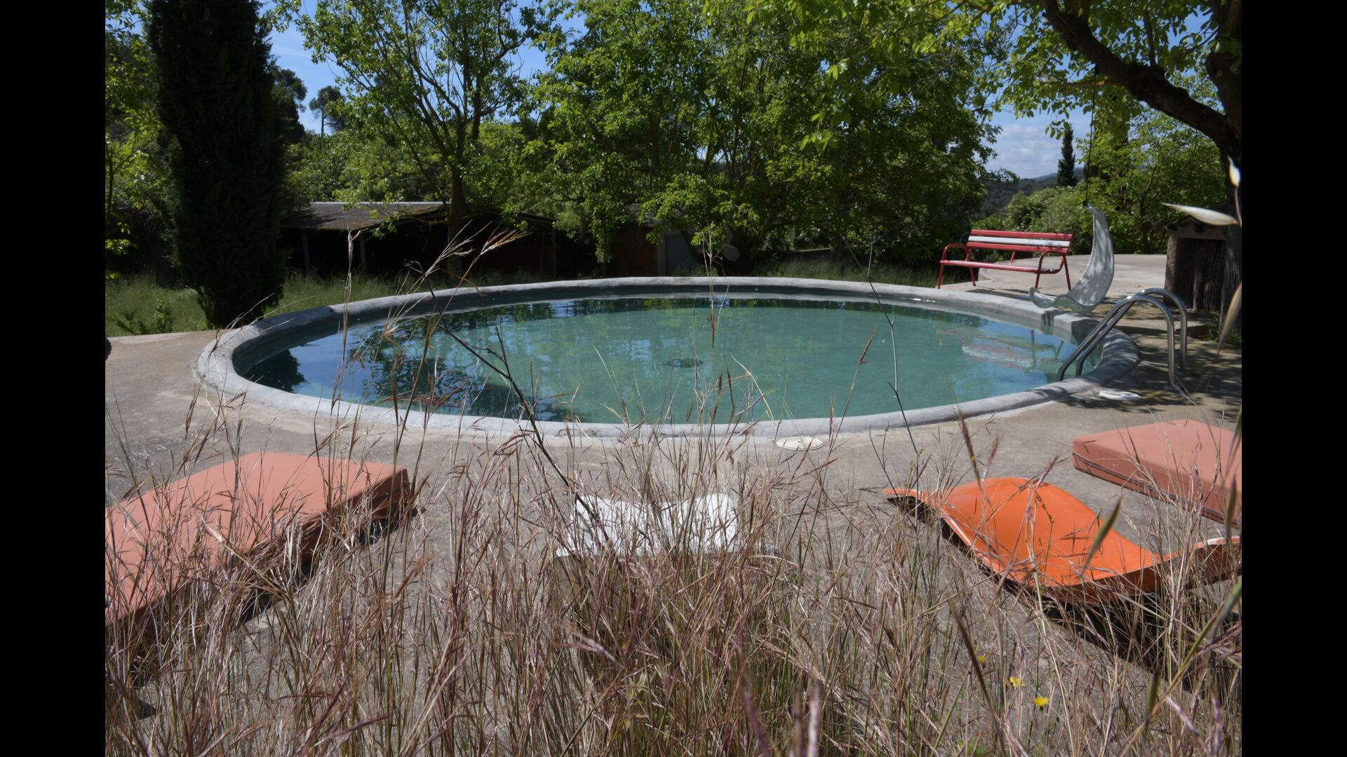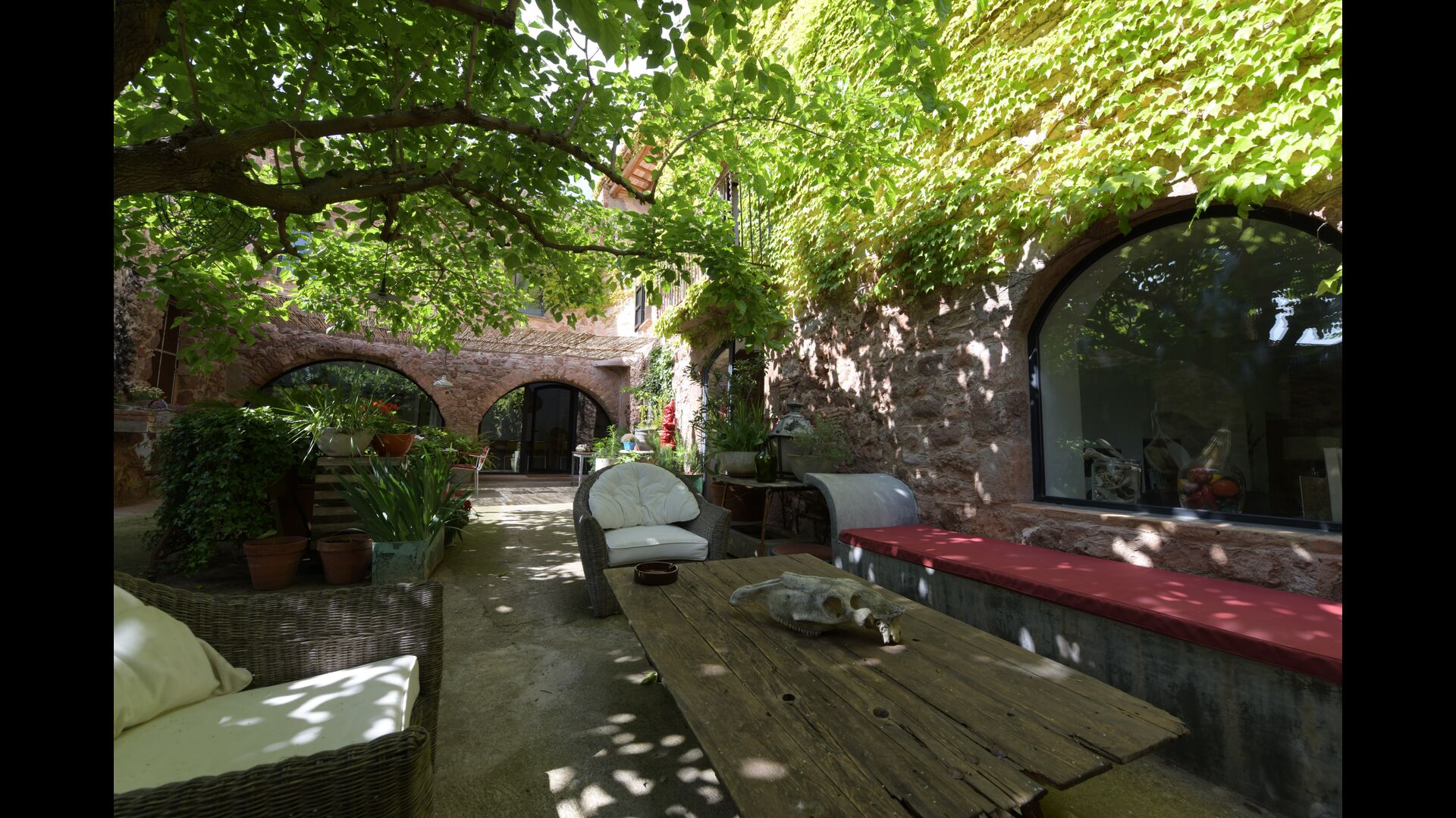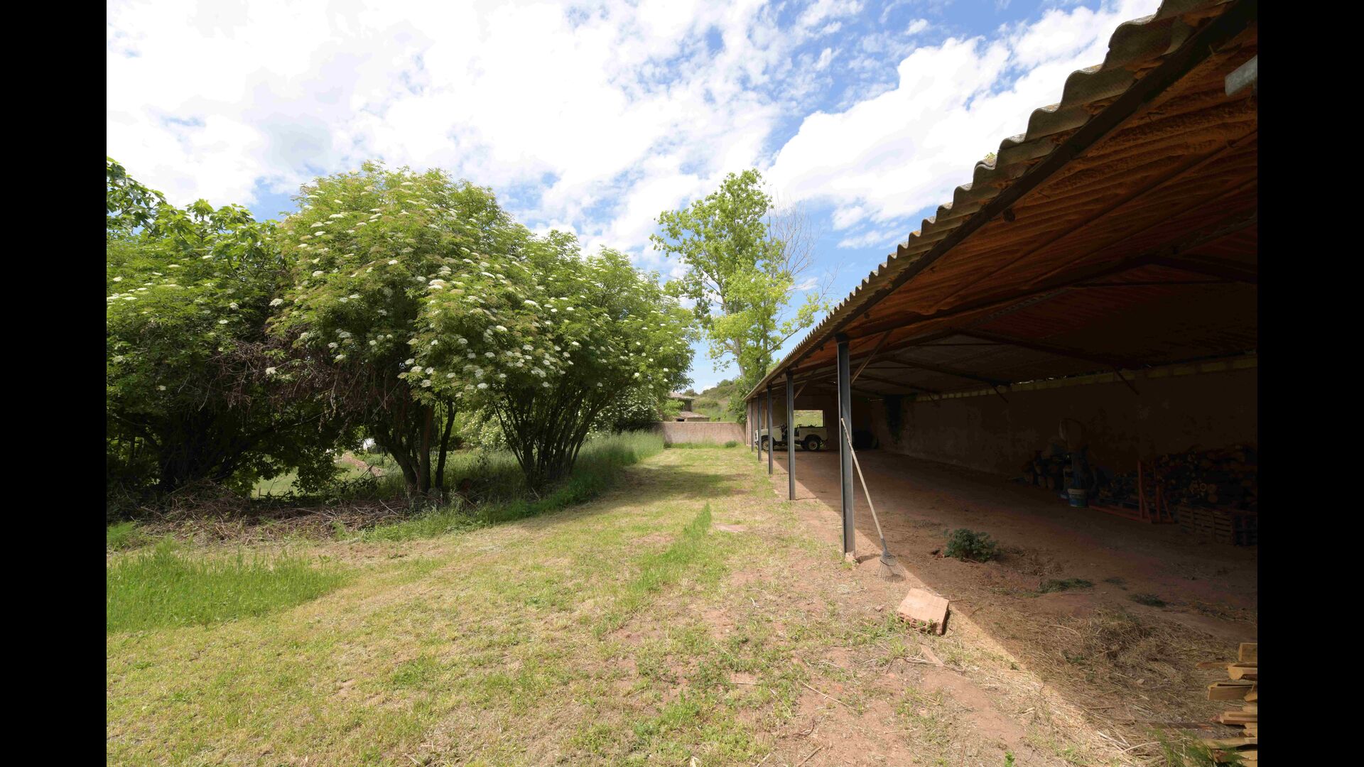 La casa tiene unas zonas exteriores muy amplias. Delante de la casa hay una pequeña arboleda, donde se puede comer con vistas, y debajo un estanque protegido con una discreta valla, que Marc pretende limpiar, para que los niños más pequeños puedan jugar allí. La vista es montañas hasta donde alcanza la vista.