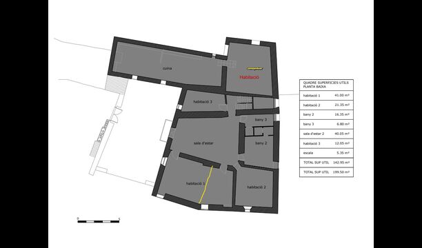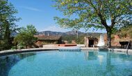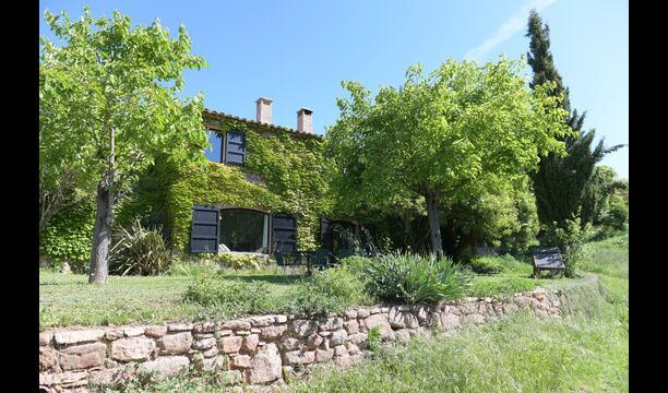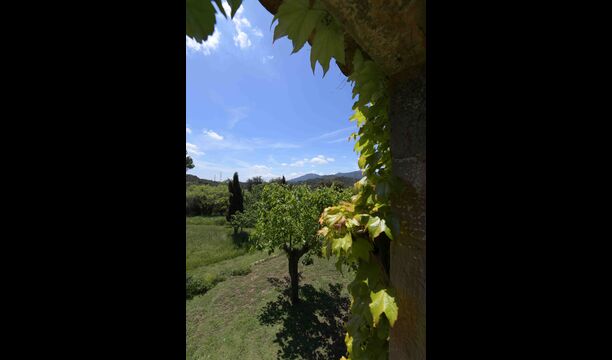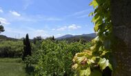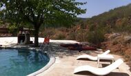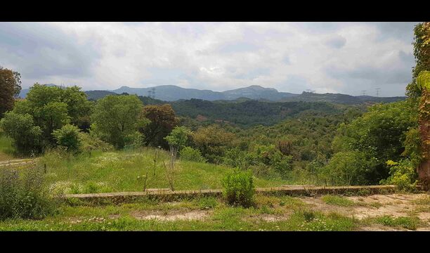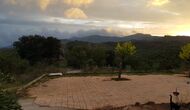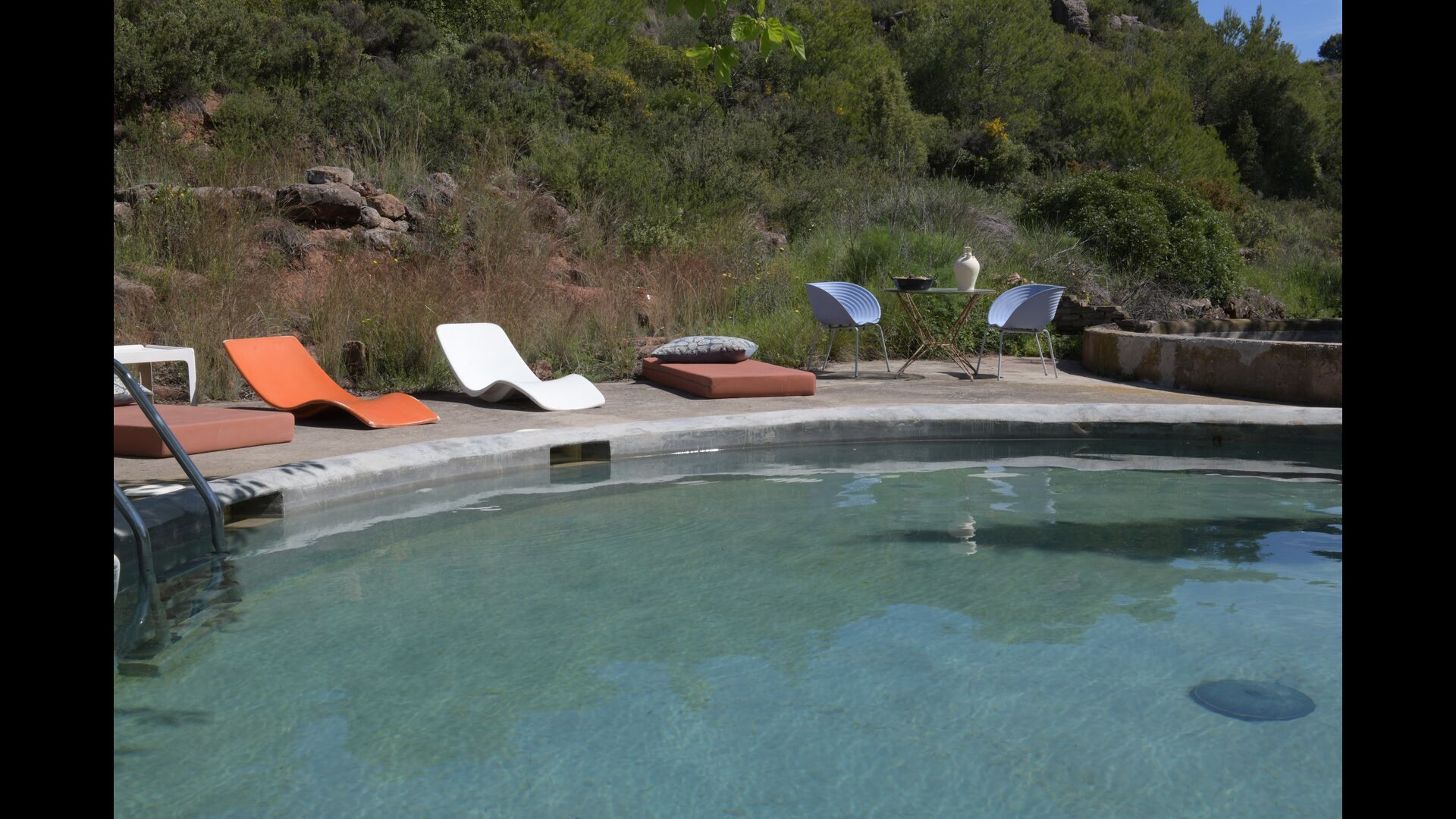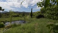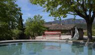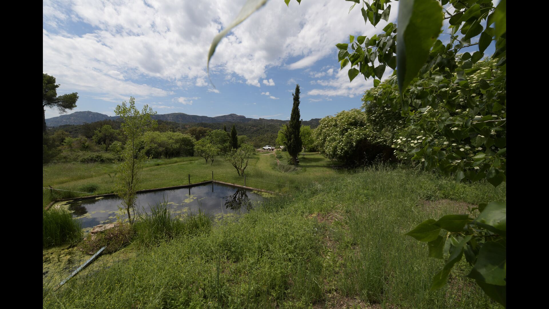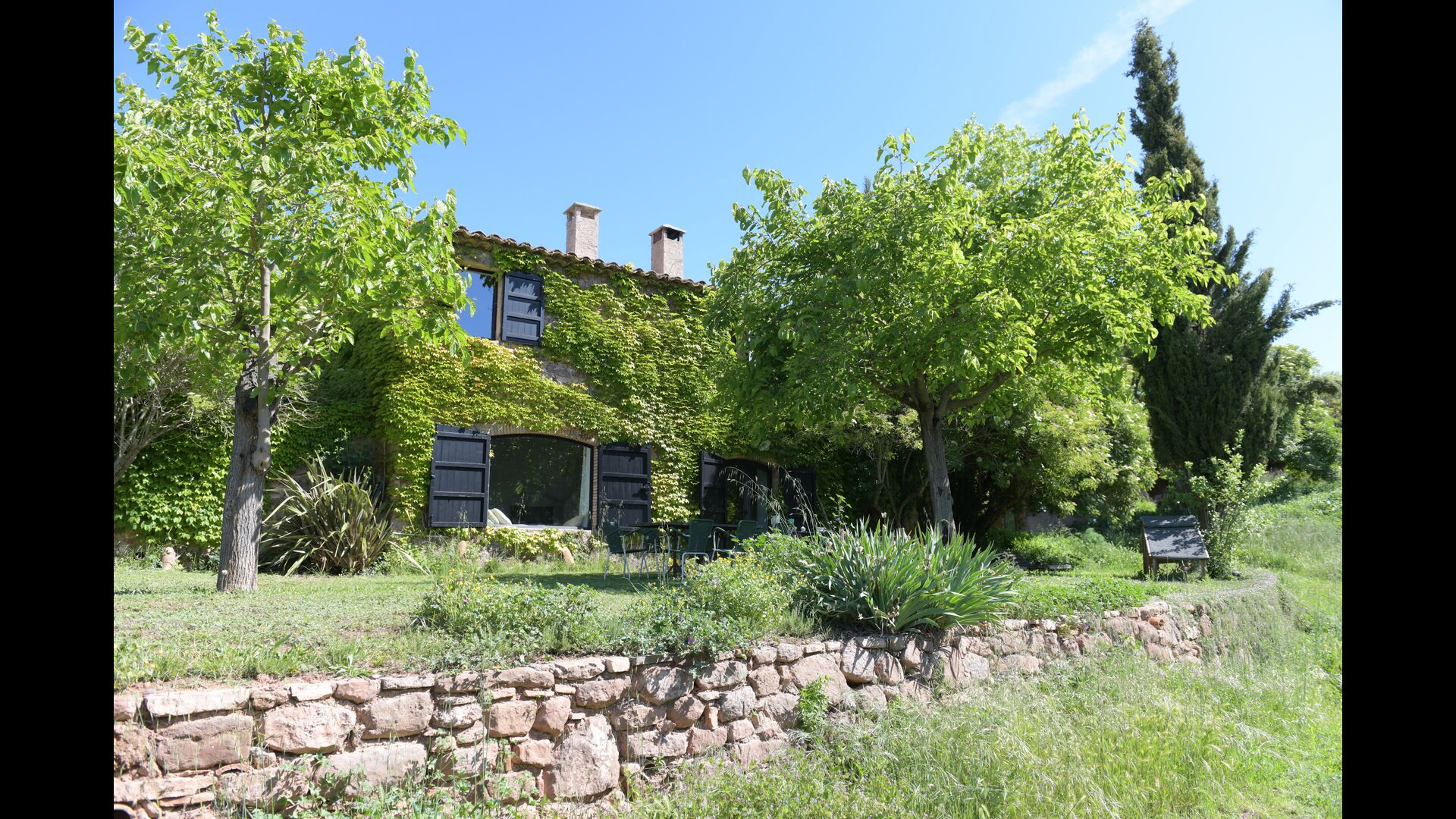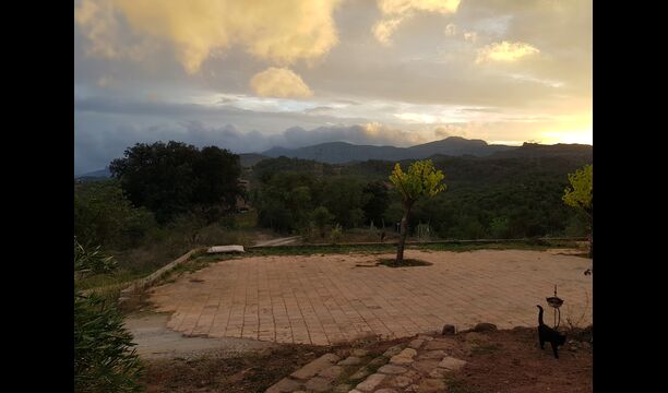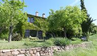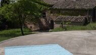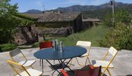 La casa tiene unas zonas exteriores muy amplias. Delante de la casa hay una pequeña arboleda, donde se puede comer con vistas, y debajo un estanque protegido con una discreta valla, que Marc pretende limpiar, para que los niños más pequeños puedan jugar allí. La vista es montañas hasta donde alcanza la vista.