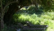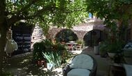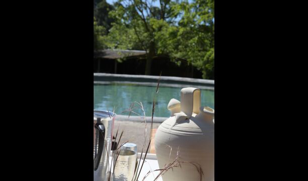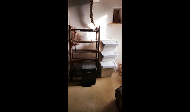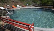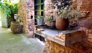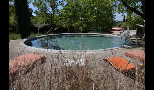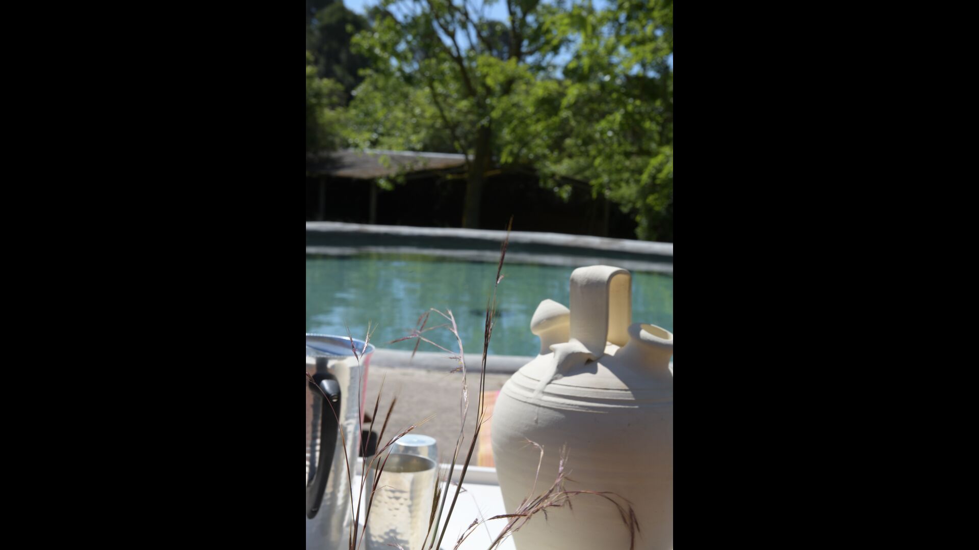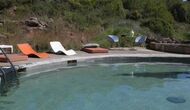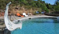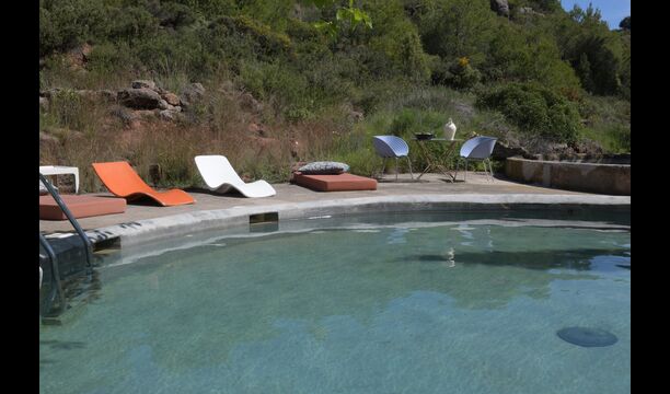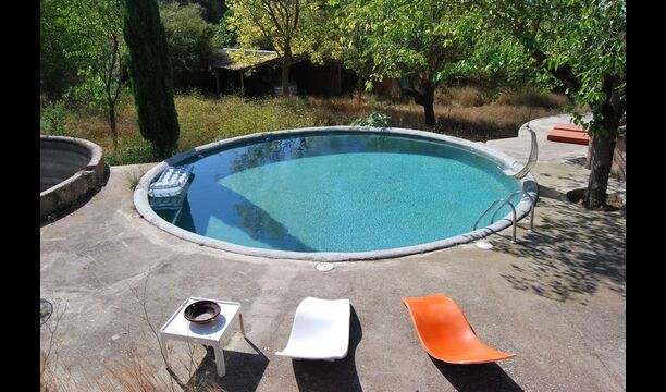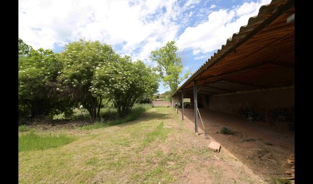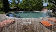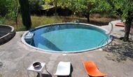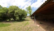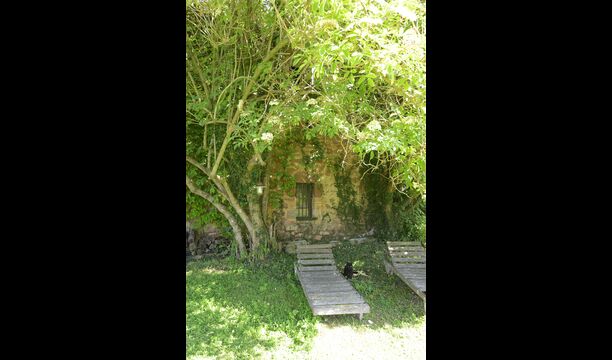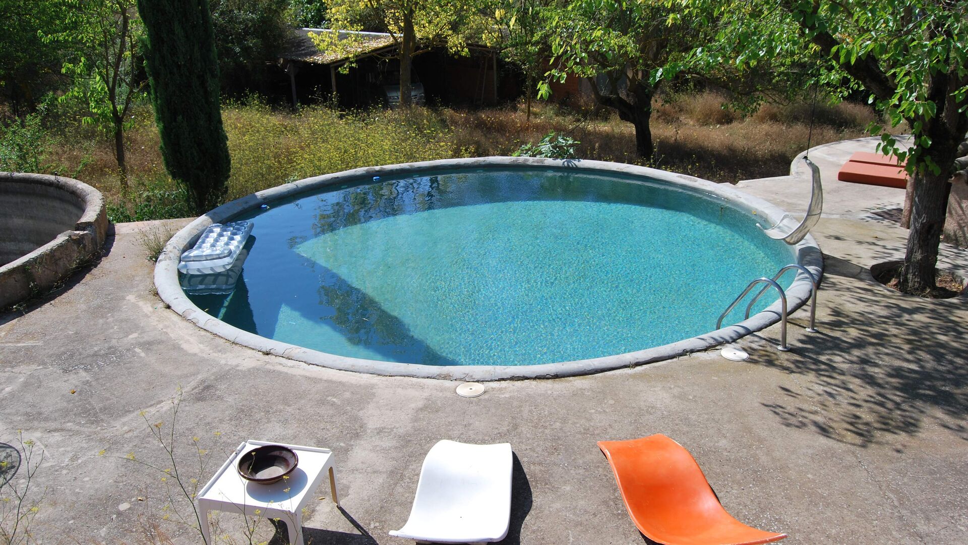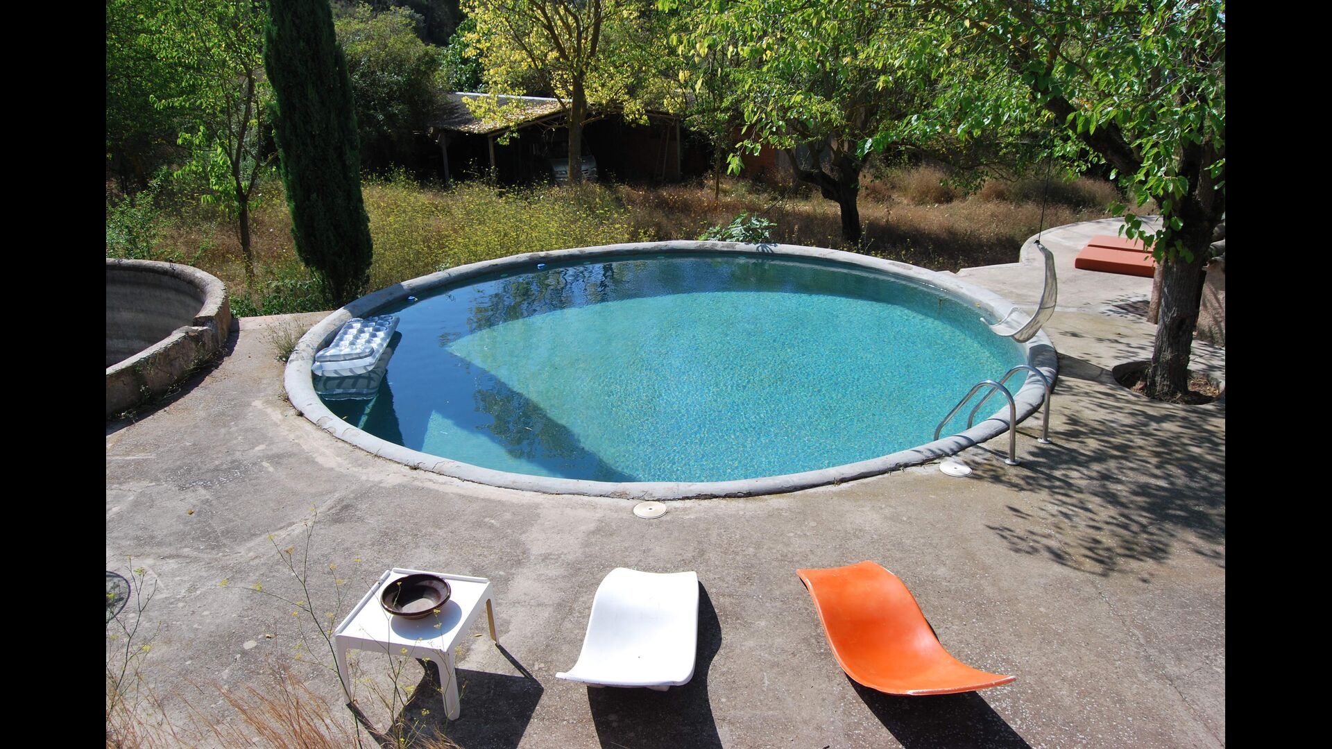 Al otro lado de la casa, hay algunos edificios de almacenamiento, y un nivel más arriba están las dos antiguas piscinas de agua de lluvia, una de las cuales ha sido limpiada y funciona como piscina. Por tanto, es redonda y mide aproximadamente 7 x 7 metros. Una valla con puerta impide entrar a los niños dentro del perímetro.