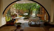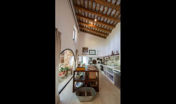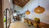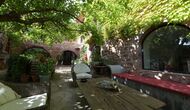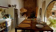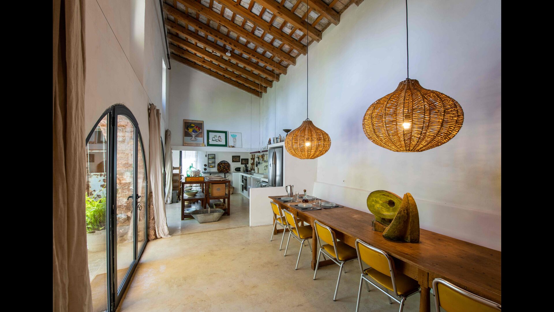 La zona de la cocina es la más francesa. El enorme jardín del patio con sol y sombra da sensaciones francesas con hermosas mesas de café en estilo adoquinado. La cocina tiene ventanas abovedadas que dan al patio, y es lo que se asocia con una cocina de campo típica francesa, donde el piso de hormigón pulido y la decoración rústica son de buen gusto. Además, hay un área enorme con una altura casi infinita hasta el hermoso techo, la gran y hermosa mesa larga es el punto de encuentro natural para las comidas.