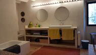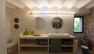 El recibidor también da acceso a un baño rústico muy grande con un ”espejo Hollywood” como uno de los detalles más curiosos. Desde aquí, hay unos escalones hasta una habitación, que actualmente es una sala de estar adicional, pero que se convertirá en una suite con cama doble y rincón con sofá. El baño tiene una hermosa vista a través de los grandes ventanales panorámicos.
