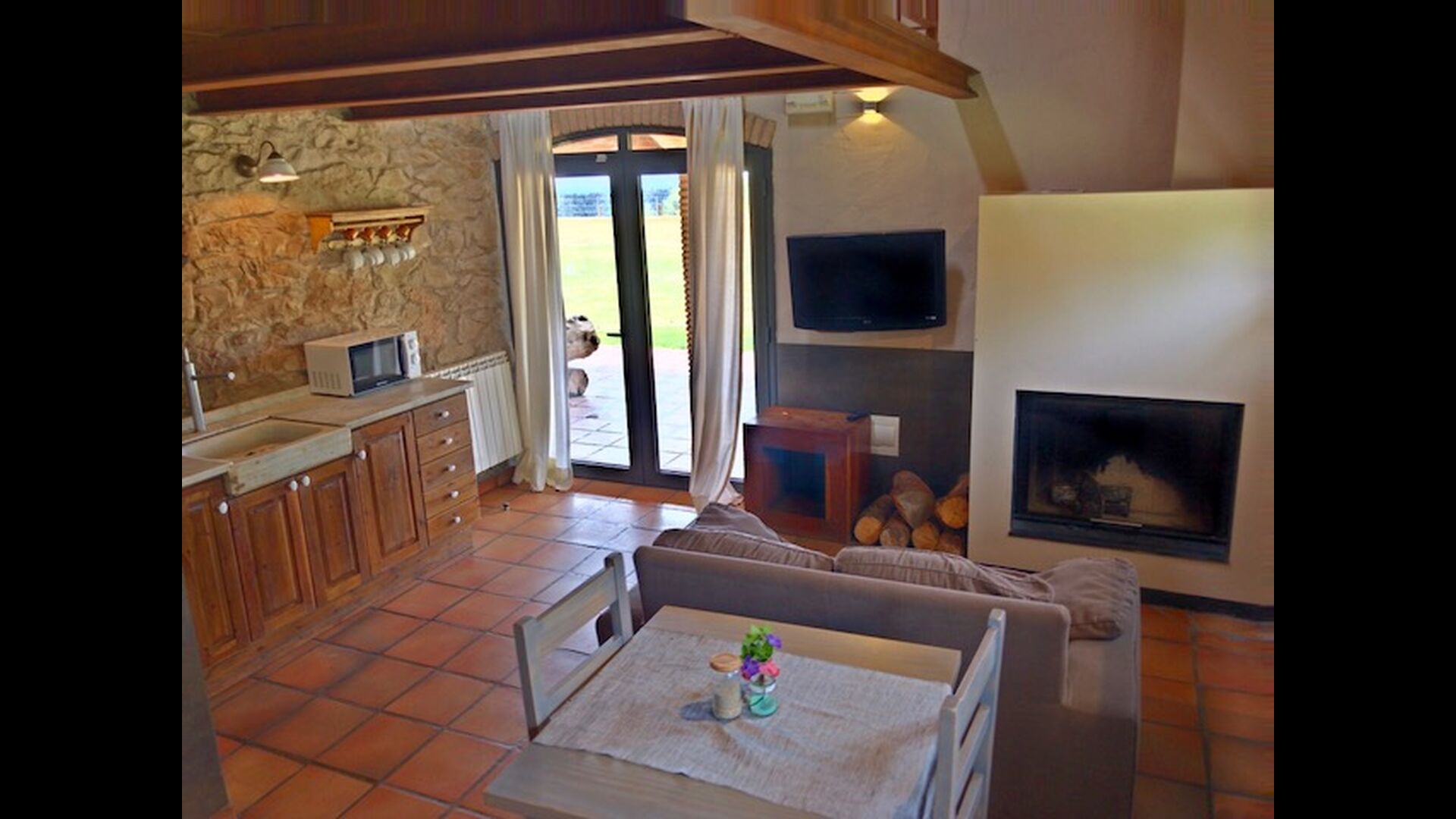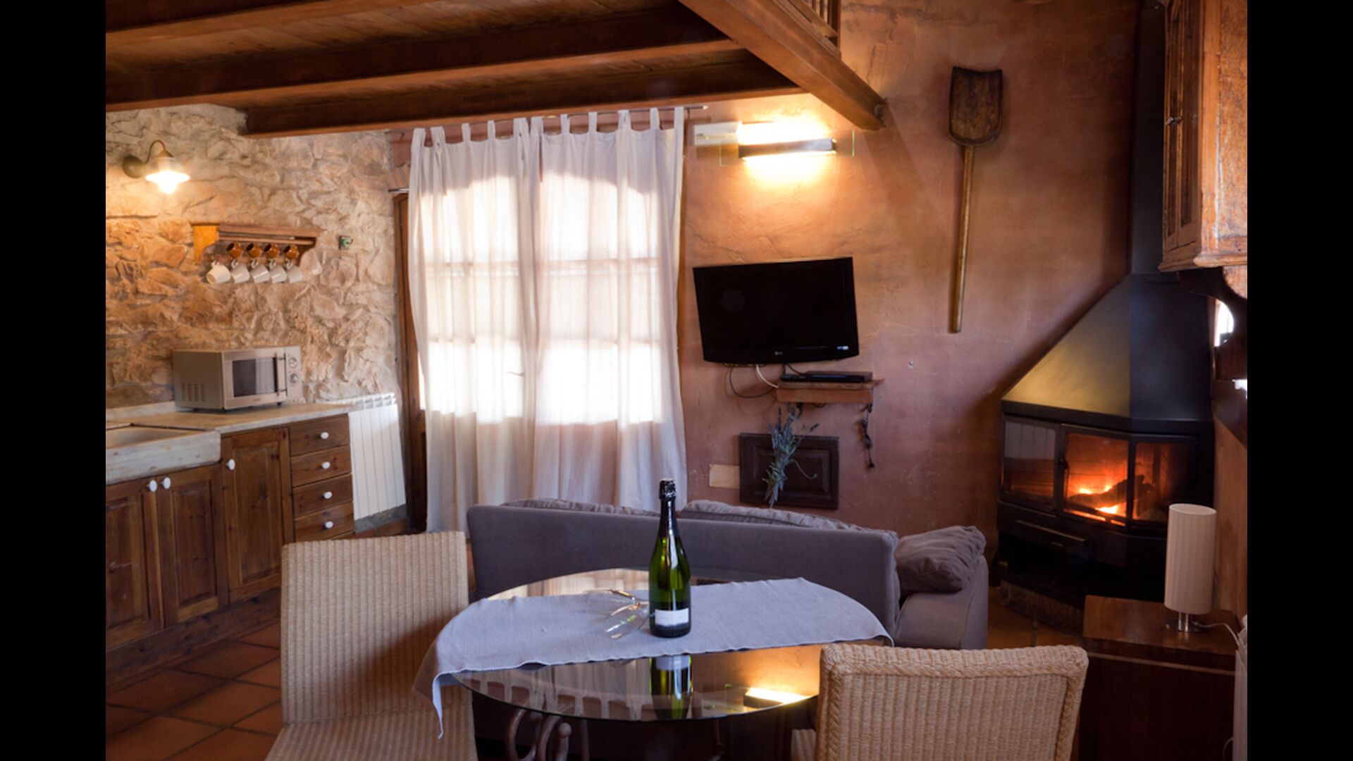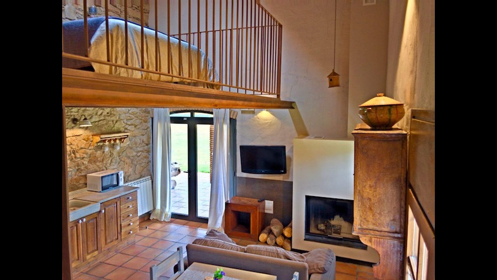 En este apartamento, Piso Nio, hay espacio para dos personas. Hay una cama doble, que es una base perfecta para una pareja. También hay un baño moderno. El piso tiene un tamaño de 60 m2. En general está organizado muy auténtico y tradicional en un estilo catalán. También está claro que existe un gran respeto por los materiales y estructuras originales. Esto proporcionará, junto con la fantástica ubicación de la casa, un ambiente bueno y romántico. Además, hay una bonita cocina donde los propietarios han hecho mucho para mantenerla tradicional catalana. En esto hay una nevera, una estufa, un lavavajillas y una lavadora. En la misma habitación hay un sofá suave, donde puedes ver televisión y hay una chimenea. Arriba hay un amplio dormitorio con una bonita cama doble. En el exterior hay una terraza al lado del apartamento de al lado. Aquí puedes leer un libro o simplemente relajarte a la sombra si hace demasiado calor. Sin embargo, lo mejor del apartamento son casi las impresionantes vistas que se pueden disfrutar. Hay una calma y paz muy especial que es única en las casas en las montañas.