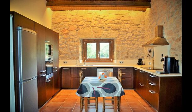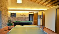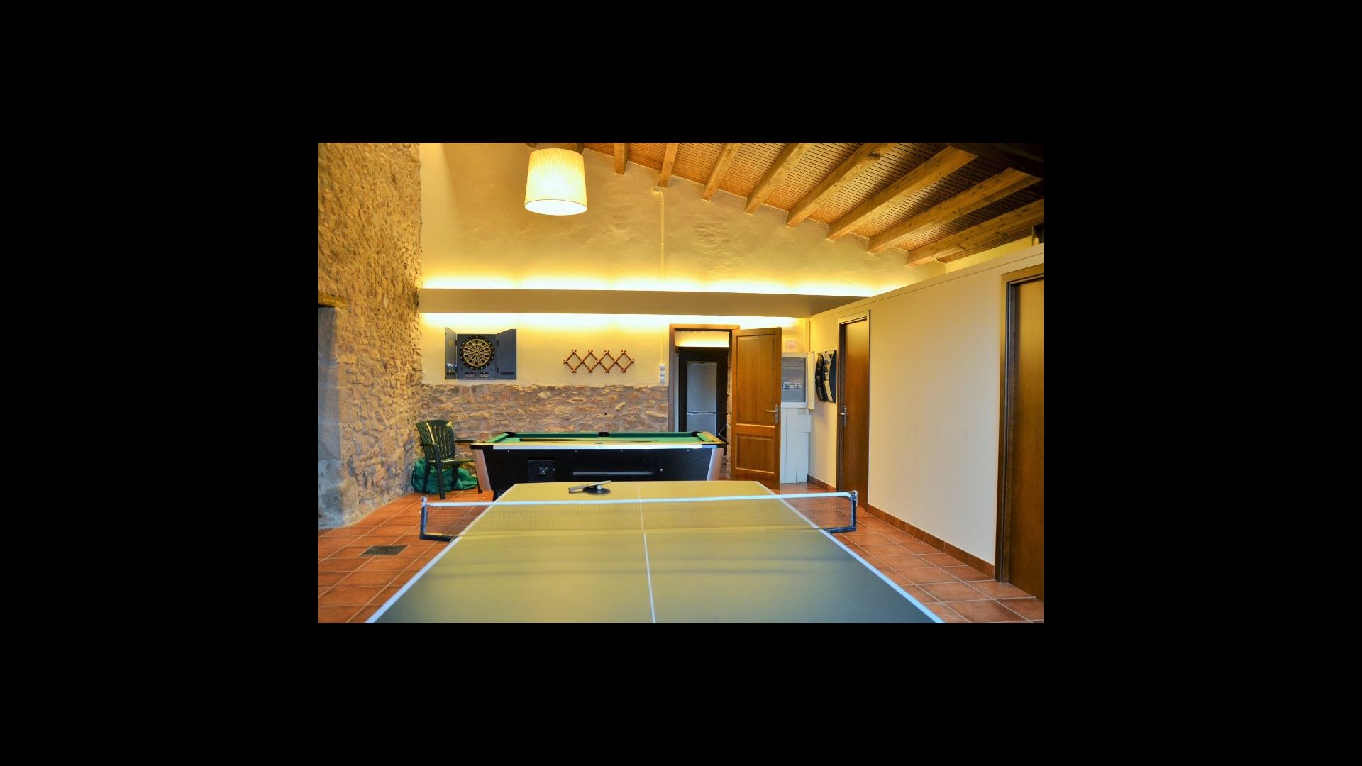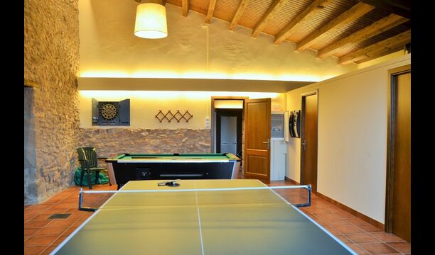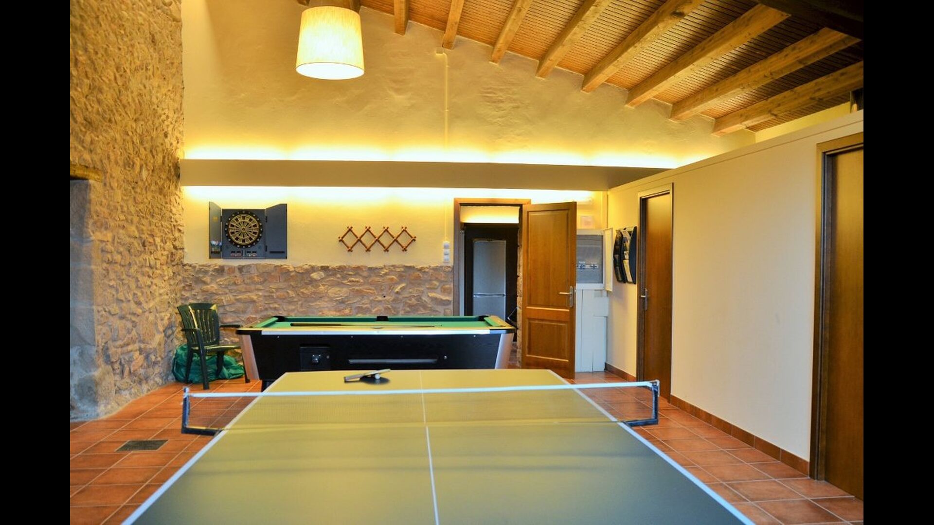 En la planta baja de la casa, ingresas a un hermoso salón. A la izquierda de la sala se encuentra la moderna cocina con congelador, horno, microondas, vitrocerámica, lavavajillas, cafetera e incluso una maquina para enfriar la cerveza de barril (Heineken) . La cocina tiene acceso directo a la gran sala común que tiene una hermosa mesa de refectorio catalán (si desea comer a la sombra durante un día o dos) y una acogedora sala de estar con Smart TV. Desde las puertas correderas de la sala común tiene acceso directo a la terraza empedrada. La barbacoa de la casa está un poco más abajo en el jardín. Si giras a la derecha desde la cocina, te encontrarás con la sala de actividades, que probablemente será el marco de algunas buenas horas, también para los niños del grupo, dónde hay billar, tenis de mesa y dardos.