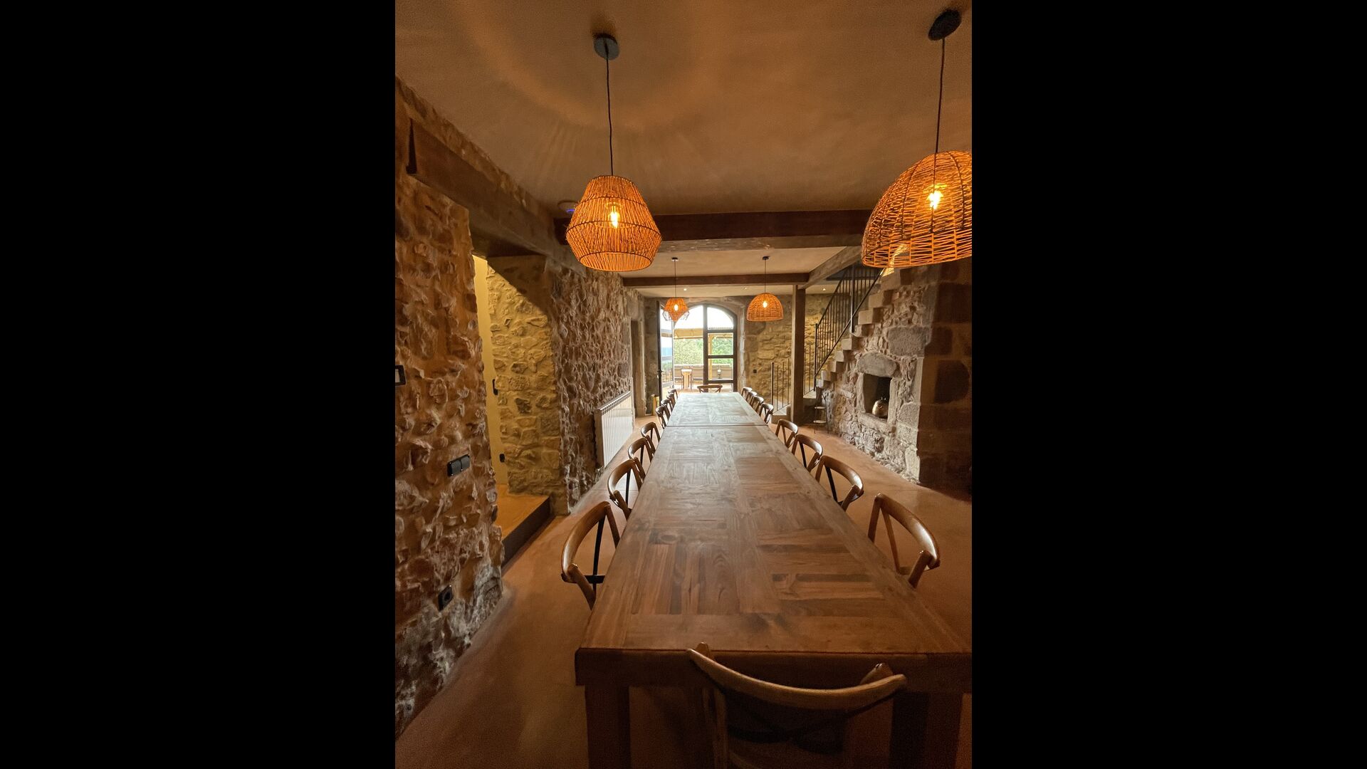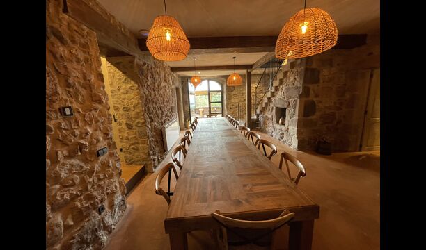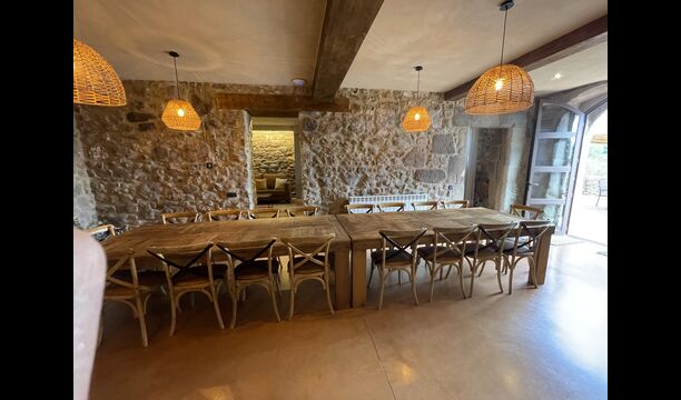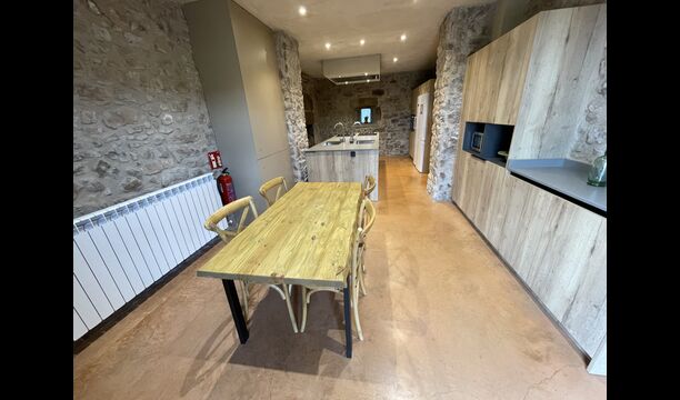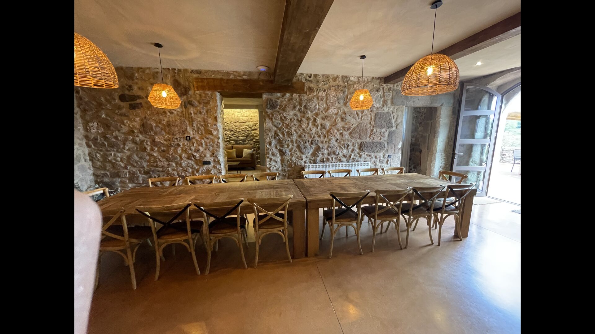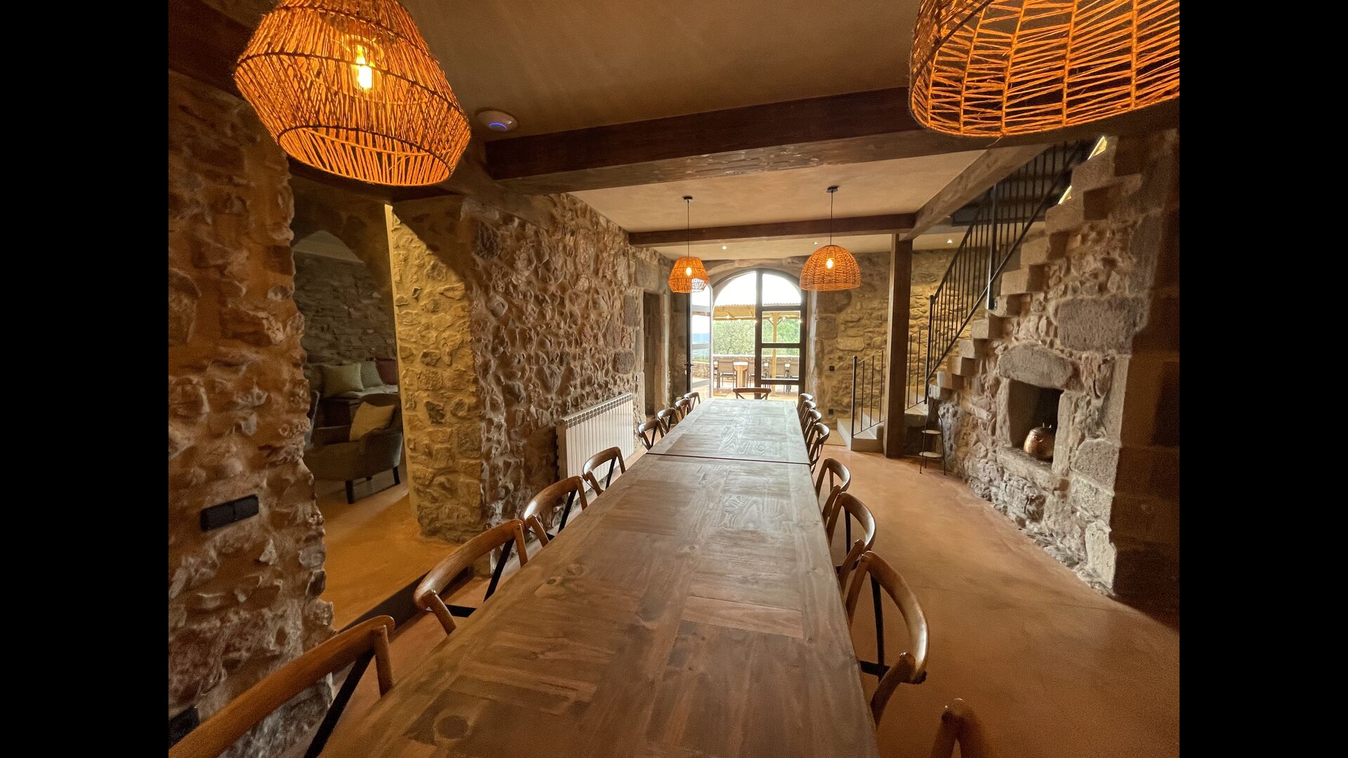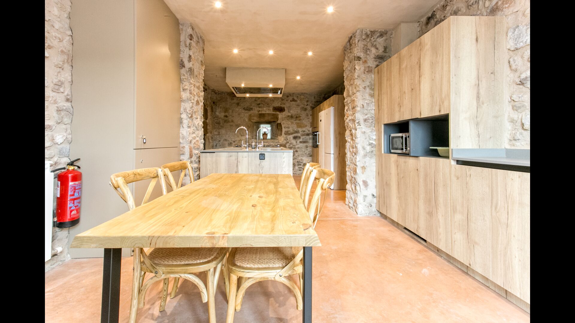 Desde la terraza exterior, con barbacoa, un espacio para comer y tumbonas para relajarse, entramos directamente a gran comedor del Mas. Este actúa como corazón de la casa, y conecta los dos pequeños salones de la planta baja con la gran cocina. Esta está perfectamente equipada con 2 placas de gas, 2 lavavajillas, 2 neveras con congelador, horno, microondas y cafetera, además de una pequeña mesa para desayunar.
