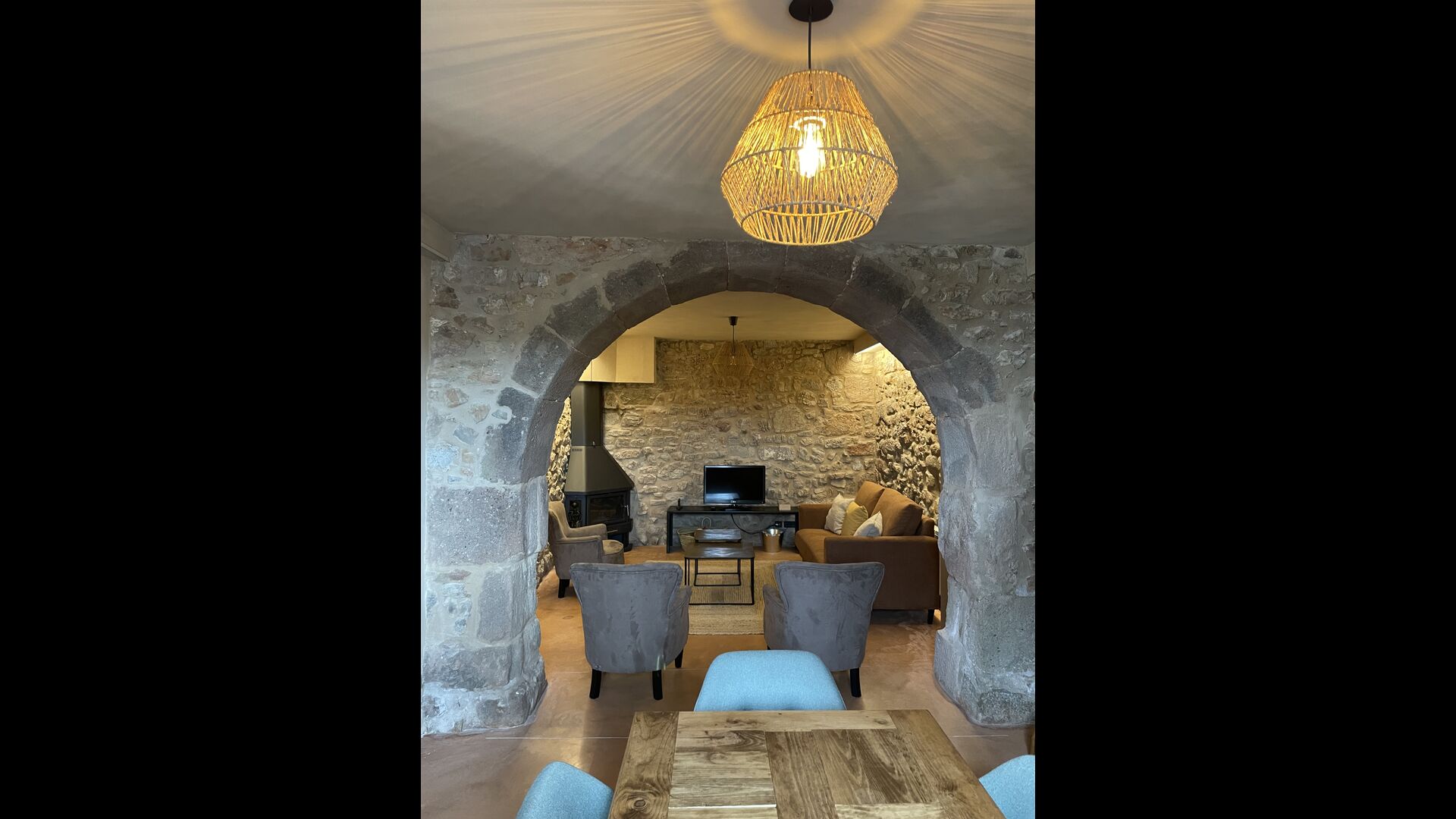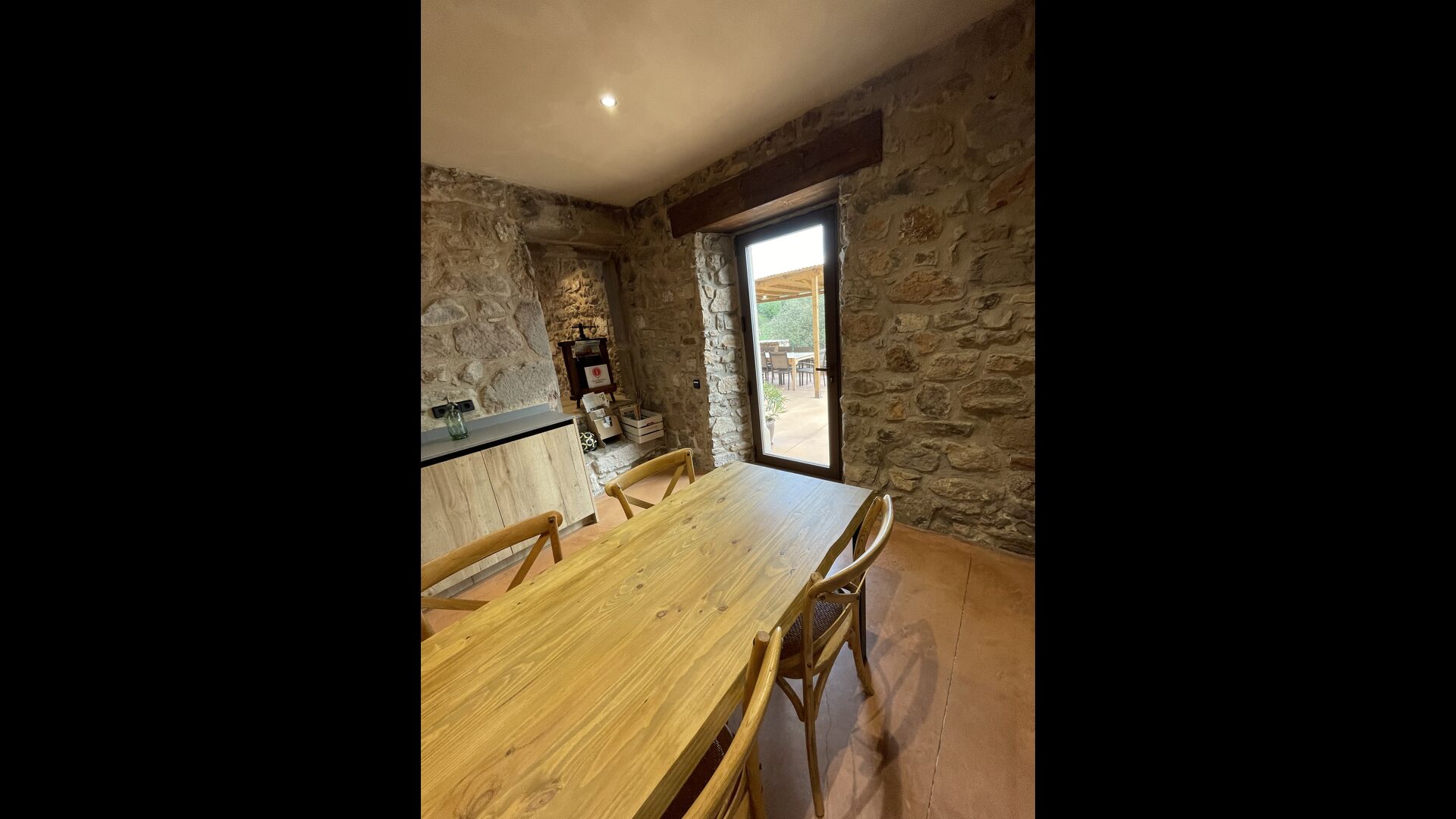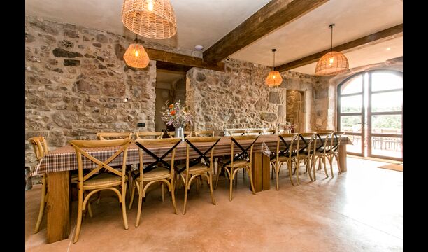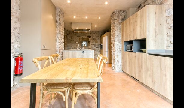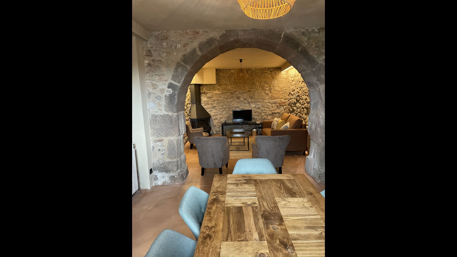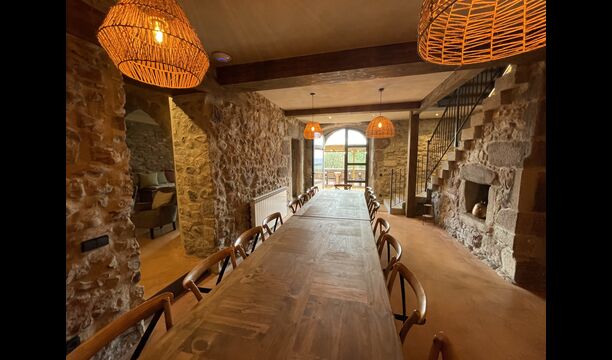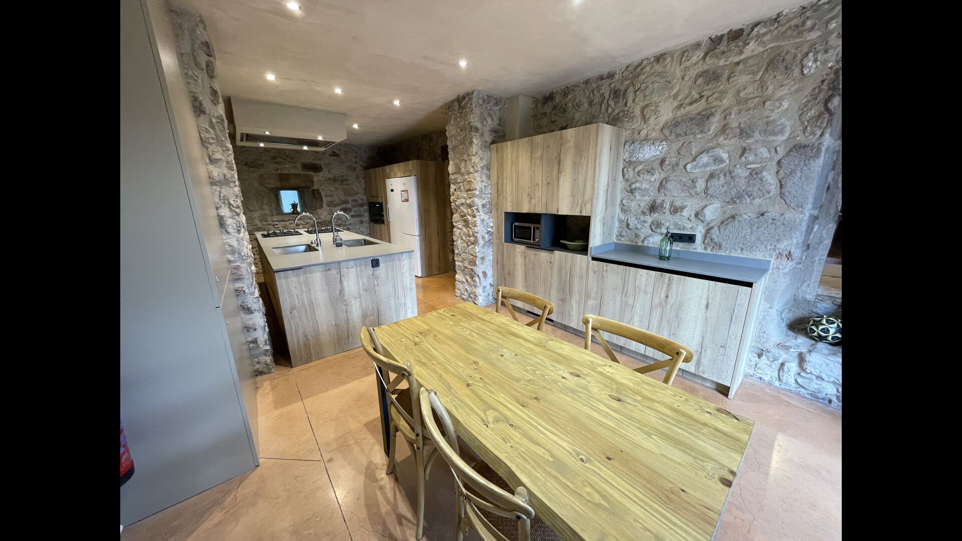 Desde la terraza exterior, con barbacoa, un espacio para comer y tumbonas para relajarse, entramos directamente a gran comedor del Mas. Este actúa como corazón de la casa, y conecta los dos pequeños salones de la planta baja con la gran cocina. Esta está perfectamente equipada con 2 placas de gas, 2 lavavajillas, 2 neveras con congelador, horno, microondas y cafetera, además de una pequeña mesa para desayunar.