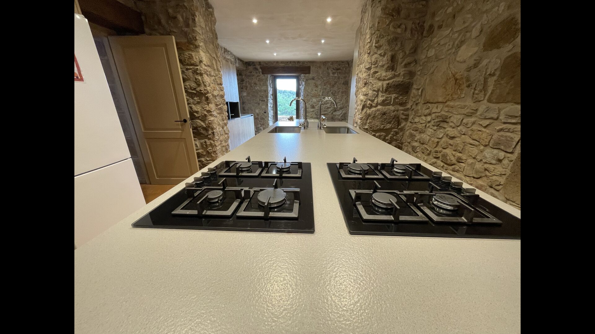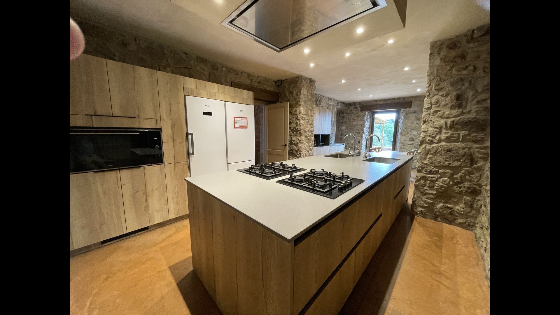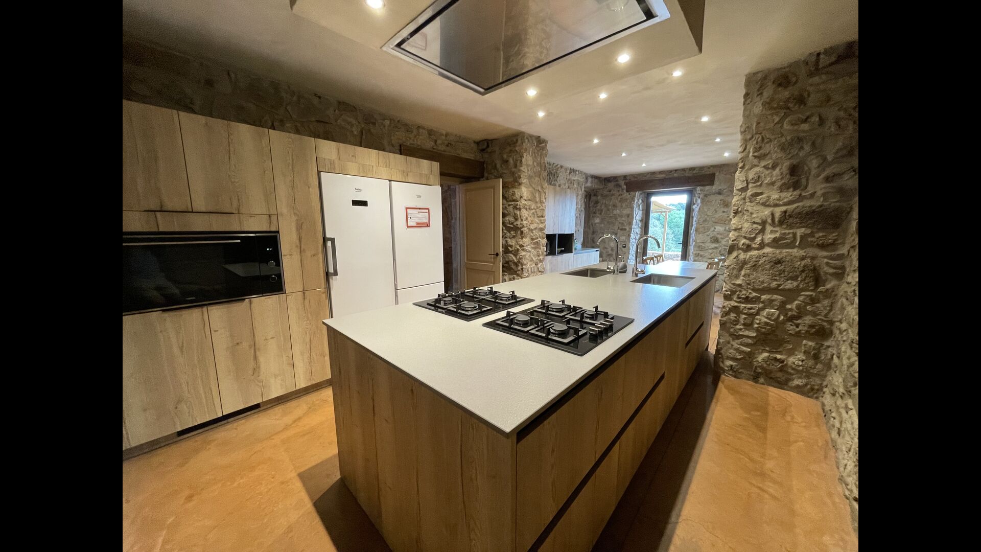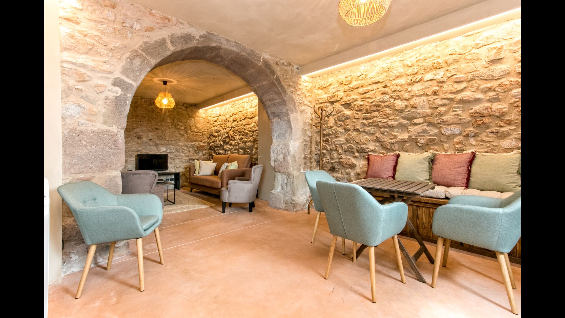 Desde la terraza exterior, con barbacoa, un espacio para comer y tumbonas para relajarse, entramos directamente a gran comedor del Mas. Este actúa como corazón de la casa, y conecta los dos pequeños salones de la planta baja con la gran cocina. Esta está perfectamente equipada con 2 placas de gas, 2 lavavajillas, 2 neveras con congelador, horno, microondas y cafetera, además de una pequeña mesa para desayunar.