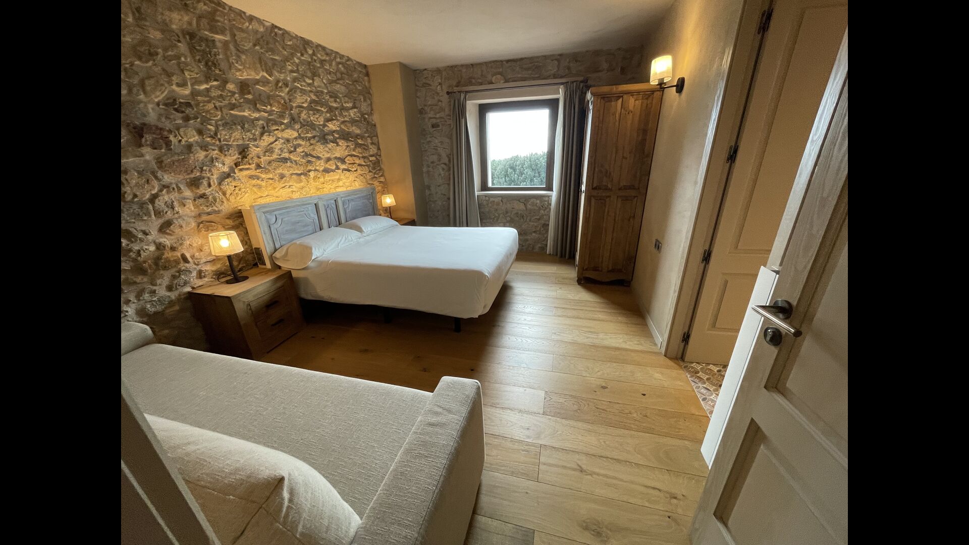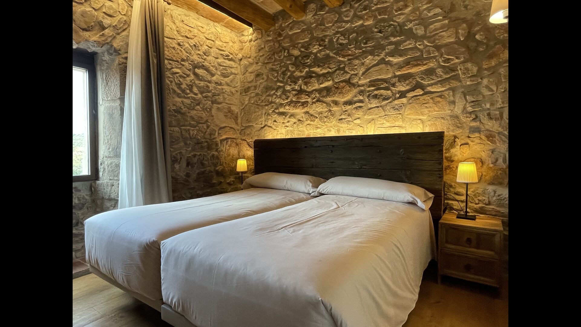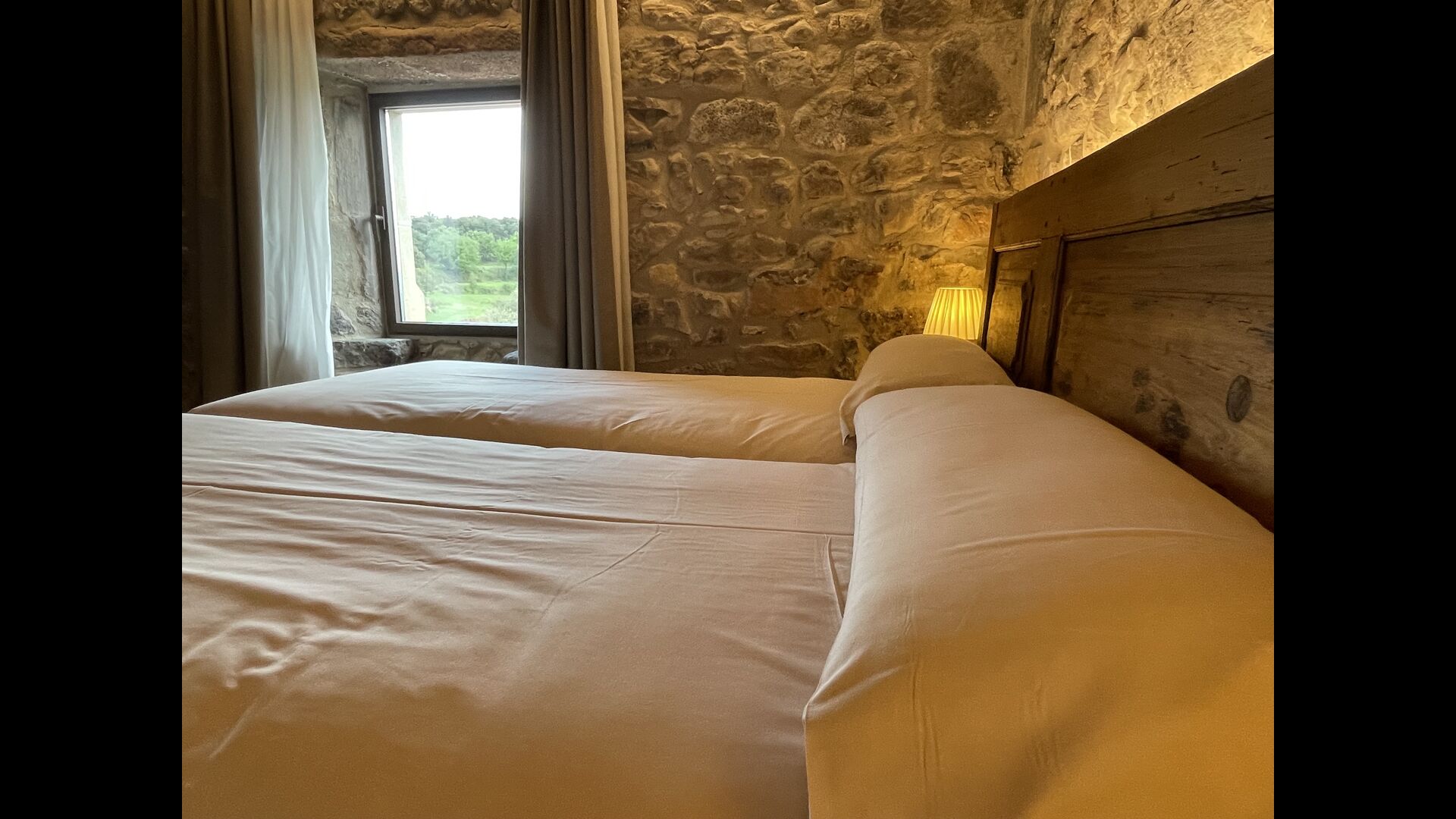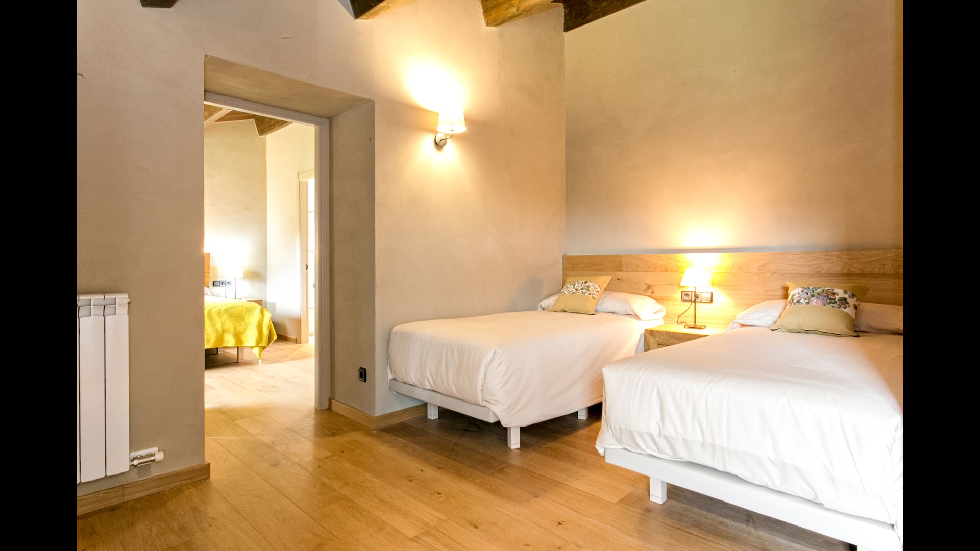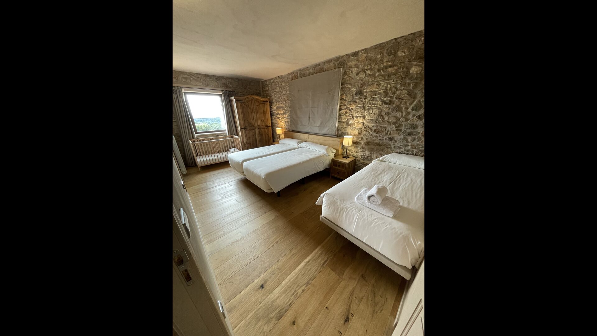 En la primera planta tenemos 6 habitaciones dobles, grandes y con vistas a la naturaleza, todas con baño privado. En la segunda planta encontramos 2 habitaciones dobles más, y 2 habitaciones cuádruples (con dos camas individuales y una cama de matrimonio, separadas por una puerta). Estas también tienen todas ventanas exteriores y baño completo privado.