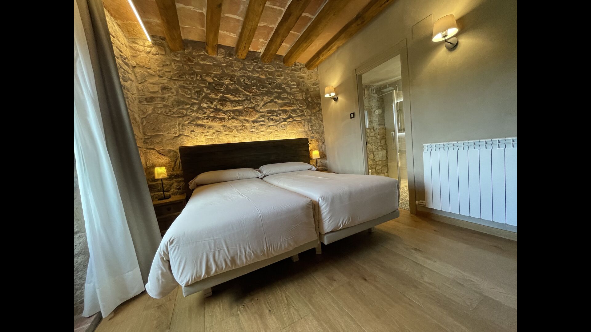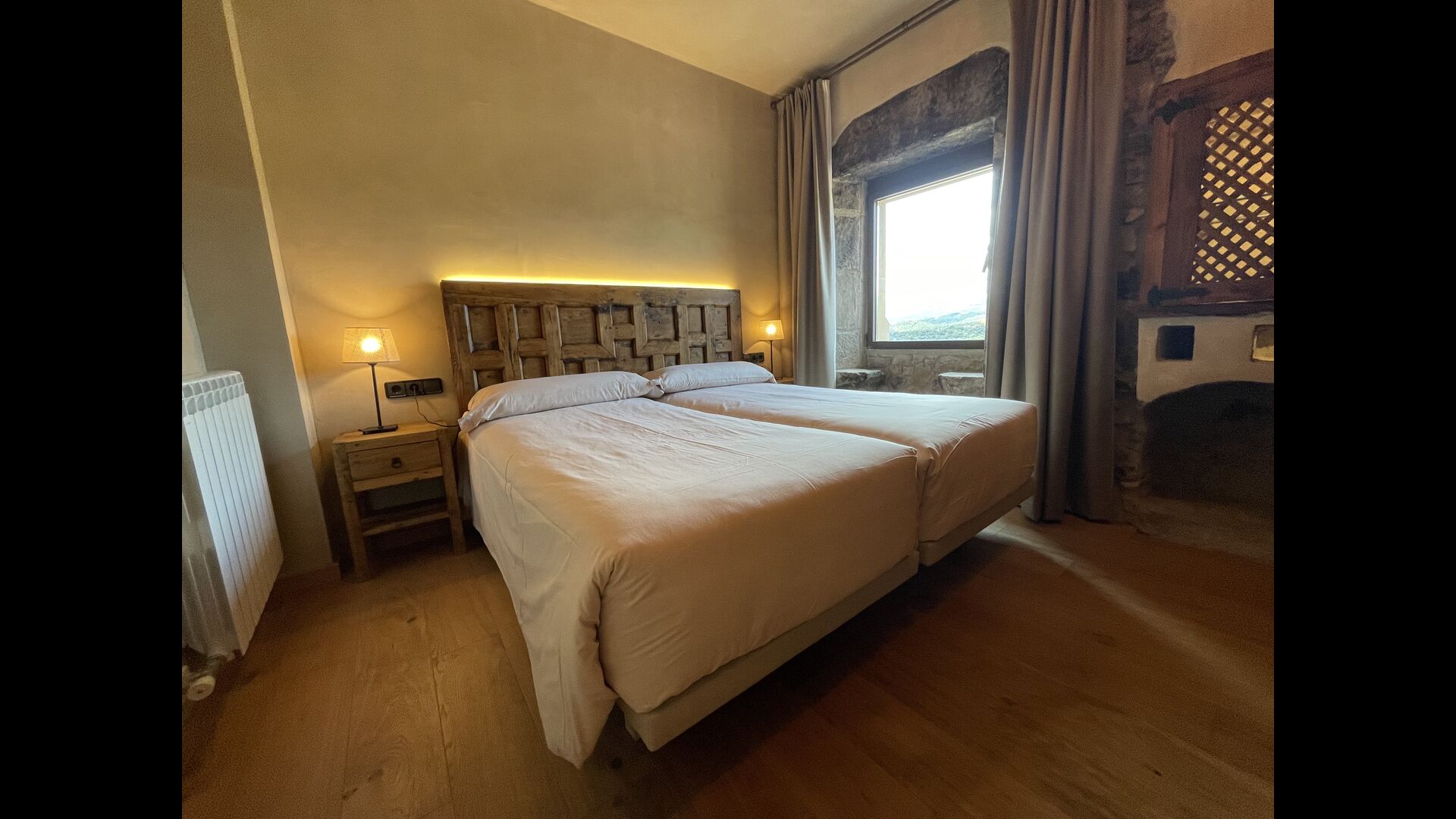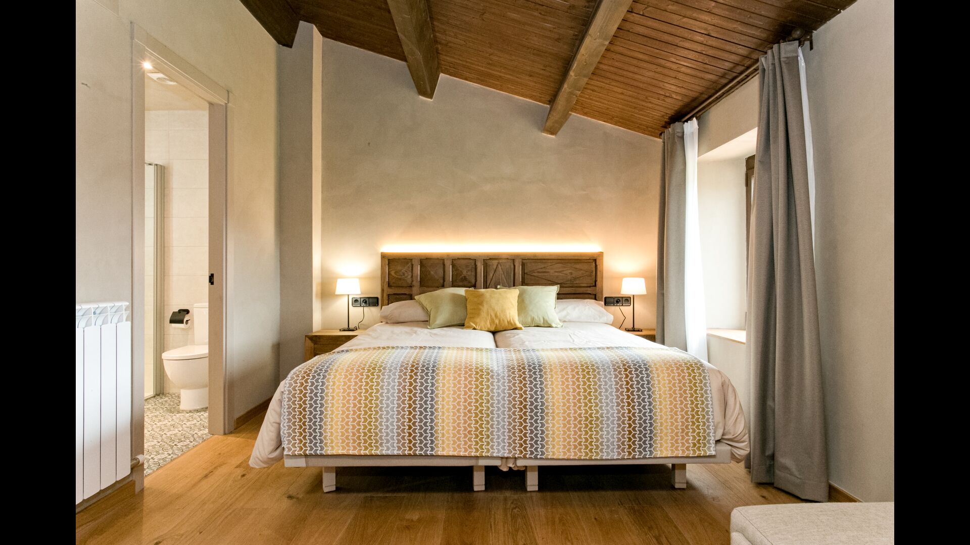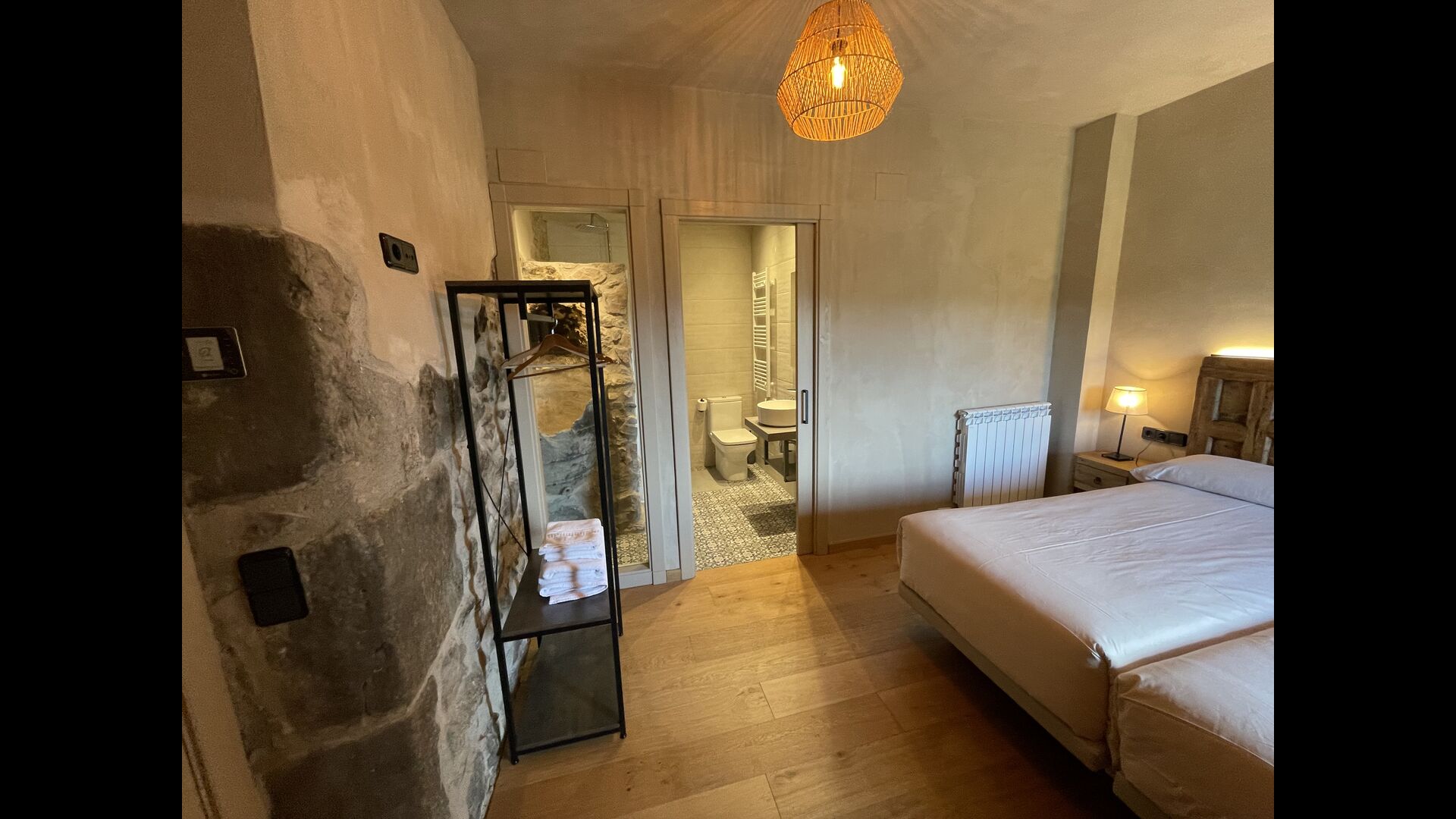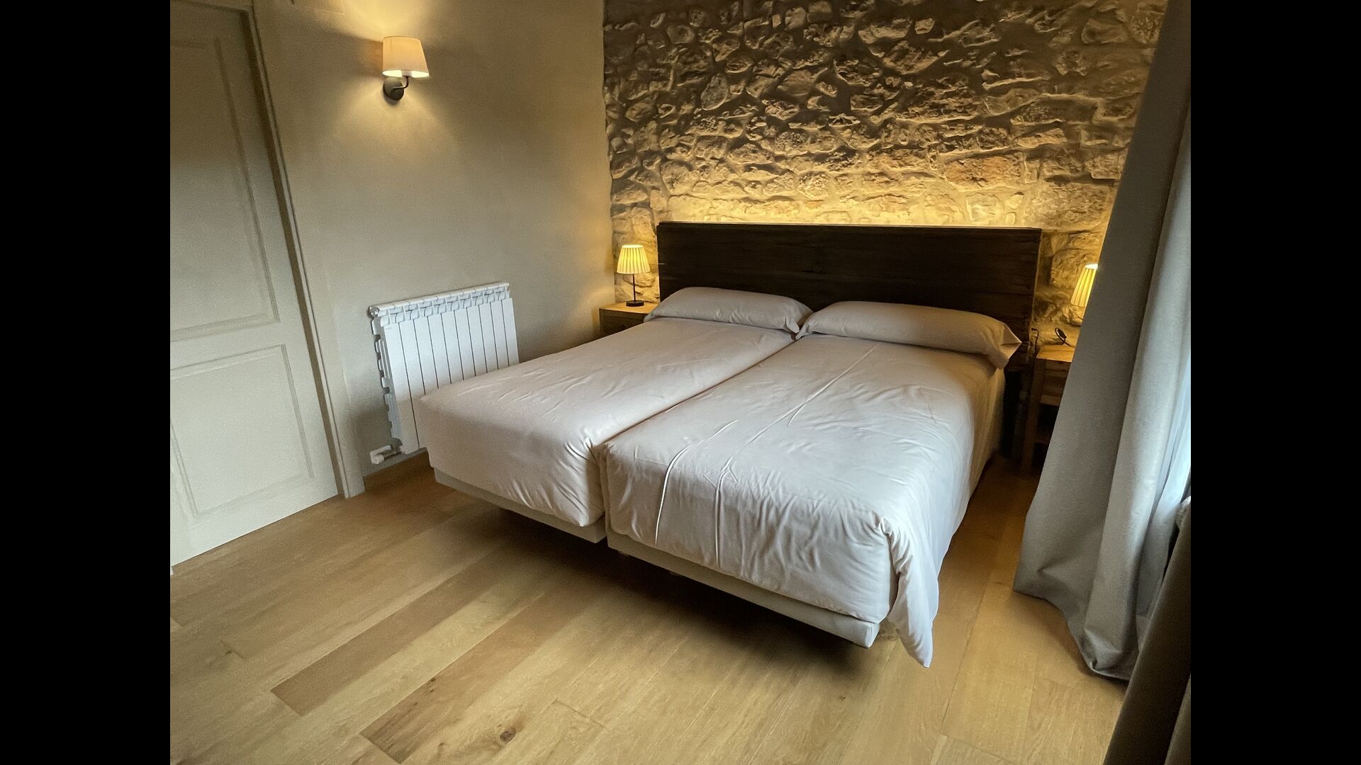 En la primera planta tenemos 6 habitaciones dobles, grandes y con vistas a la naturaleza, todas con baño privado. En la segunda planta encontramos 2 habitaciones dobles más, y 2 habitaciones cuádruples (con dos camas individuales y una cama de matrimonio, separadas por una puerta). Estas también tienen todas ventanas exteriores y baño completo privado.