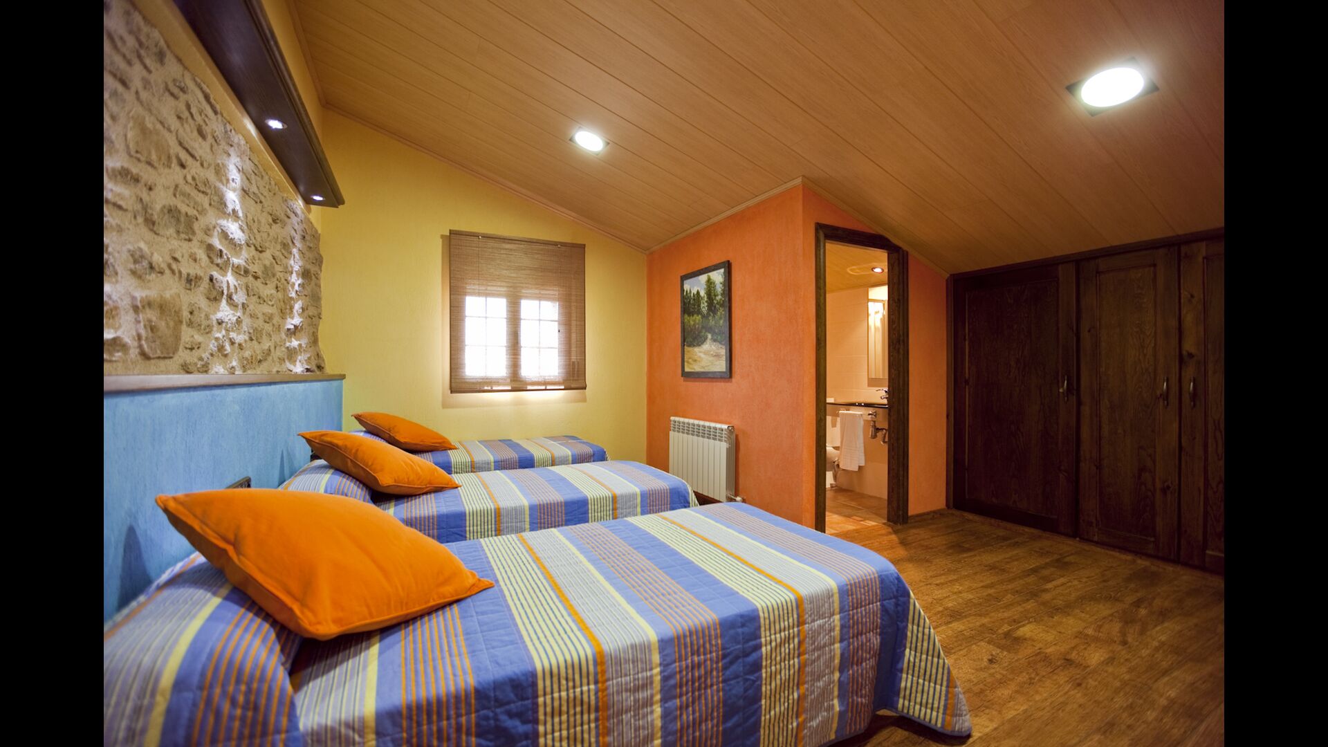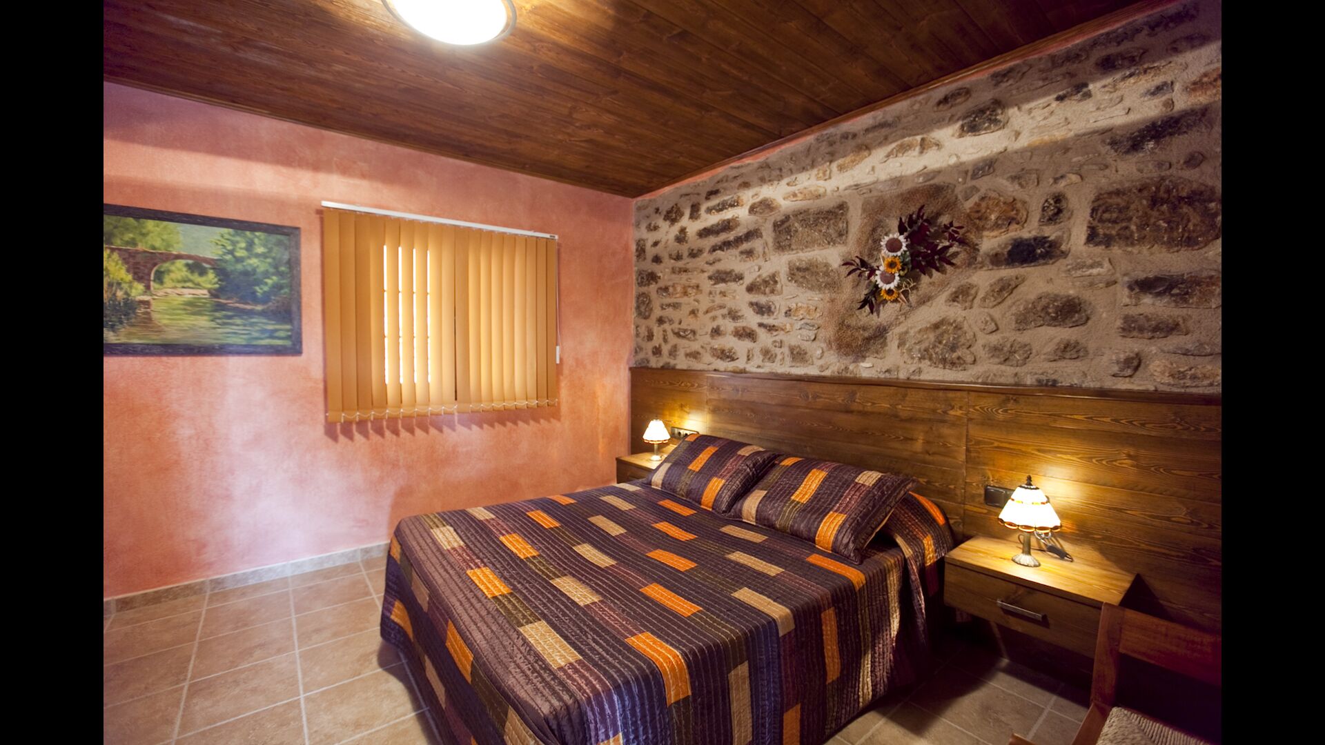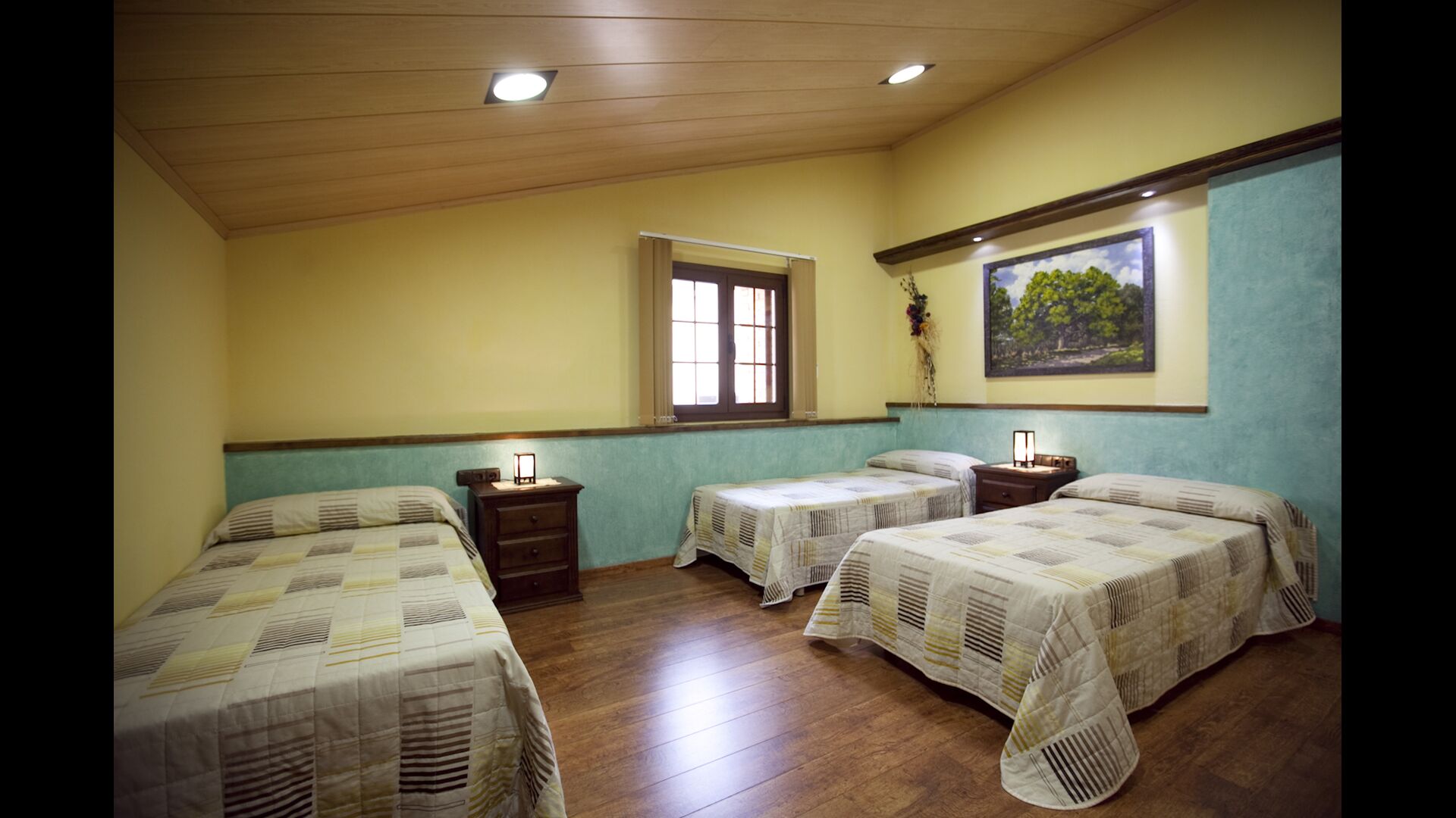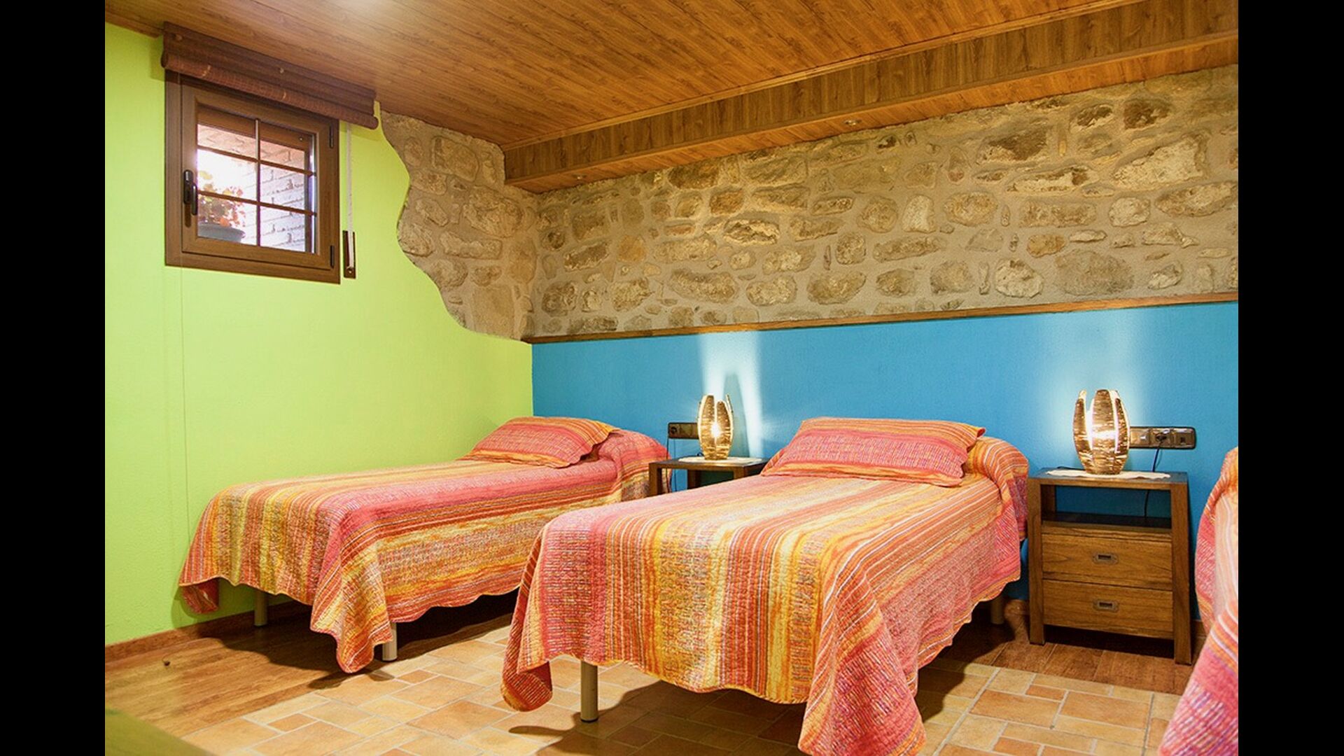 Desde la siguiente entrada, entras en la segunda parte del edificio. Sólo tiene una planta y tiene capacidad para 7 personas, con 3 habitaciones distribuidas en una habitación triple (tres camas individuales) y baño exterior, una habitación de matrimonio con baño interior y otra habitación de matrimonio con baño exterior. Cocina y sala común con TV y DVD. Esta parte tiene acceso directo a la terraza y a la fantástica piscina de verano.
