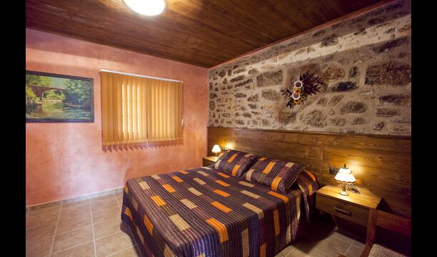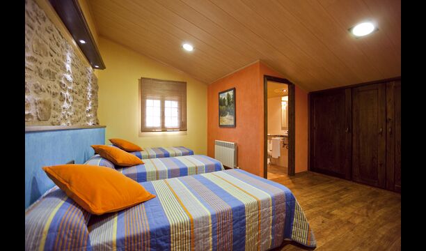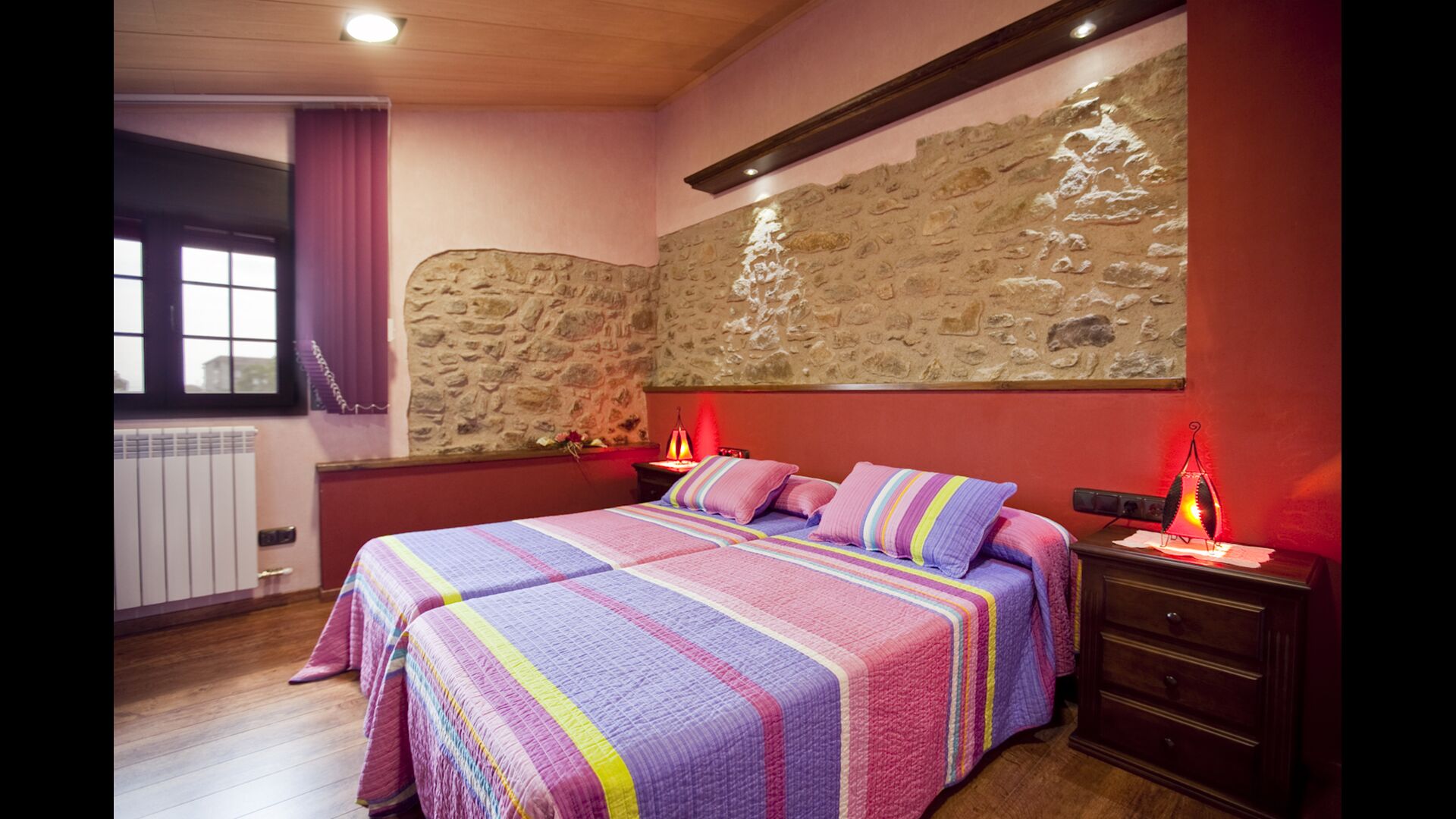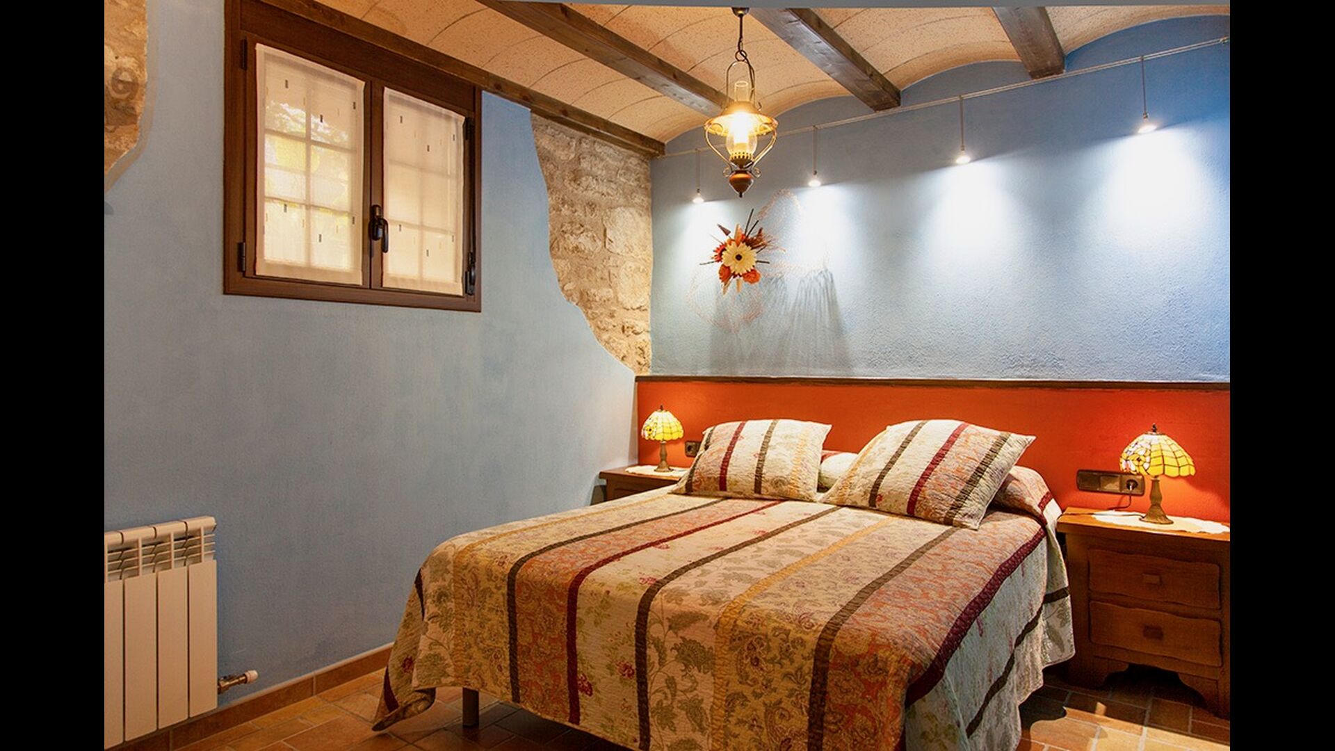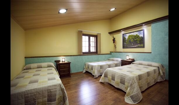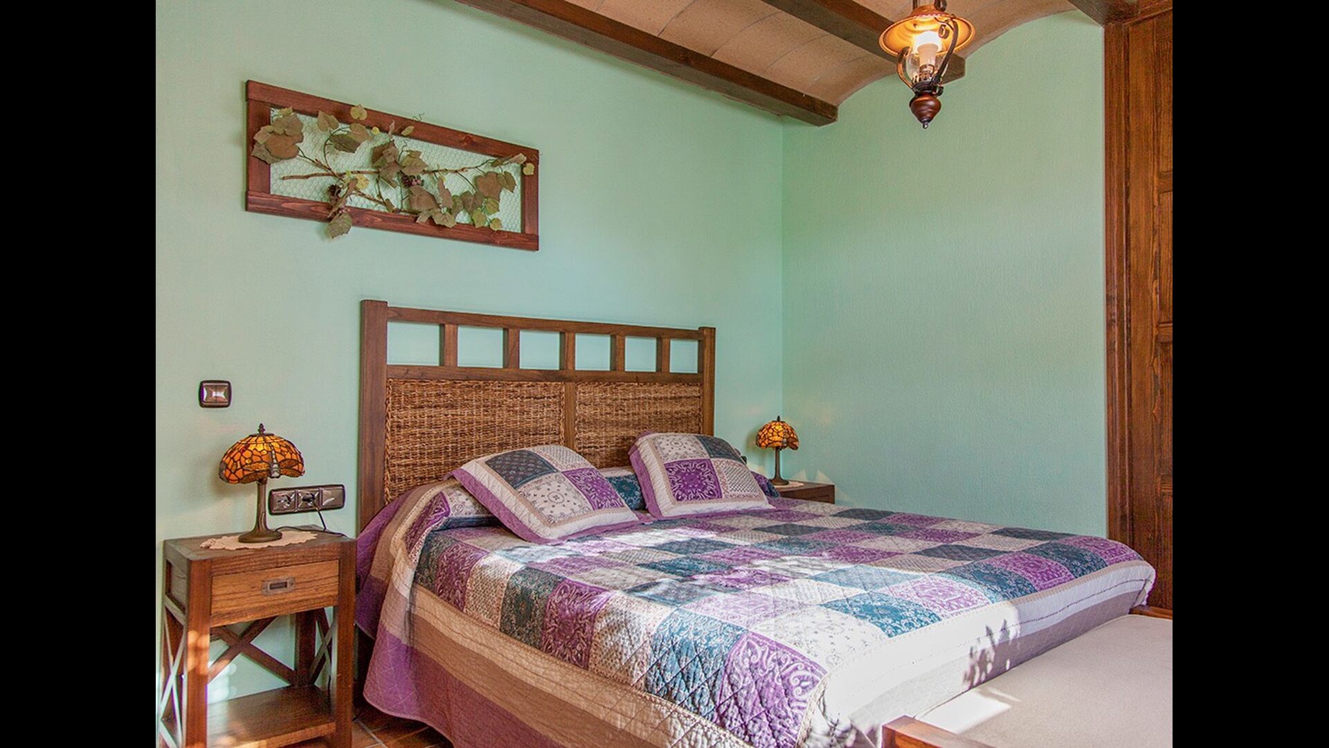 Desde la siguiente entrada, entras en la segunda parte del edificio. Sólo tiene una planta y tiene capacidad para 7 personas, con 3 habitaciones distribuidas en una habitación triple (tres camas individuales) y baño exterior, una habitación de matrimonio con baño interior y otra habitación de matrimonio con baño exterior. Cocina y sala común con TV y DVD. Esta parte tiene acceso directo a la terraza y a la fantástica piscina de verano.