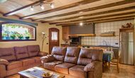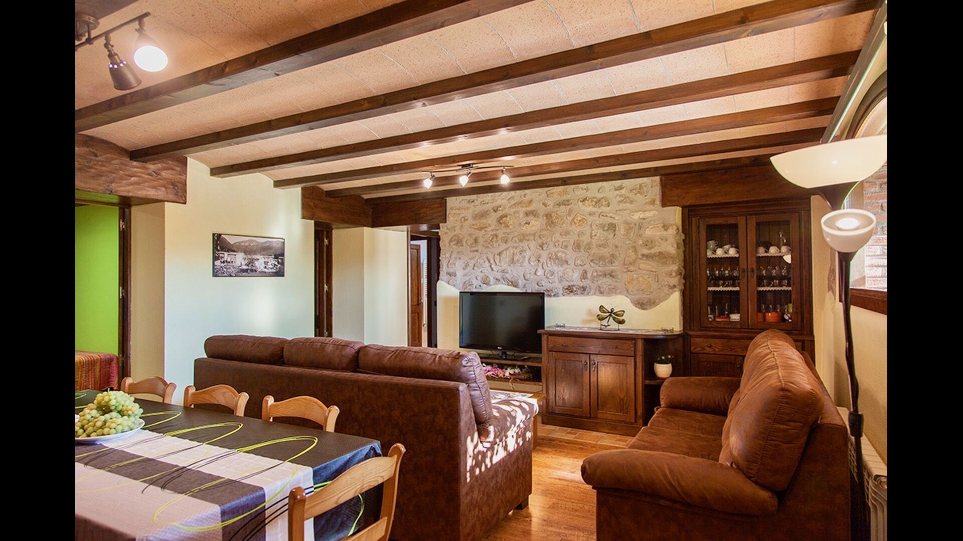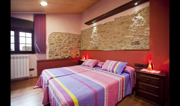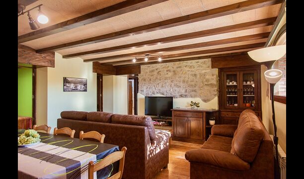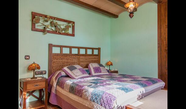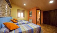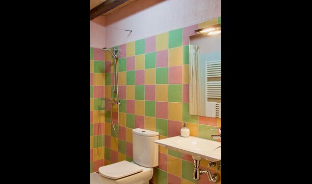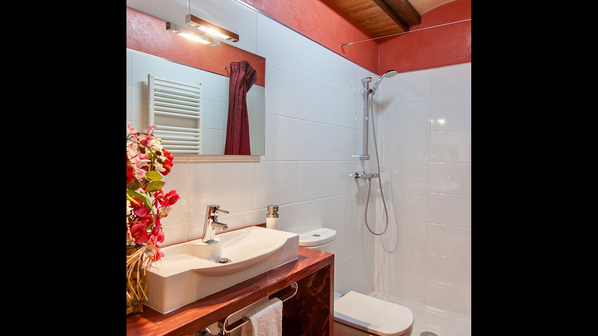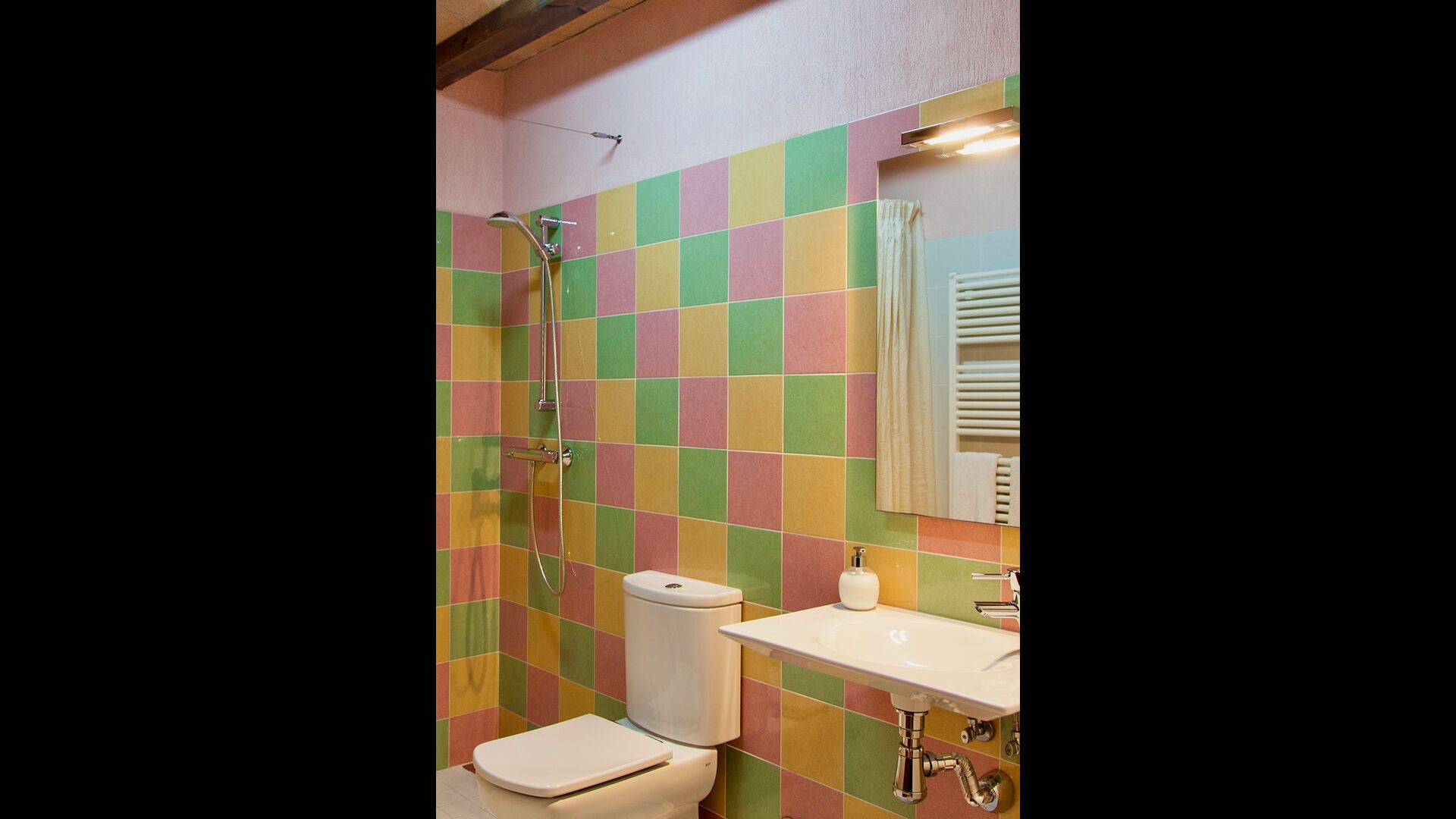 Desde la siguiente entrada, entras en la segunda parte del edificio. Sólo tiene una planta y tiene capacidad para 7 personas, con 3 habitaciones distribuidas en una habitación triple (tres camas individuales) y baño exterior, una habitación de matrimonio con baño interior y otra habitación de matrimonio con baño exterior. Cocina y sala común con TV y DVD. Esta parte tiene acceso directo a la terraza y a la fantástica piscina de verano.