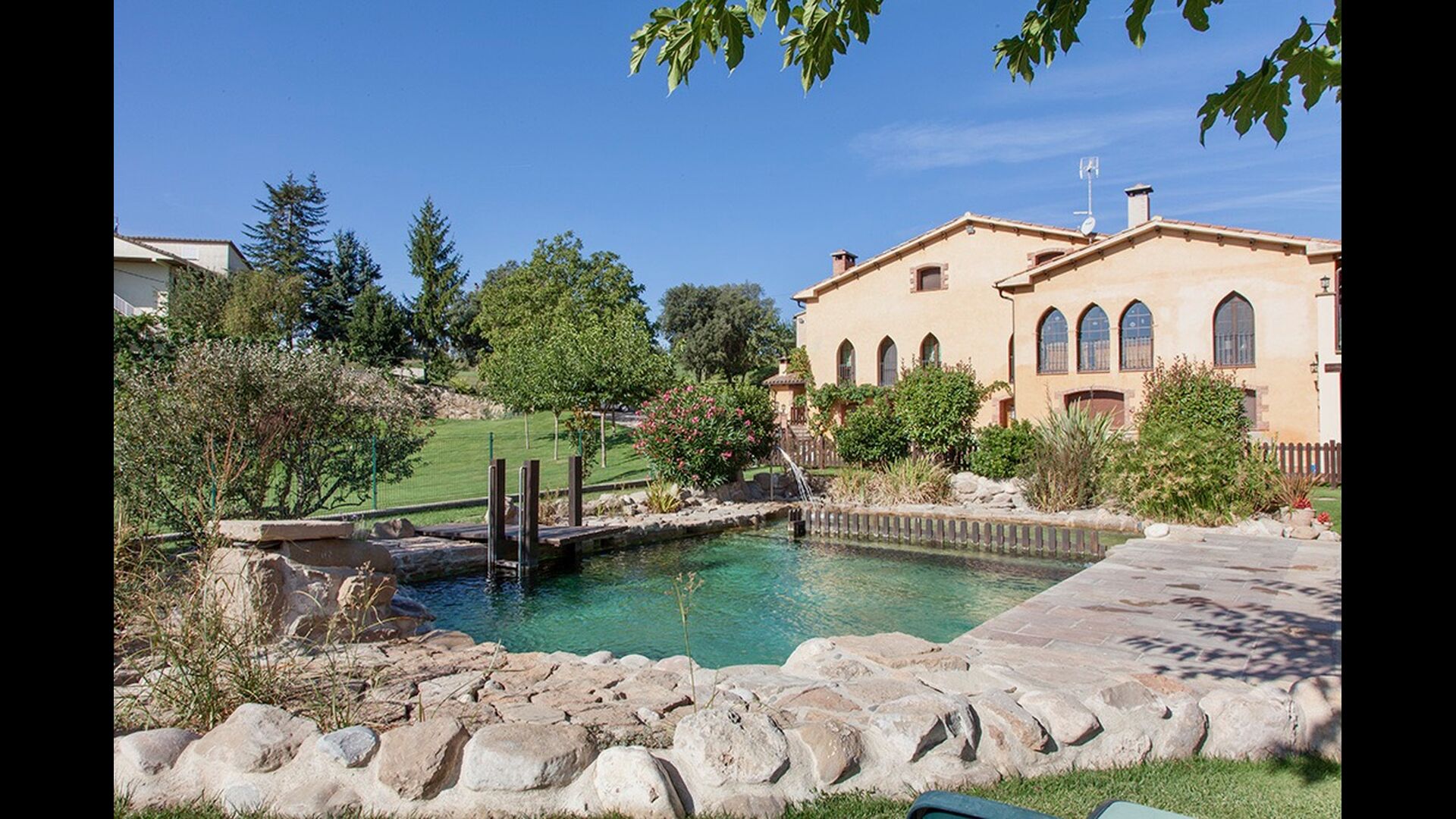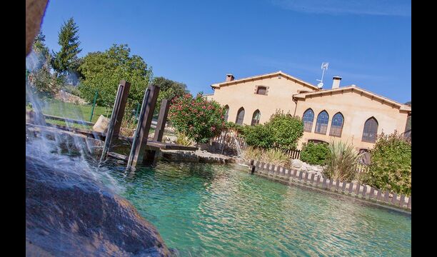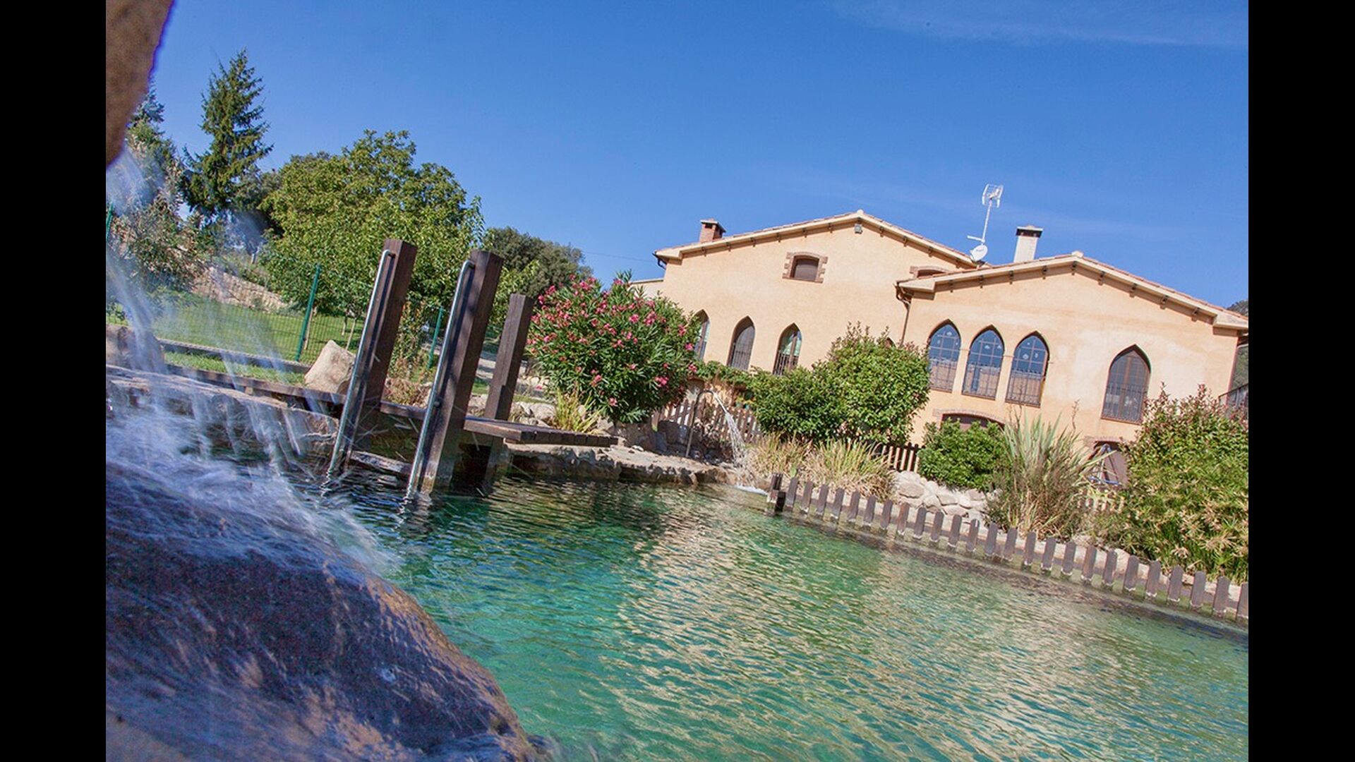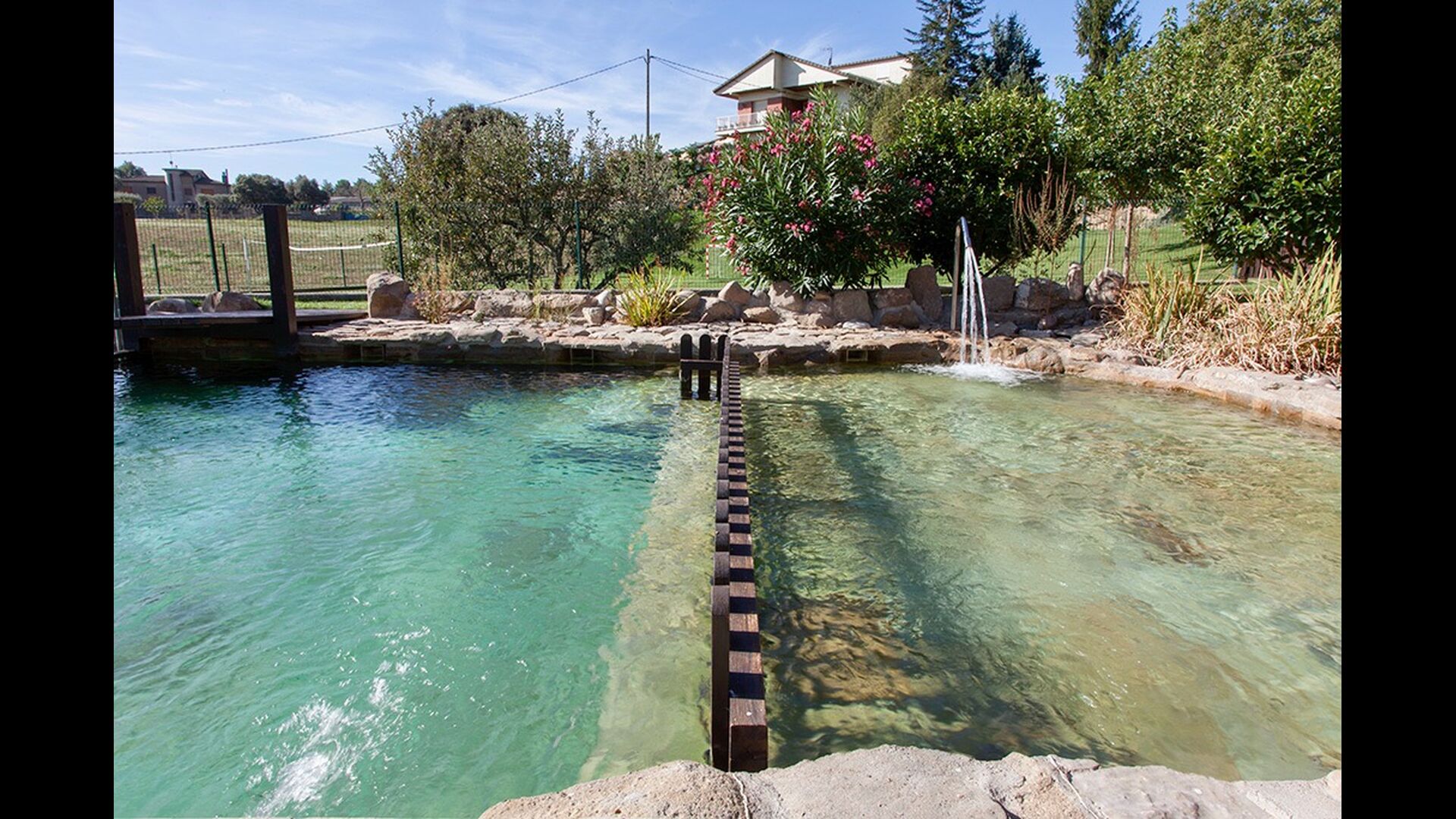 La zona de la piscina es realmente especial. La piscina se parece un poco a un lago, porque al reformar la casa, se ha integrado a su entrono natural con plantas acuáticas y baldosas de piedra que le dan ese toque mágico parecido a un estanque de agua natural. Además usando sal en lugar de cloro, para problemas de piel.
