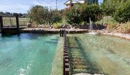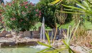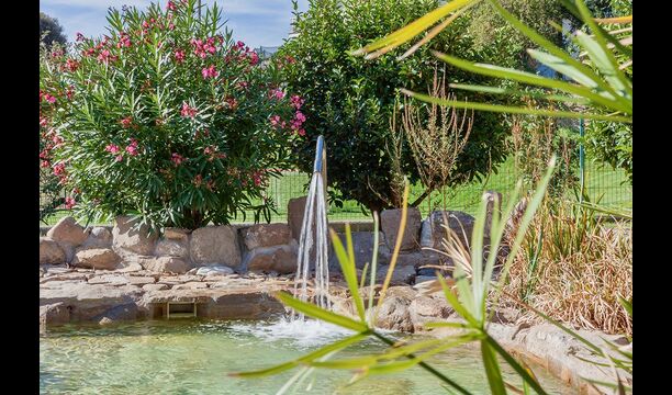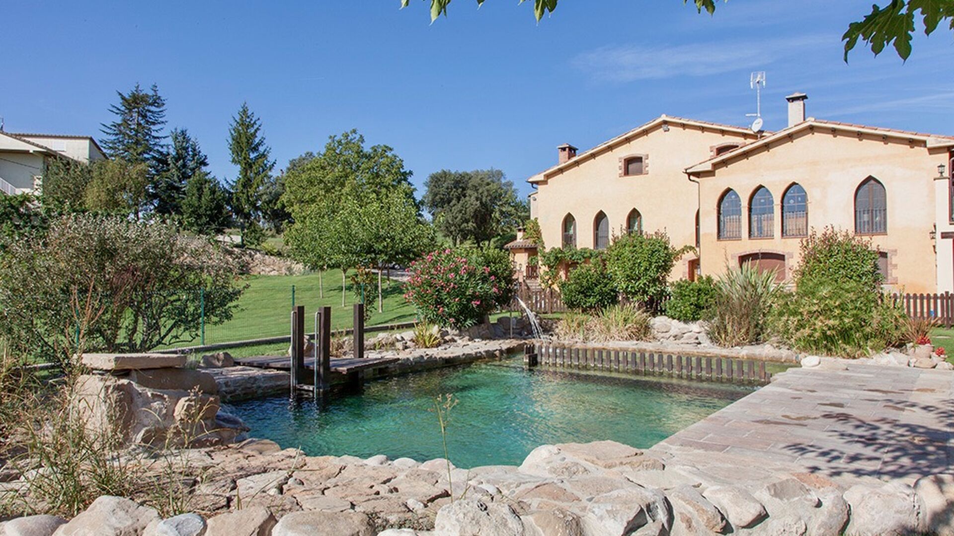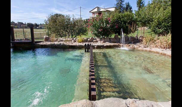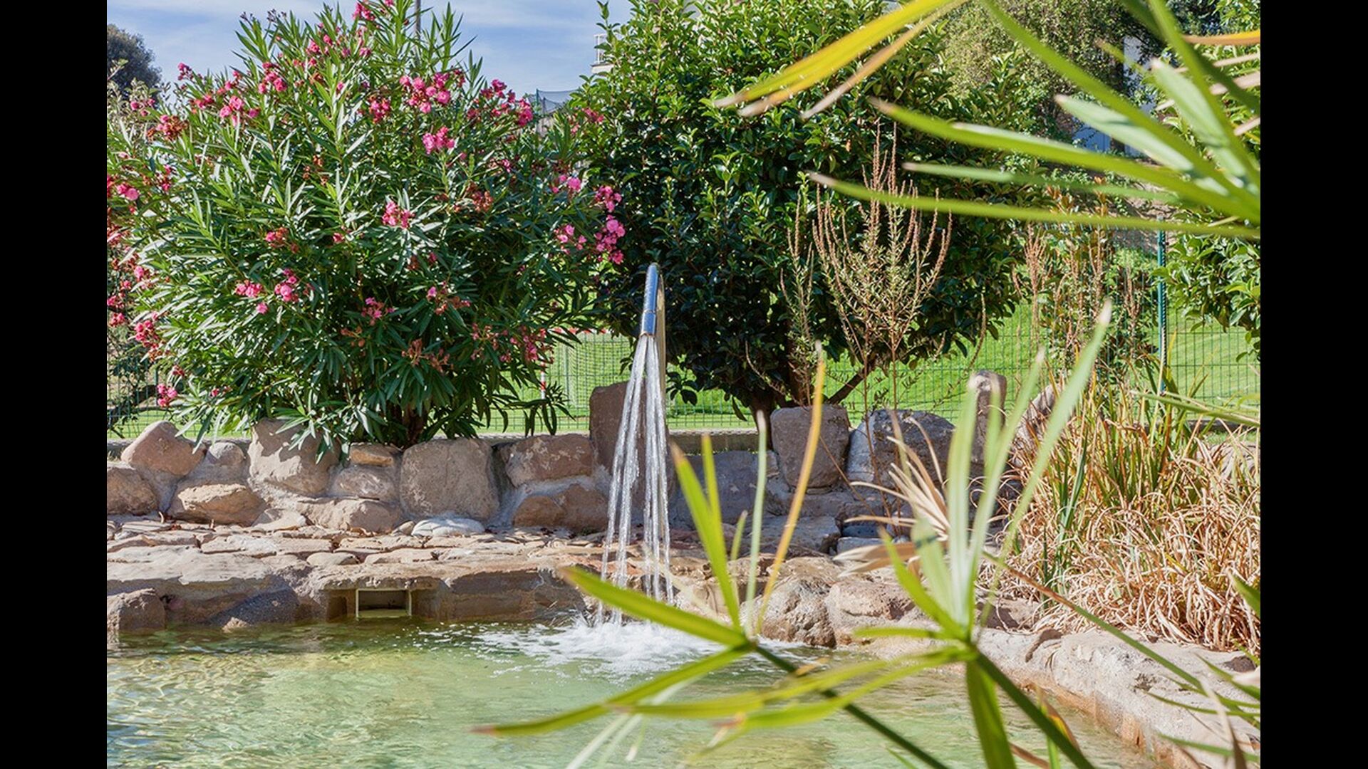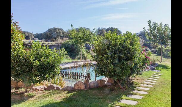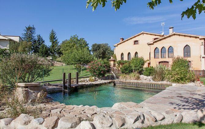 La zona de la piscina es realmente especial. La piscina se parece un poco a un lago, porque al reformar la casa, se ha integrado a su entrono natural con plantas acuáticas y baldosas de piedra que le dan ese toque mágico parecido a un estanque de agua natural. Además usando sal en lugar de cloro, para problemas de piel.