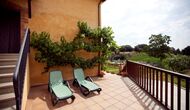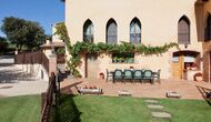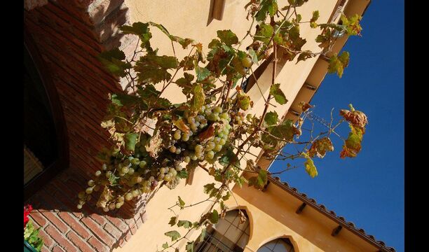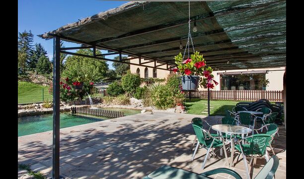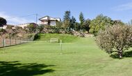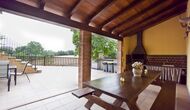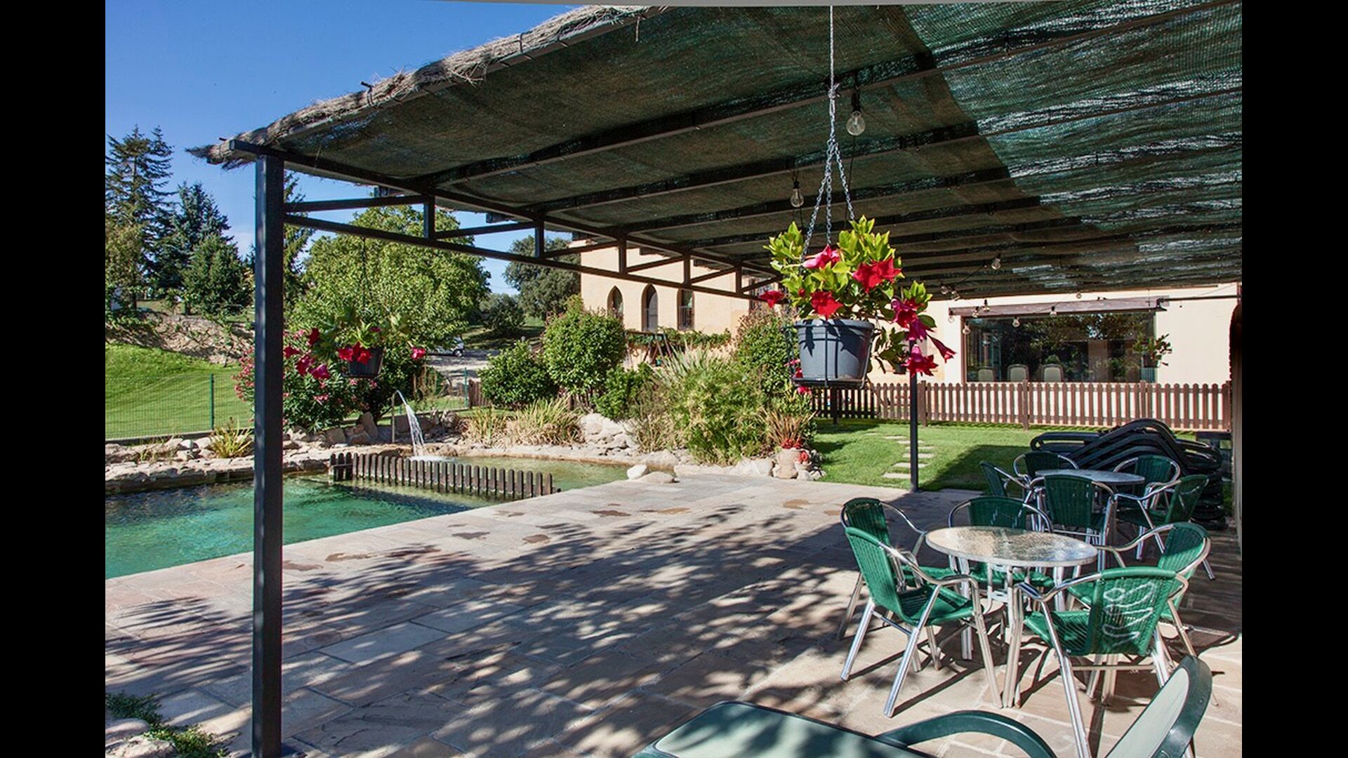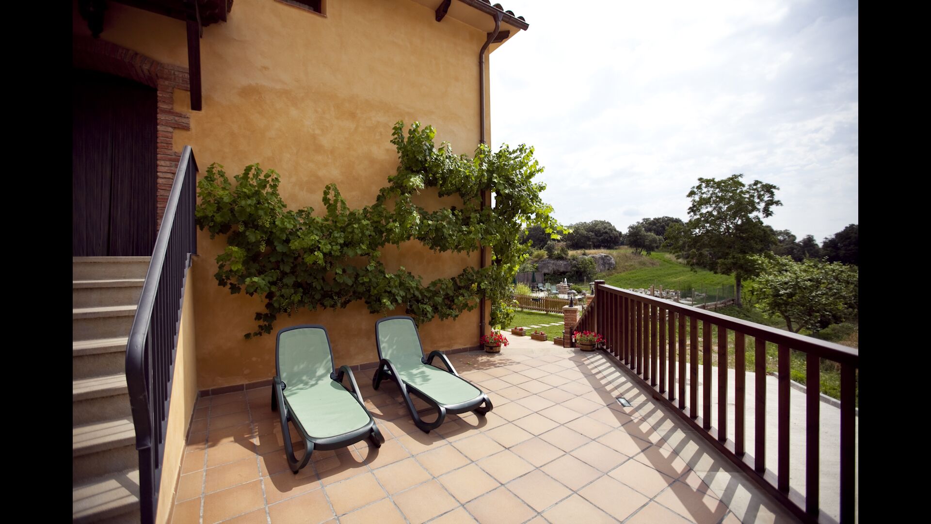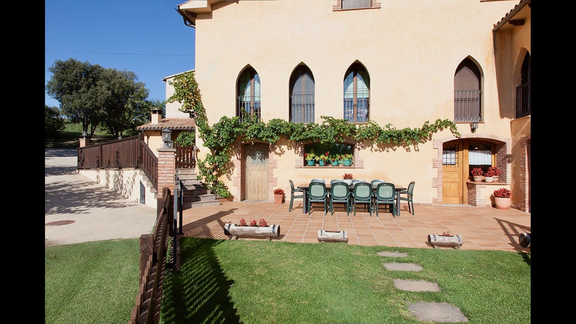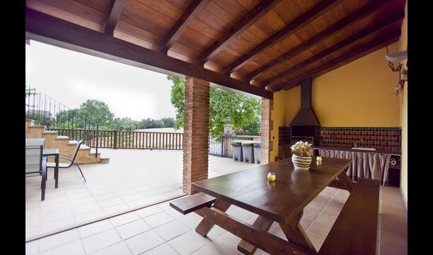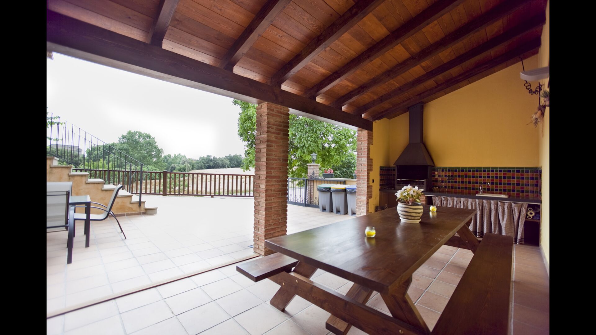 La amplia zona al aire libre, con uvas en la pared, incluye la terraza con zona de barbacoa, ping-pong y futbolín y una área de césped en el frente. También hay un parque infantil para los niños.