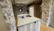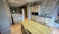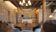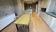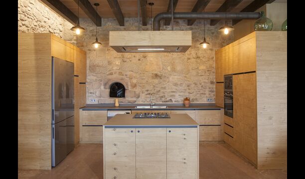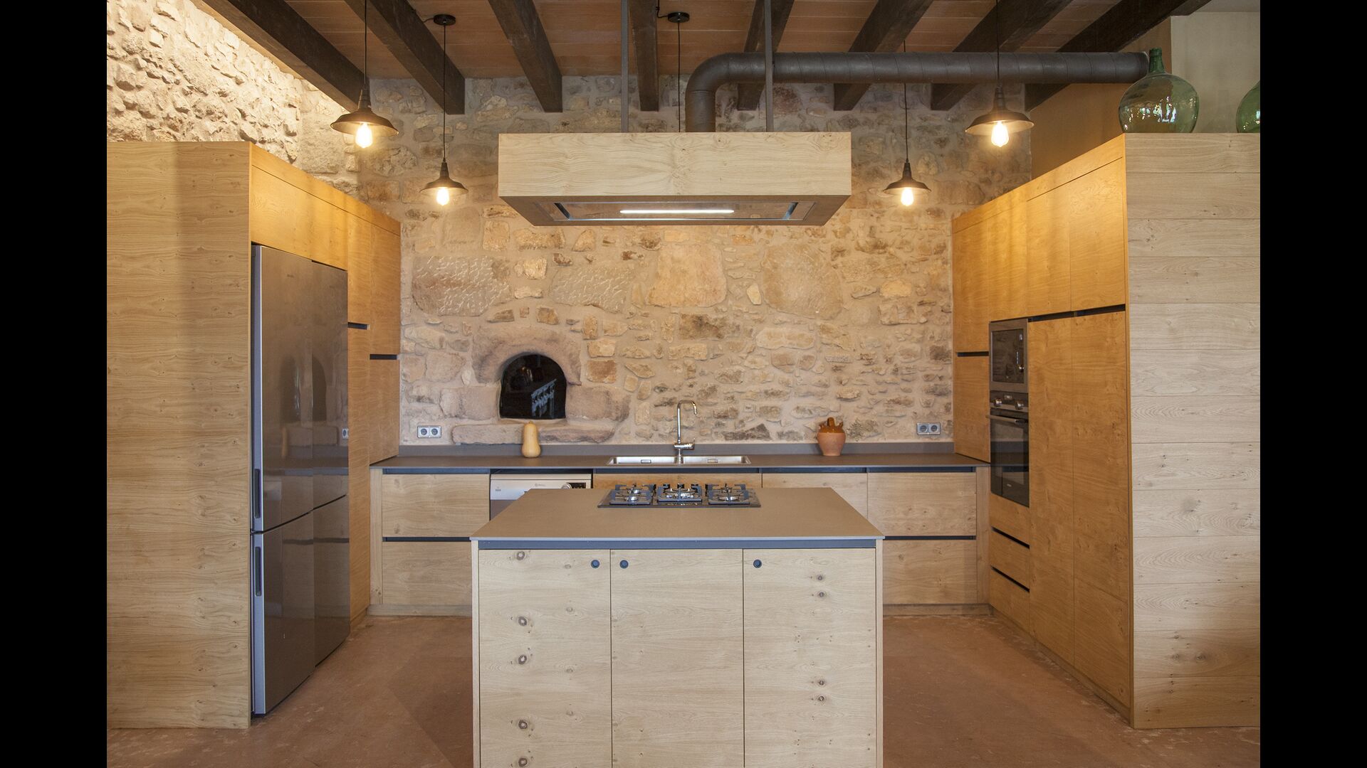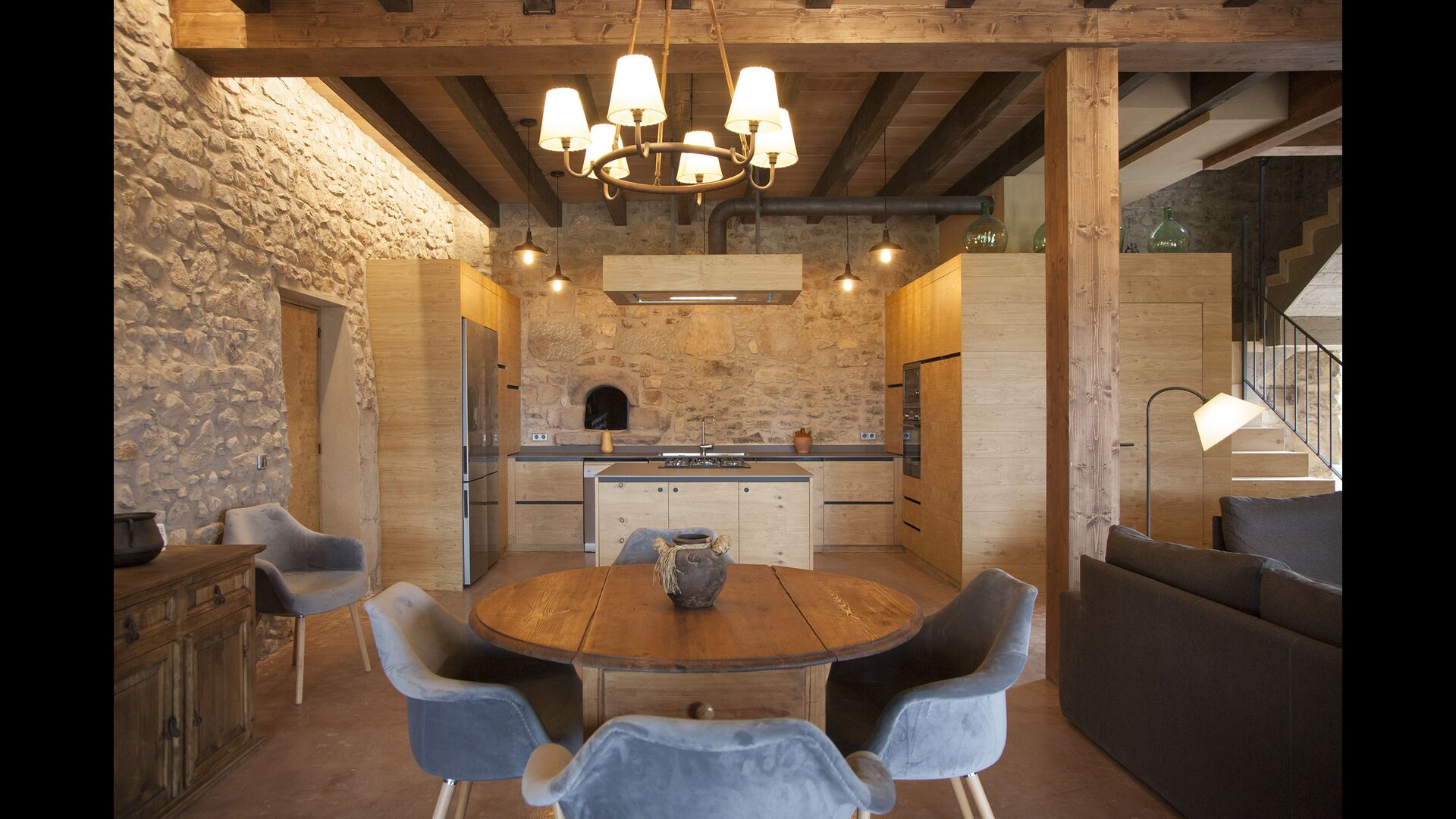 Conectada al comedor está la cocina abierta,construida con muebles de madera de roble natural, totalmente equipada con 2 neveras y 2 congeladores, horno. microondas, encimera de gas, lavavajillas, cafetera .En la misma sala hay una zona de relax con la chimenea y sofás. En esta planta también hay un pequeño aseo con wc y lavabo.