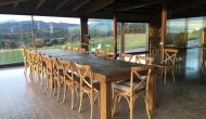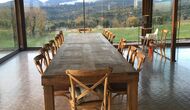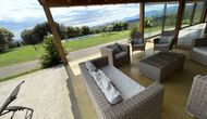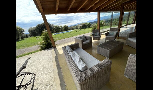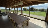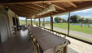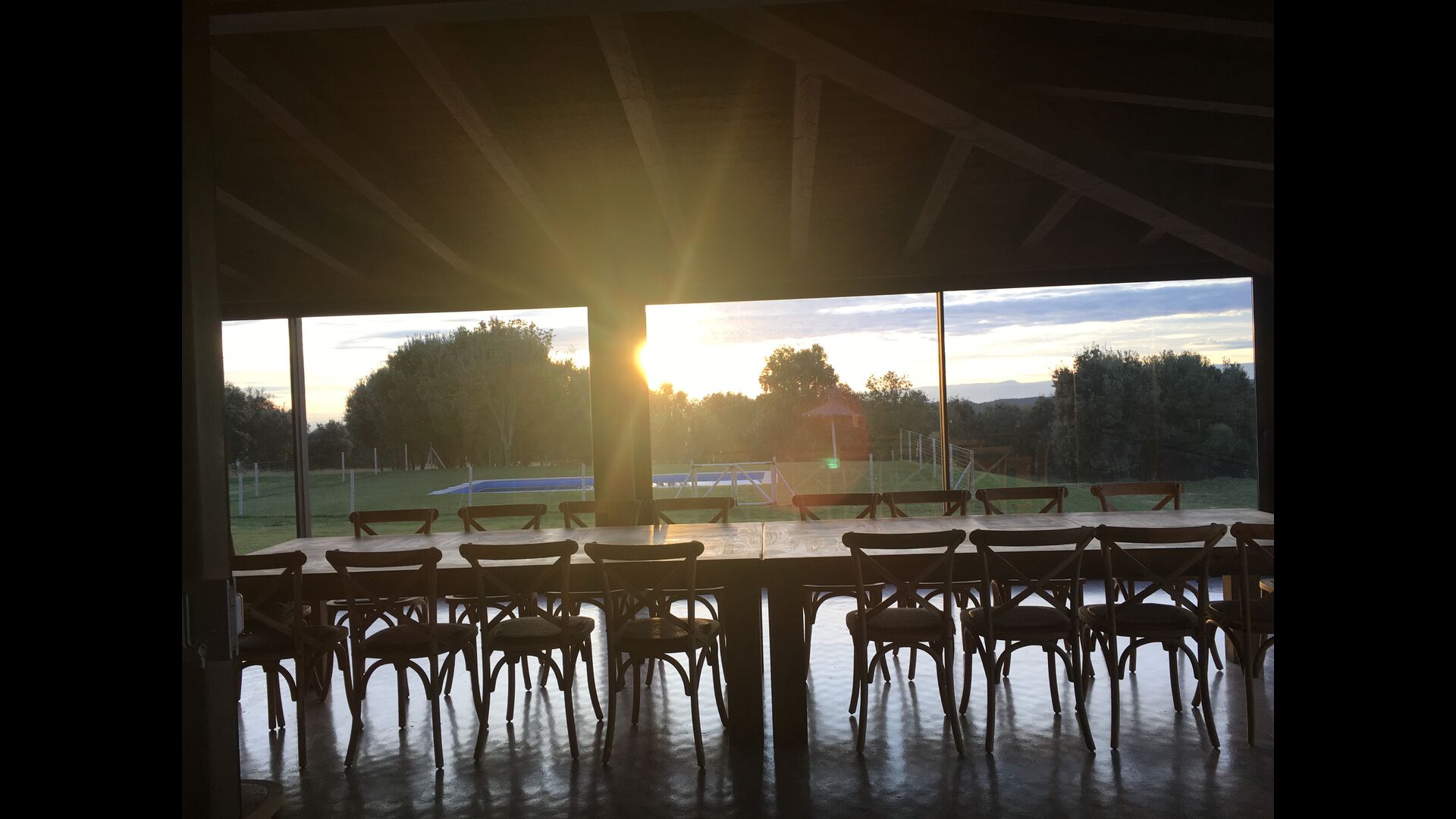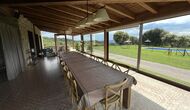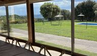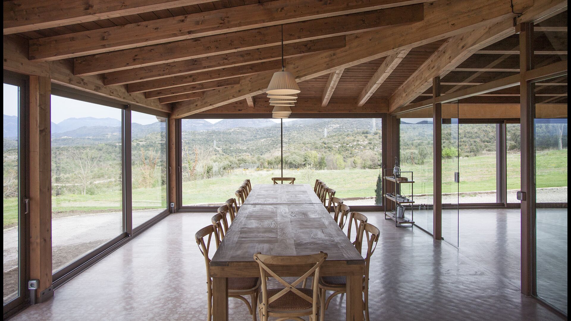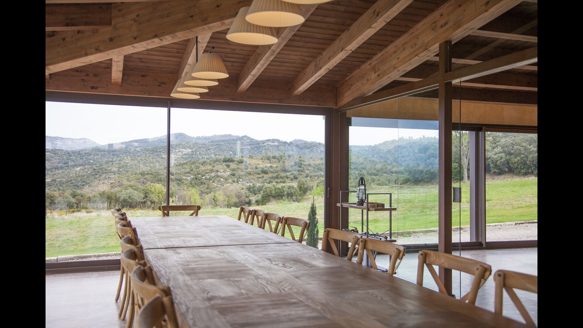En la planta baja hay un porche situado frente a la piscina y con vistas espectaculares a las montañas. Desde el porche se entra a un comedor totalmente abierto al jardin con unas grandes vidrieras.