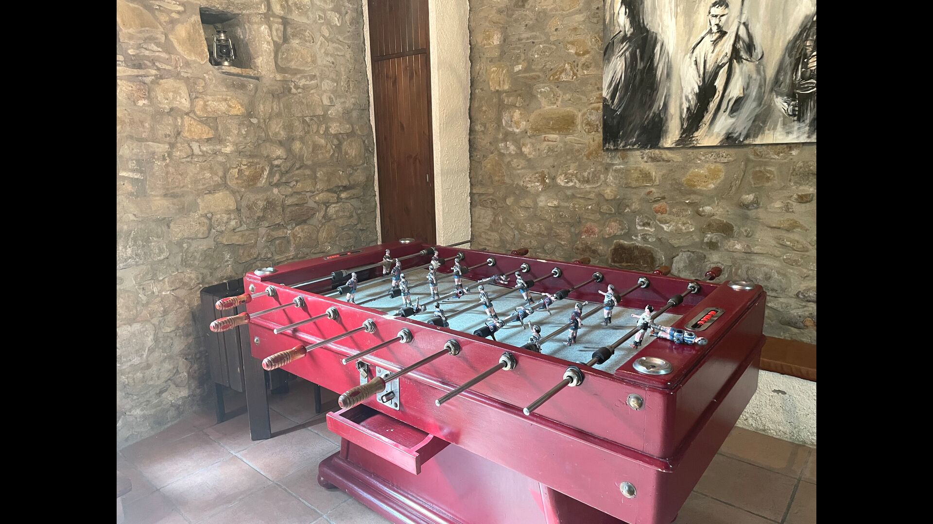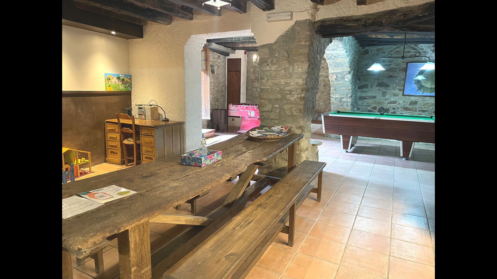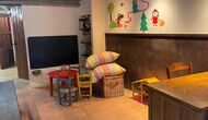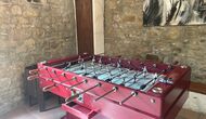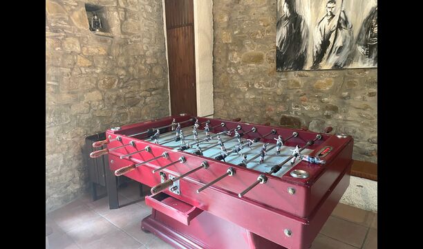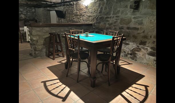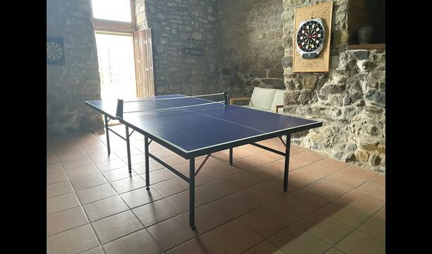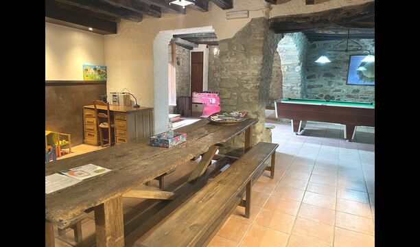 El edificio junto a la piscina está formado por los dos apartamentos Soler I y Soler II,, también comunicados interiormente. En el piso más bajo, encontrará la gran área de actividades, que es genial. Hay rincón con juguetes para los más pequeños, billar, ping-pong, futbolín y hasta una original mesa de juego de cartas sacada de una película de mafiosos de Nueva York. Aquí también encontrará dos baños adicionales.