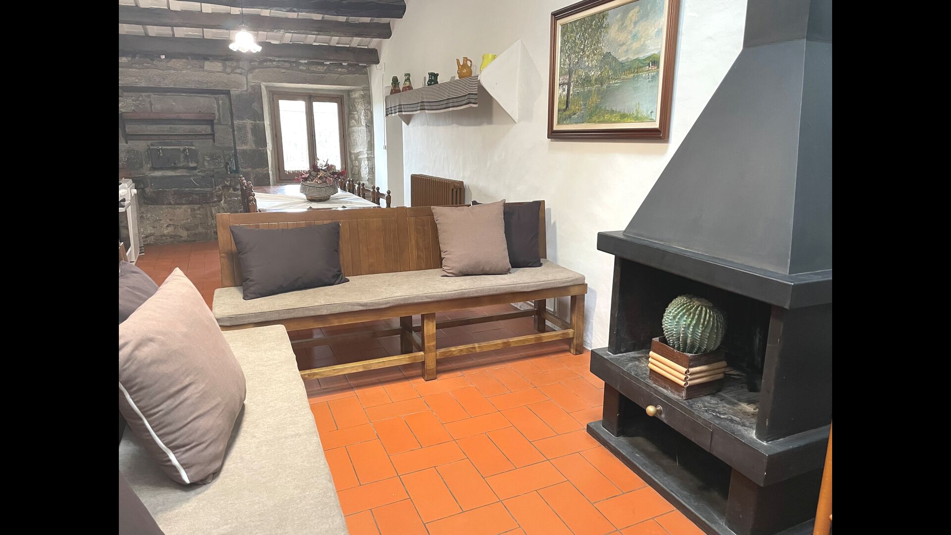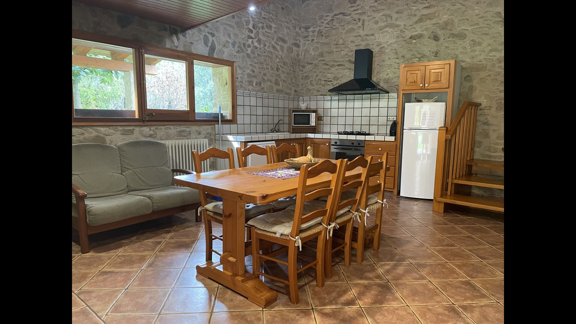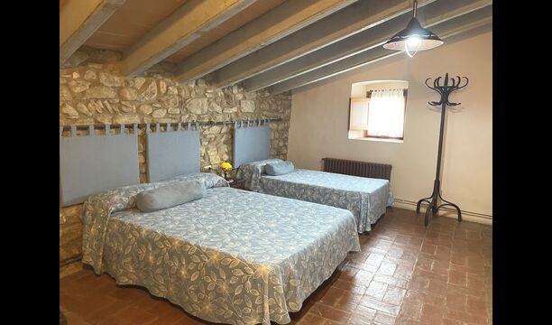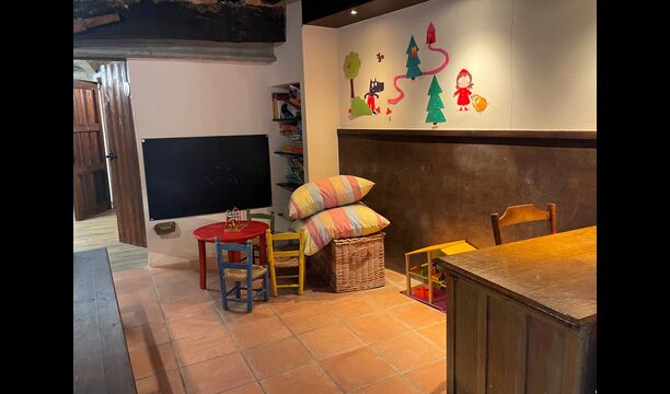 El apartamento Soler II está conectado tanto con el Soler I como con la sala de juegos, y también tiene salida directa al jardín. Aquí encontrará dos dormitorios grandes, cada uno con 2 camas dobles, y luego una habitación doble con cama doble. Estos tres dormitorios comparten 2 baños. Además, hay una bonita sala común rústica con comedor, cocina y sala de estar.
