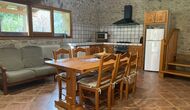Luego, un nivel más abajo, se encuentra el apartamento Paller II, también con una sala común con cocina abierta, sofá y mesa de comedor. Además, hay dos habitaciones dobles que comparten un baño.