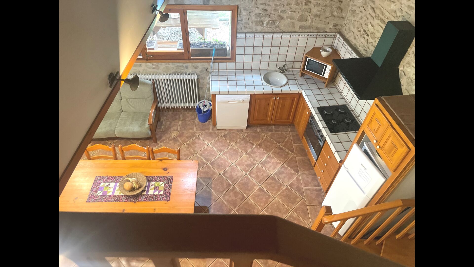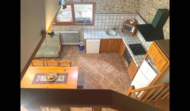 Desde la planta baja se accede al apartamento Paller I, que cuenta con una gran sala común de techo muy alto. Aquí, hay un rincón de sofá con TV, una cocina abierta y un comedor con mesa de comedor. En la planta superior, encuentra 3 habitaciones dobles compartiendo 1 baño.