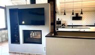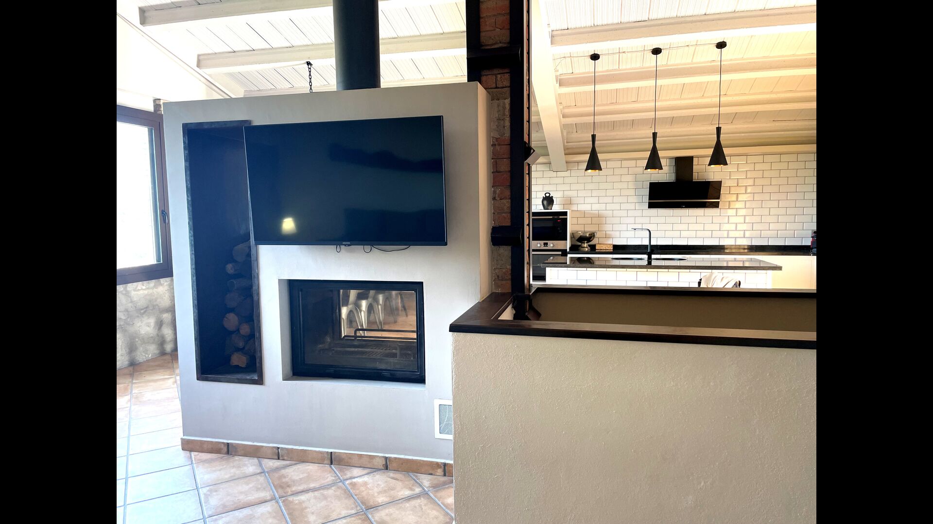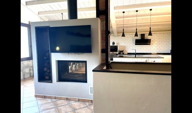 Dado que la casa está ubicada en una pendiente, el primer piso tiene acceso casi directo desde el estacionamiento, donde a través de una gran terraza se ingresa a la gran sala de estar con la cocina moderna y muy bien equipada, comedor con una hermosa mesa larga de madera; y zona de sofás con sofás, TV y chimenea. Además, hay una amplia habitación doble con acceso directo a la terrazay un baño completo con ducha.