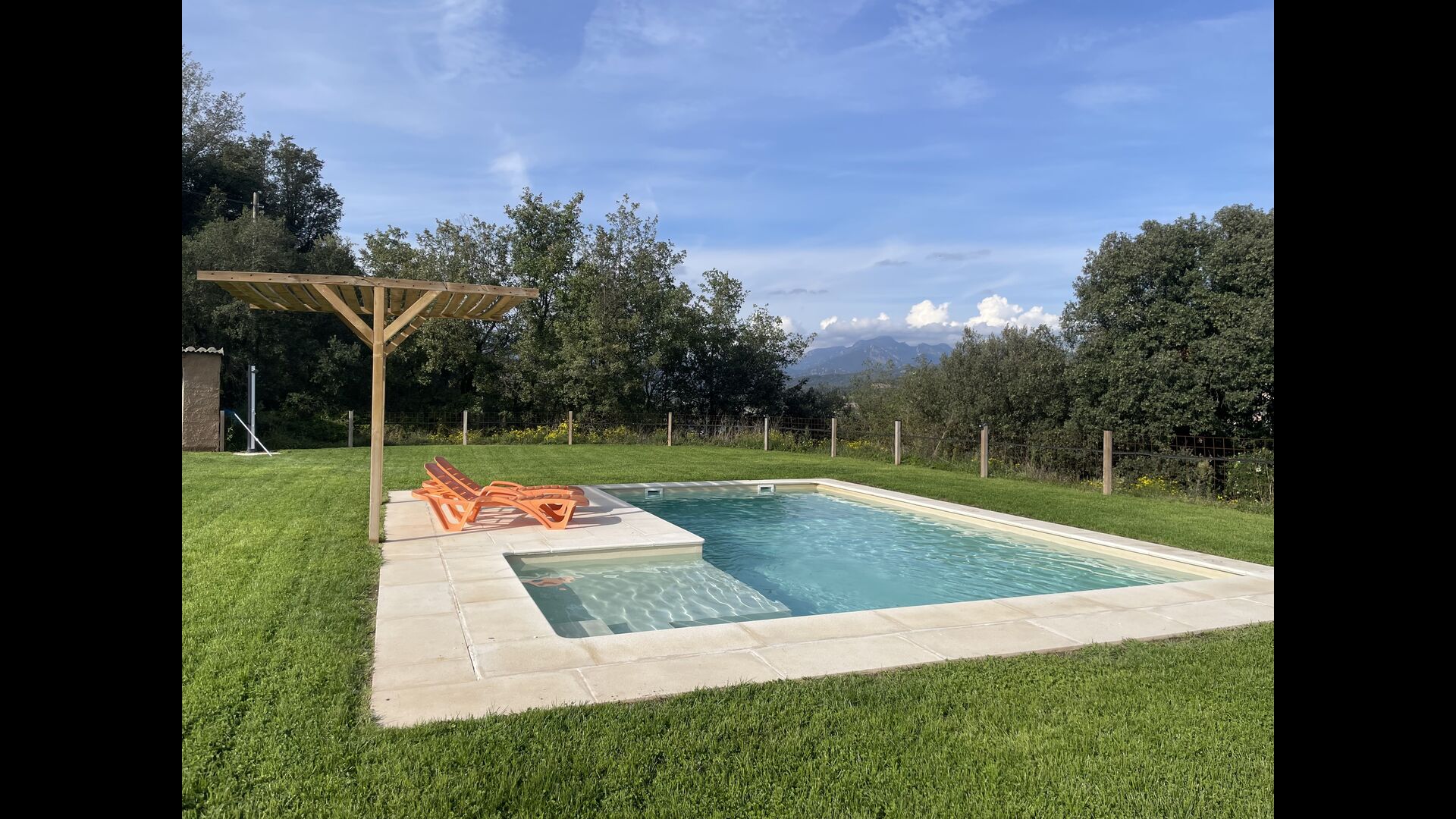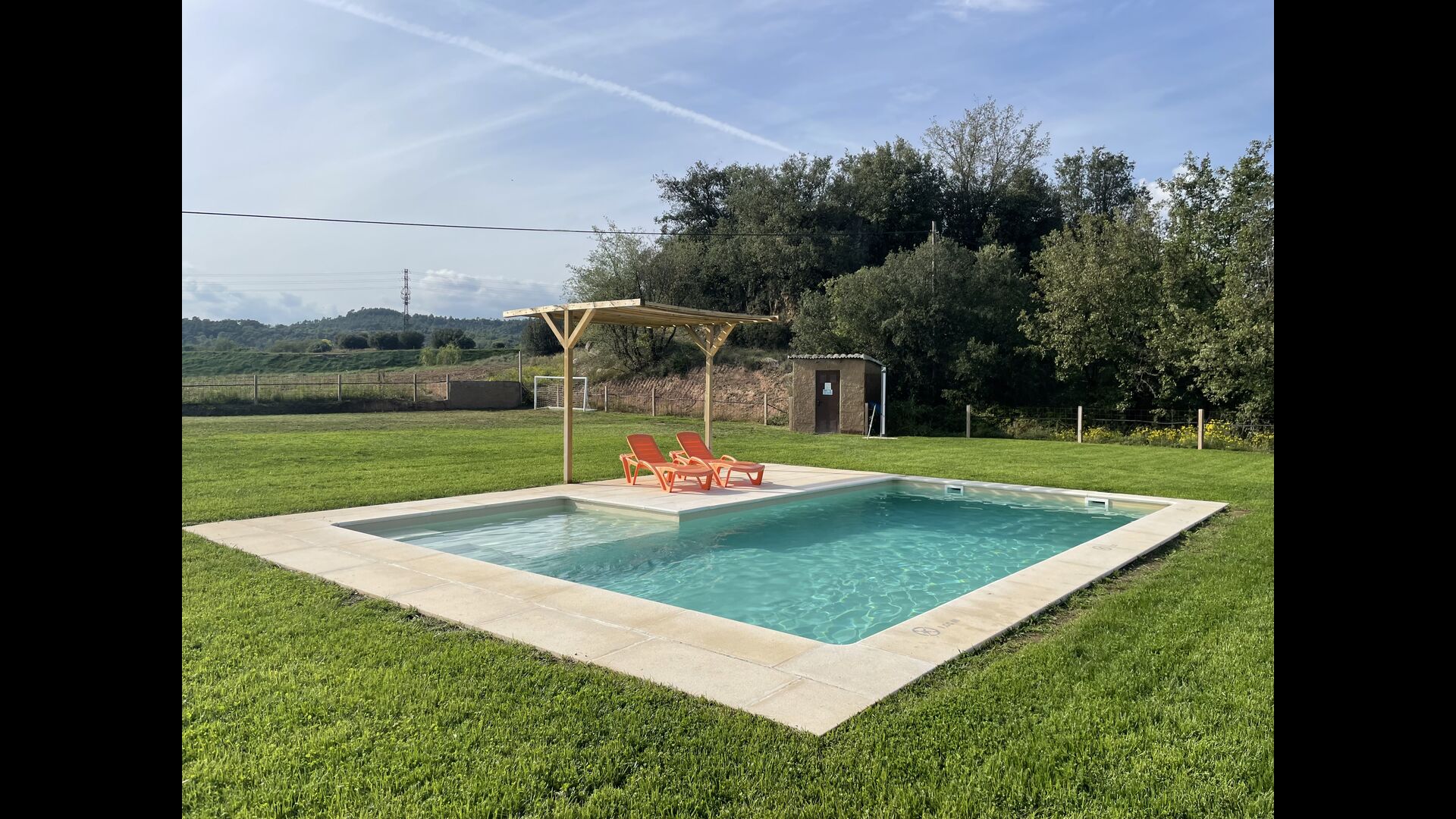 La piscina mide 8 x 4 metros y también tiene vistas al campo. Y para los calurosos días de verano, Xavi y Mabel han hecho una cubierta permanente, así que los que queráis algo de sombra tenéis la opción. También tiene una escalera en un lateral y un parte con agua con bajo profundidad, lo que la hace ideal para niños más pequeños.
