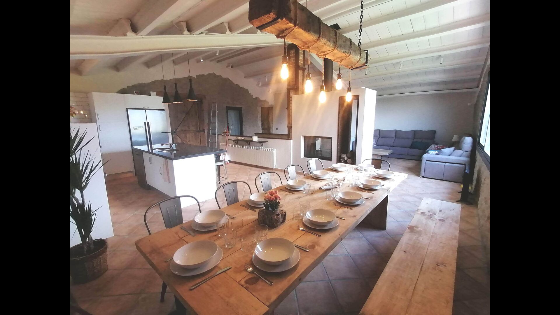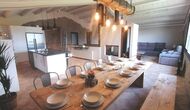 • Amplia sala de estar con esquina de sofá, mesa de comedor rústica y cocina