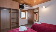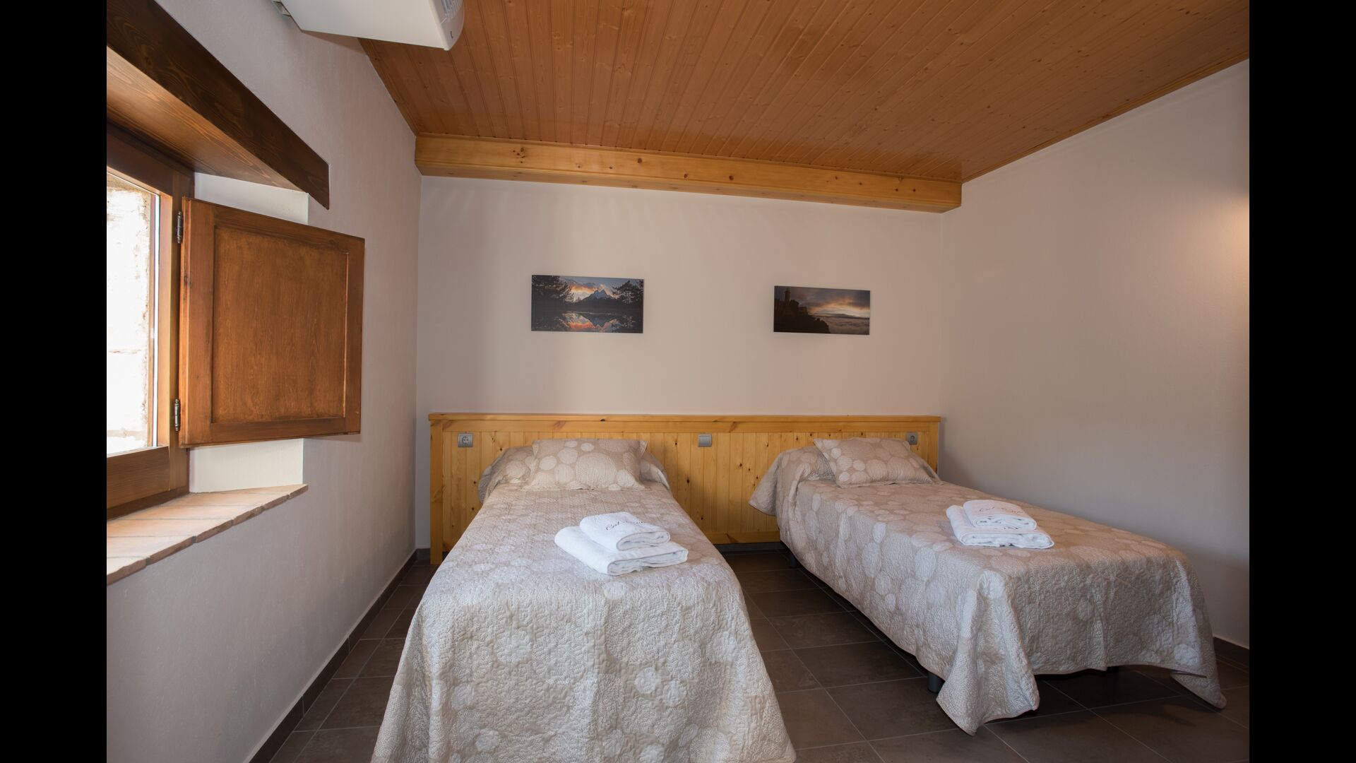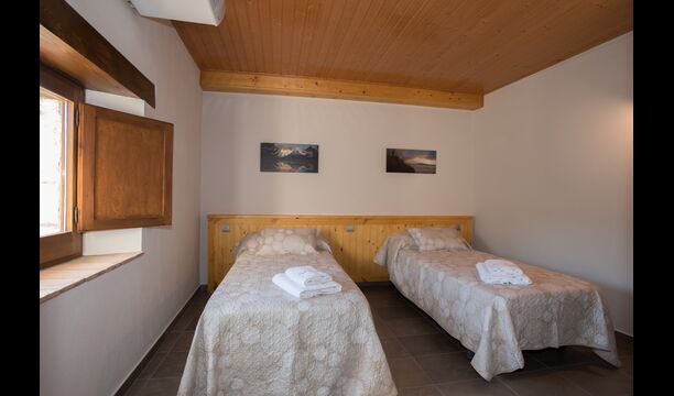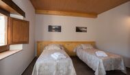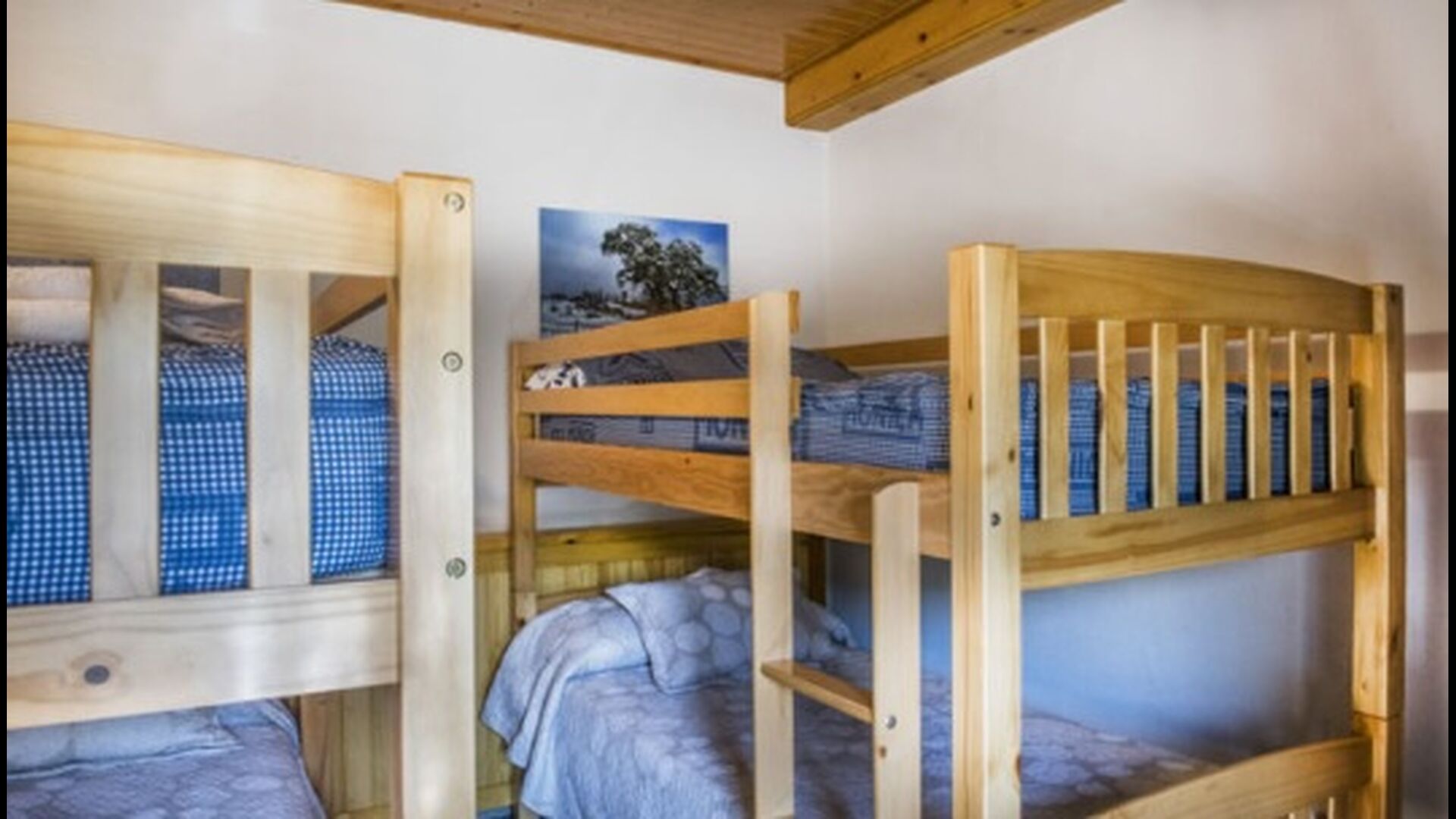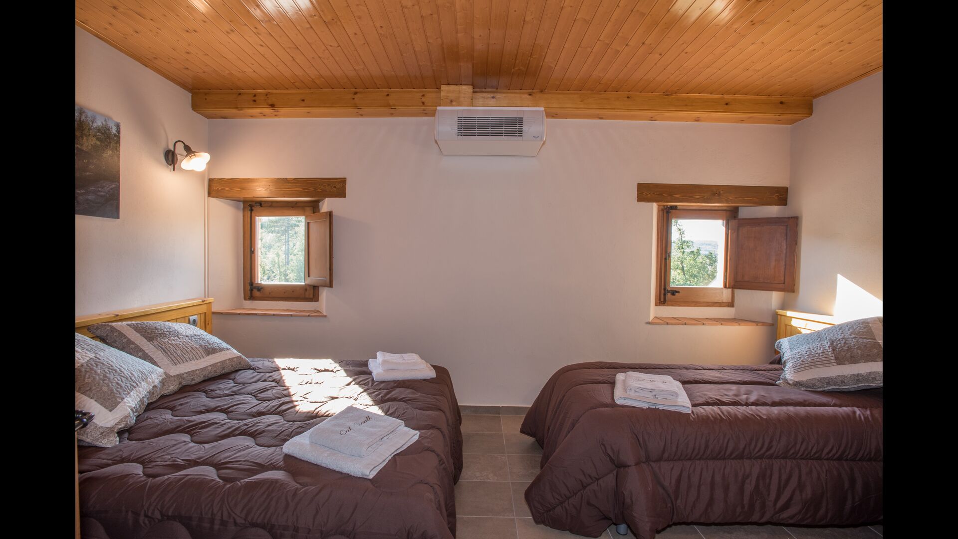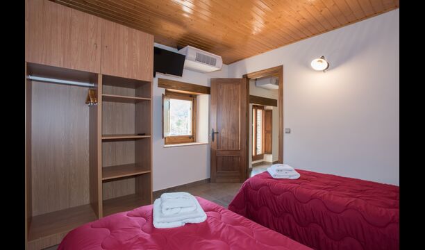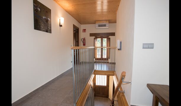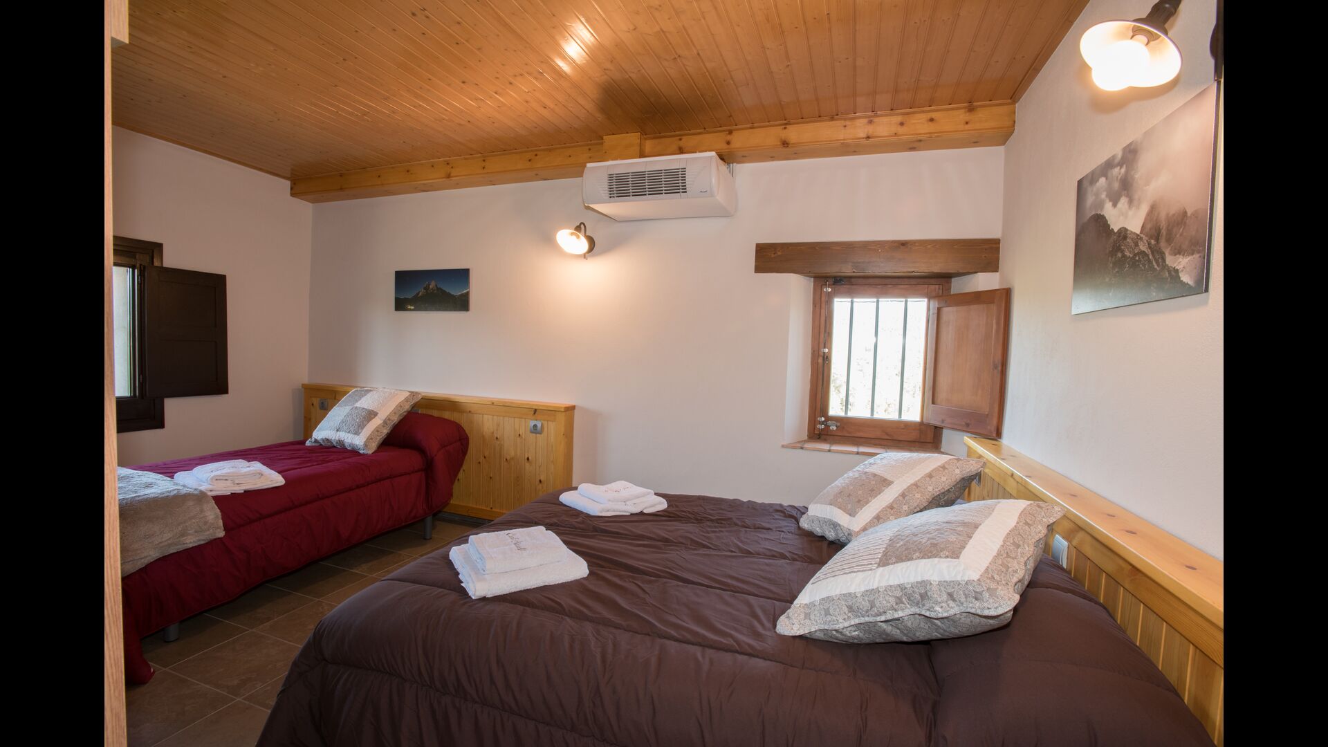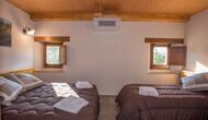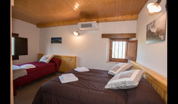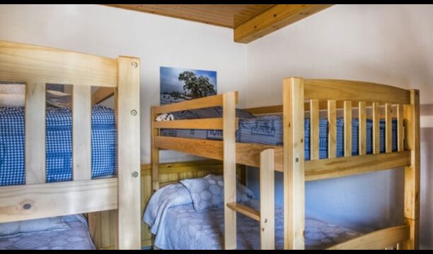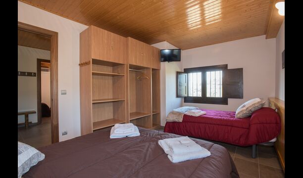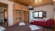 Arriba, se encuentran los 4 dormitorios adicionales, que están equipados para poder alojar a 3 familias ya que hay 2 habitaciones triples y 1 habitación doble y, por último, el cuarto dormitorio se ha convertido en una habitación para niños con dos literas. Hay dos baños en este piso también, por lo que son tres en total. Como uno tiende a pasar un poco de calor, hay aire acondicionado en esa habitación.