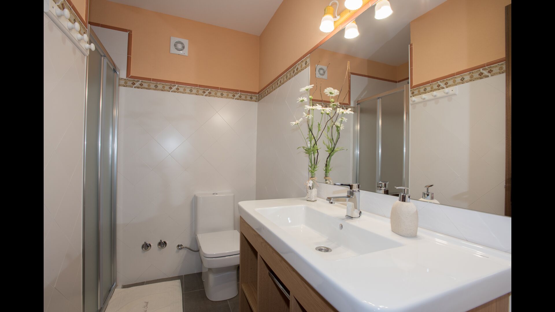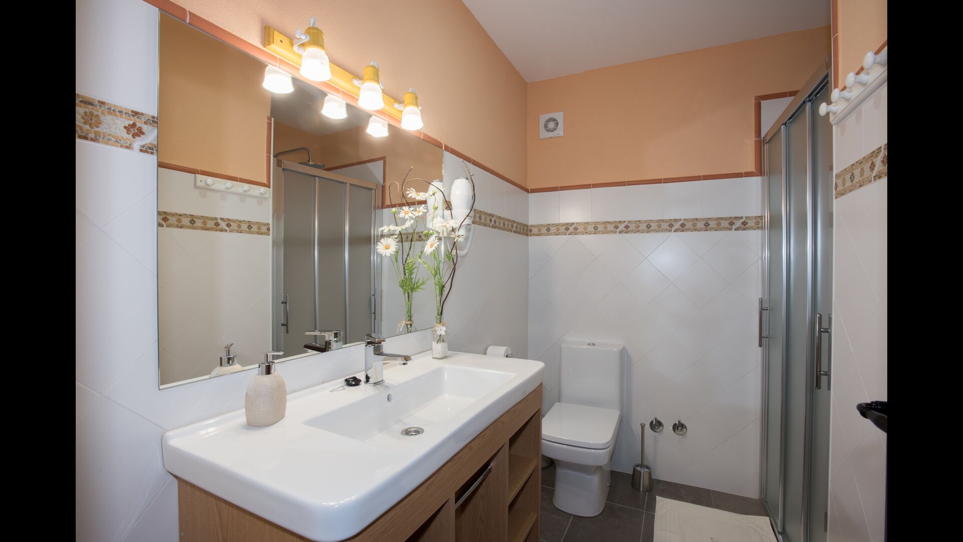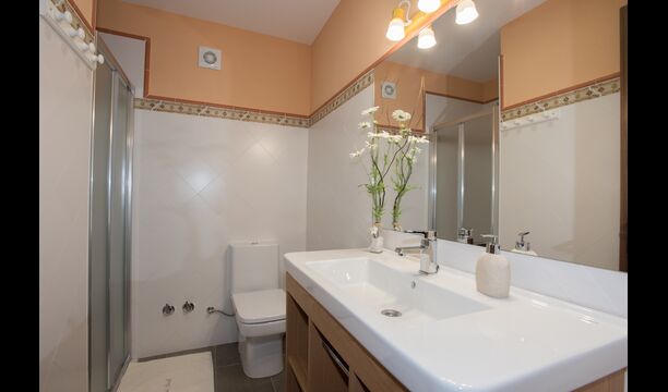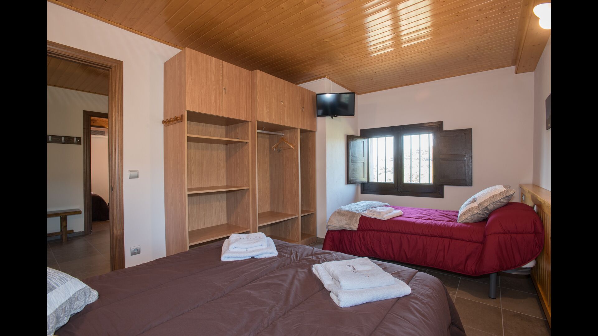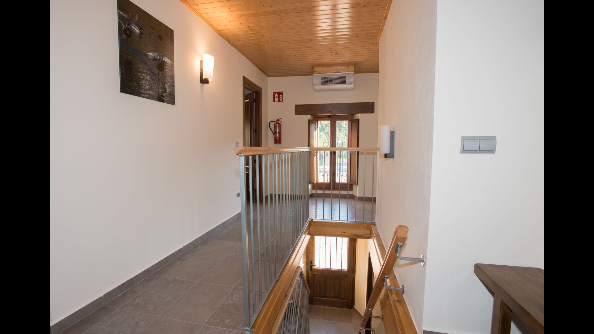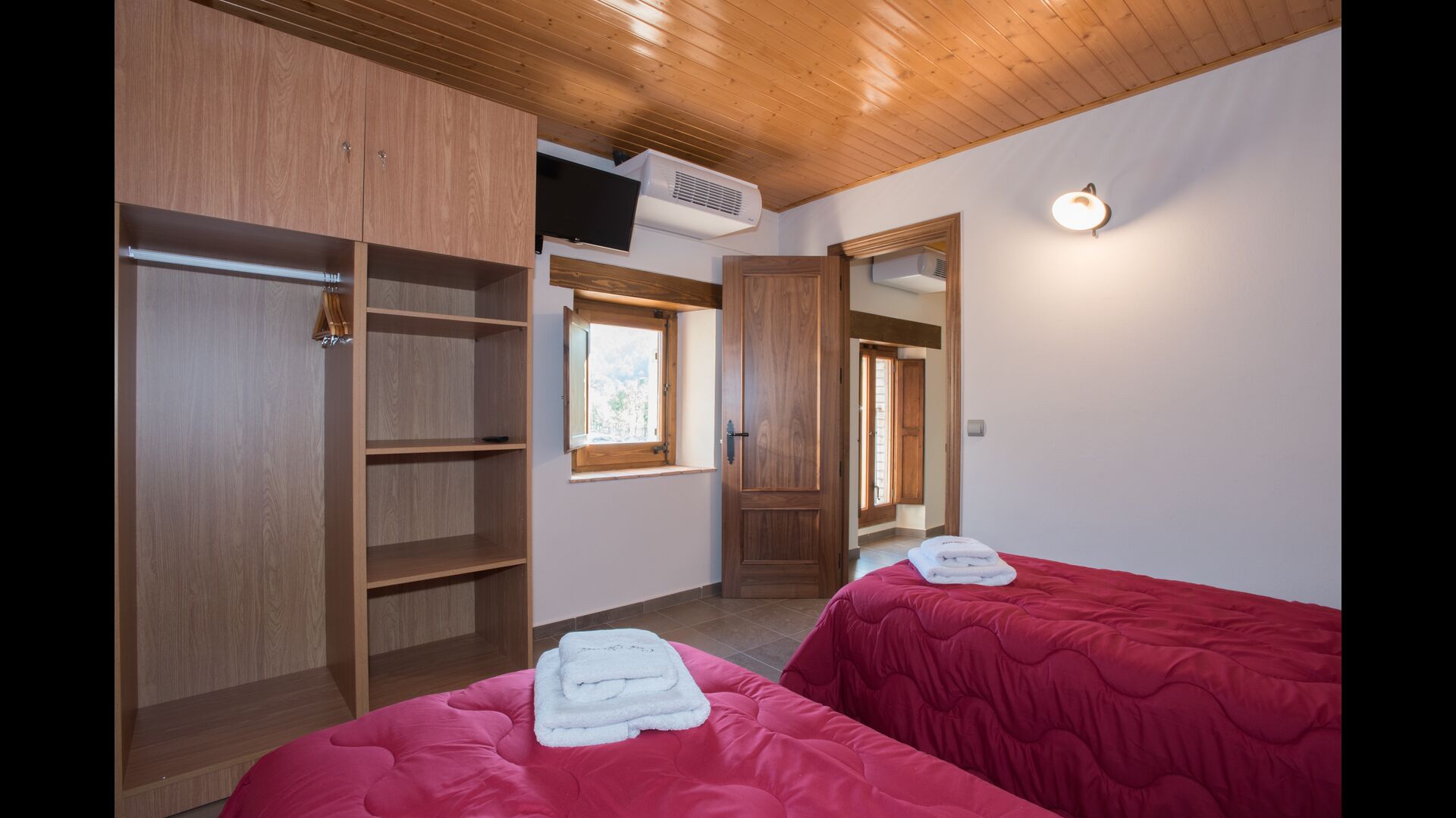 Arriba, se encuentran los 4 dormitorios adicionales, que están equipados para poder alojar a 3 familias ya que hay 2 habitaciones triples y 1 habitación doble y, por último, el cuarto dormitorio se ha convertido en una habitación para niños con dos literas. Hay dos baños en este piso también, por lo que son tres en total. Como uno tiende a pasar un poco de calor, hay aire acondicionado en esa habitación.