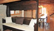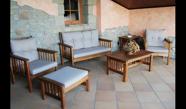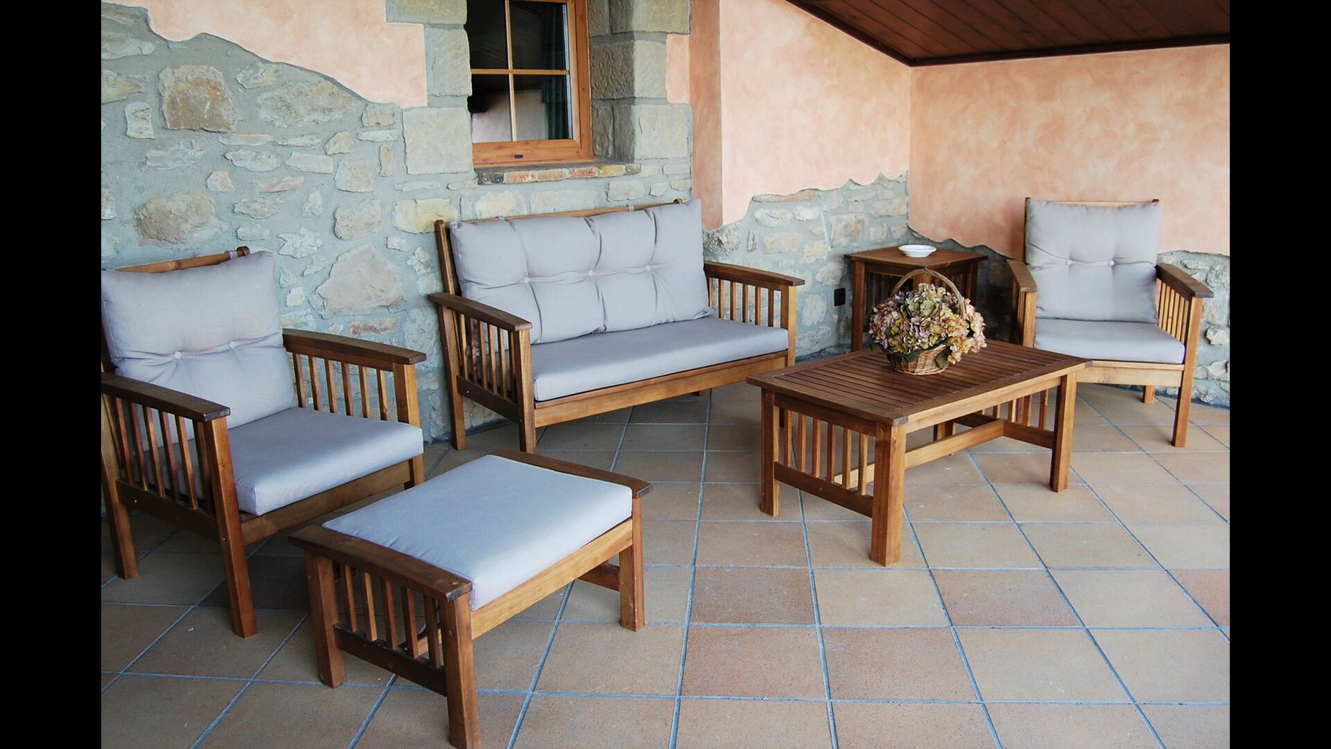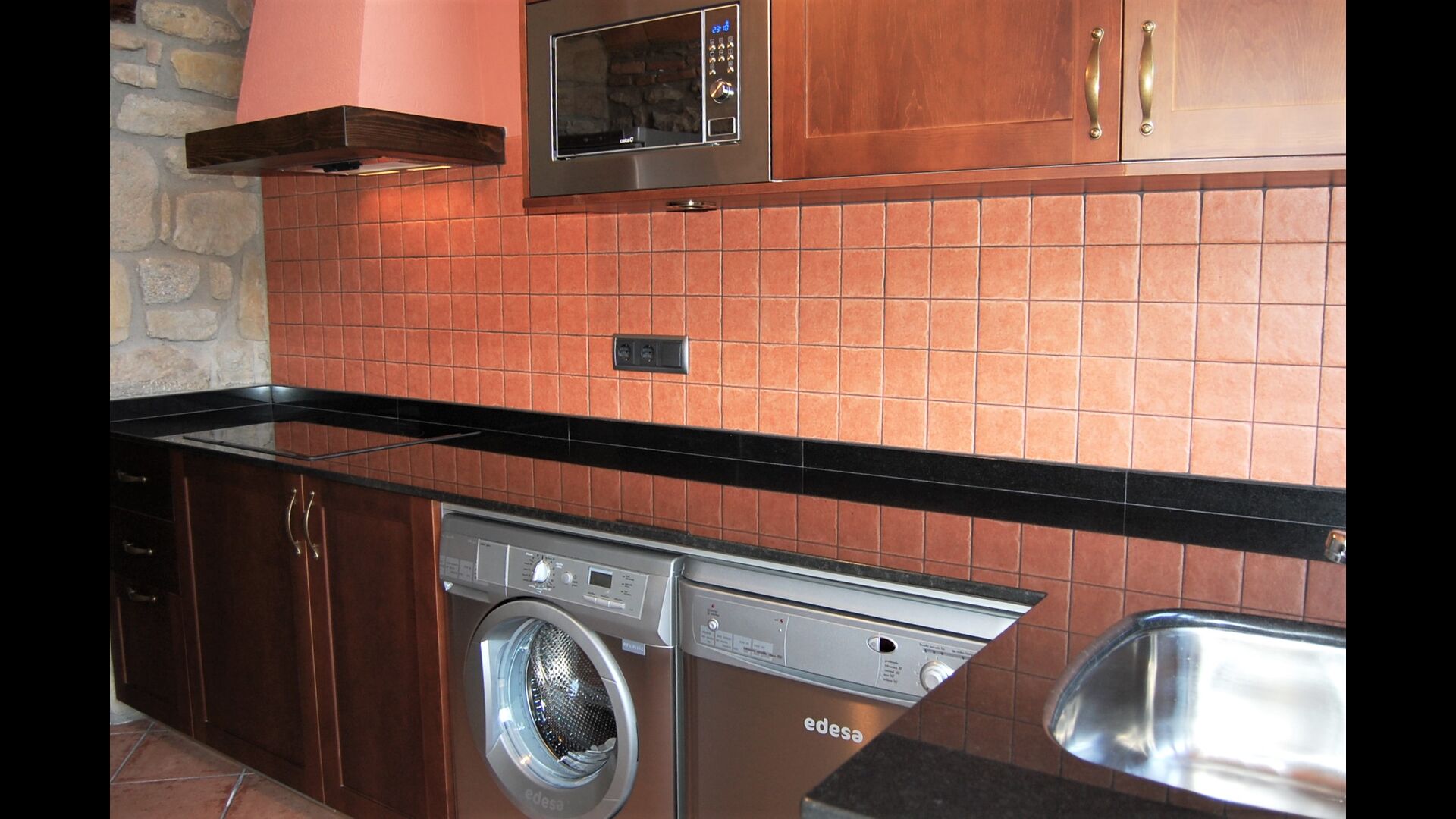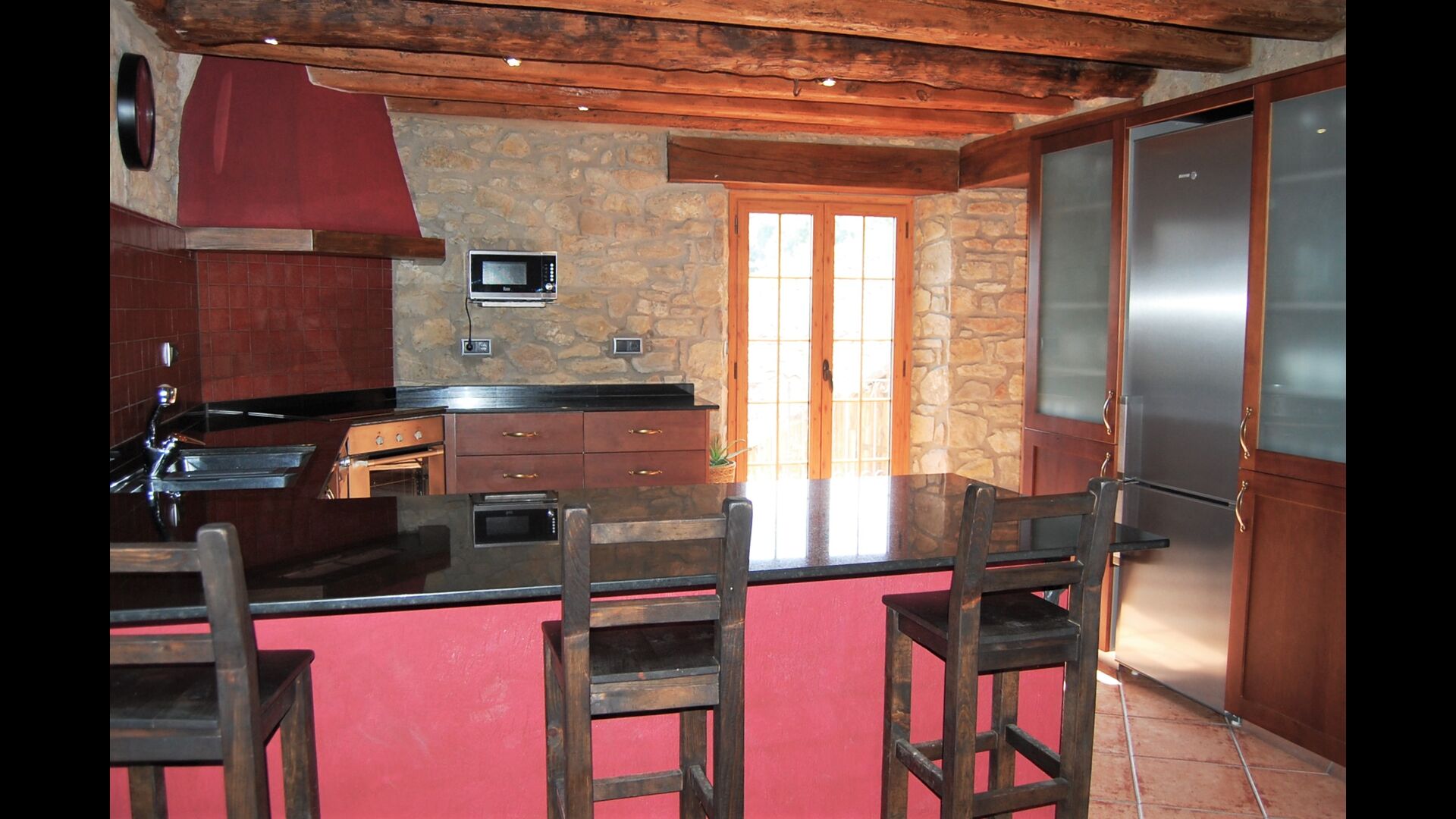 - PRIMER PISO: Comedor-sala de estar con chimenea, cocina equipada con electrodomésticos y utensilios necesarios (placa de inducción, nevera, congelador, horno, microondas, tostadora, cafetera...), aseo, 2 habitaciones con baño, y terrazas con mesa para poder comer en el exterior.
