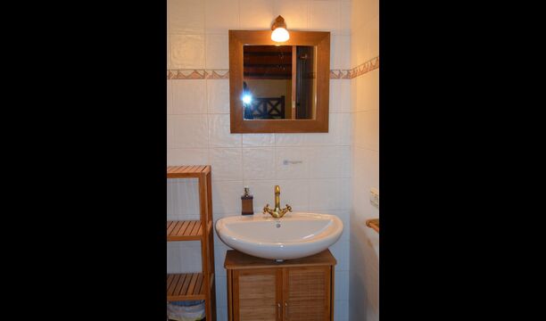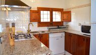 El salón tiene varios sofás. Hay una cocina adyacente al comedor y adyacente a la sala de estar (idéntica pero reflejada). La cocina cuenta con todas las comodidades modernas, como lavavajillas, horno, microondas, tostadora, nevera y congelador. La casa de vacaciones también cuenta con una lavadora.