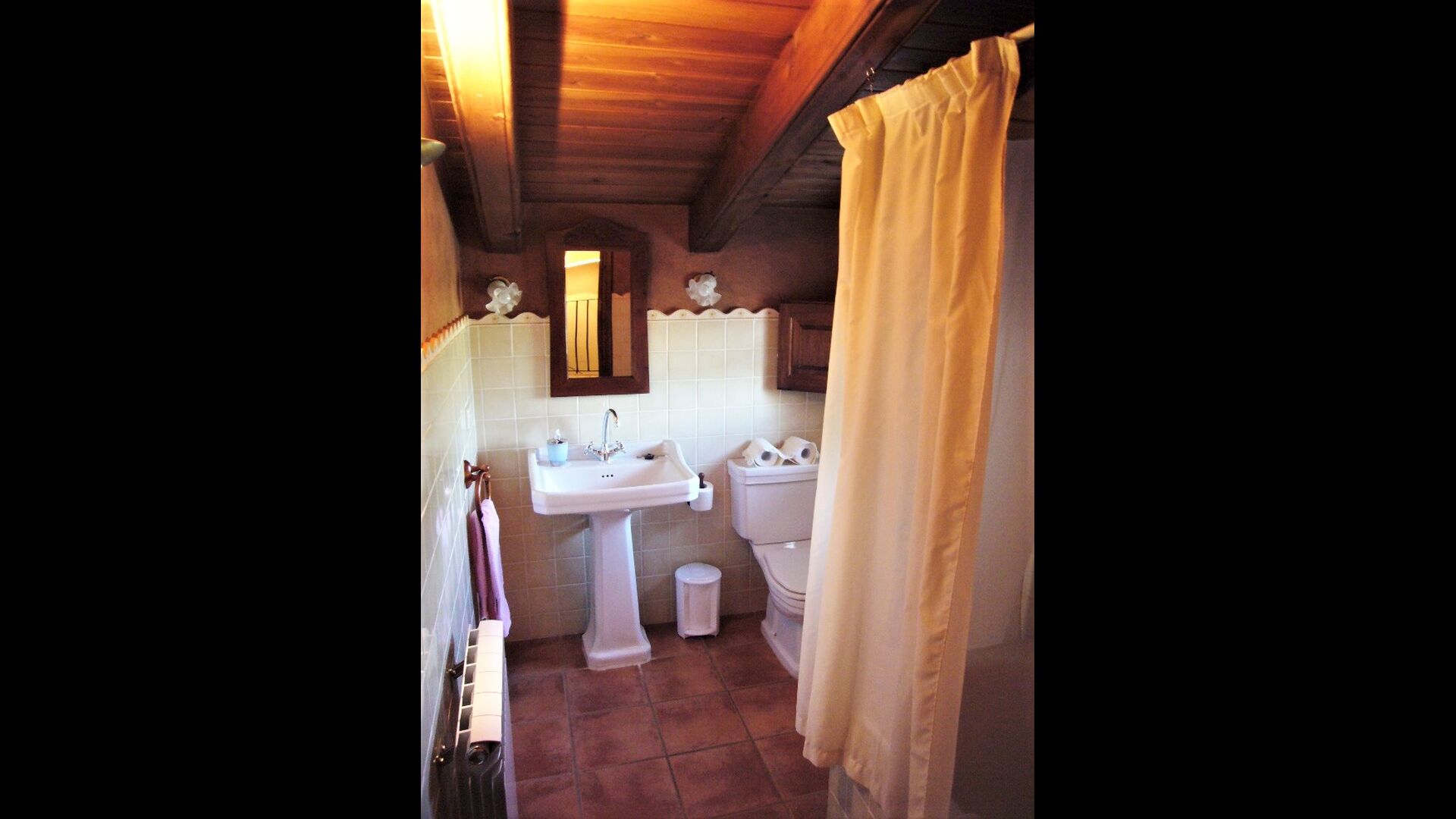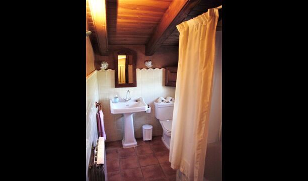 En el primer piso hay 4 habitaciones dobles. Las camas están hechas de madera y tienen un diseño muy clásico y son muy suaves. Todas las habitaciones tienen un techo inclinado de madera, lo que da una sensación de amplitud. Aquí hay 2 baños para compartir. También hay una bañera.