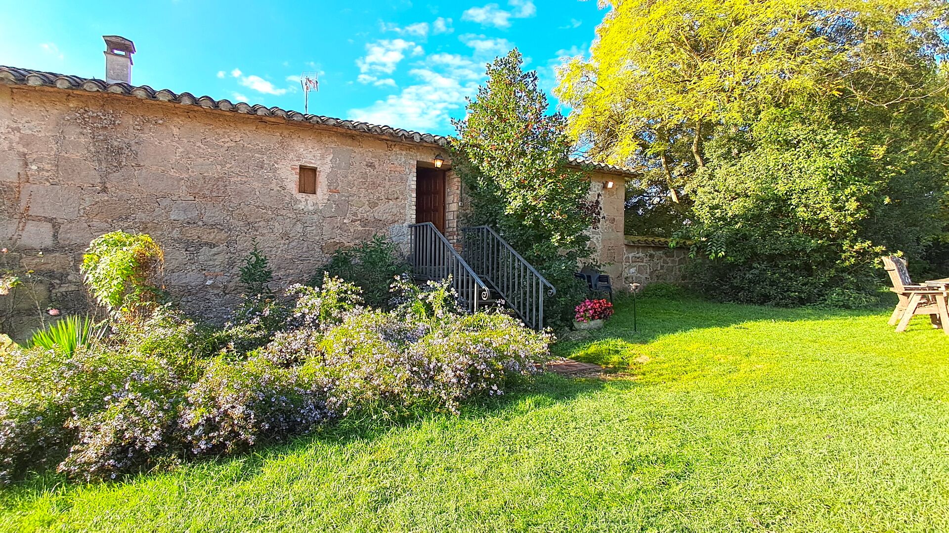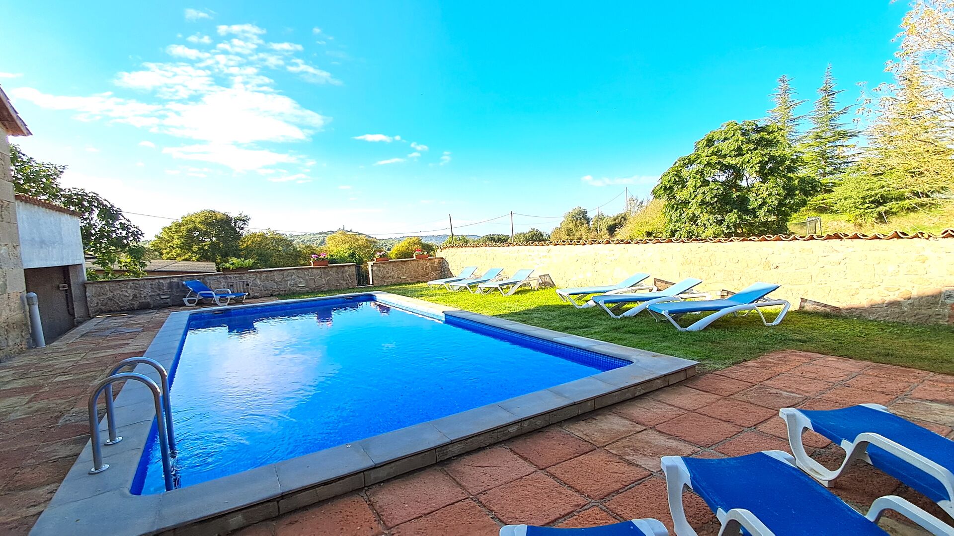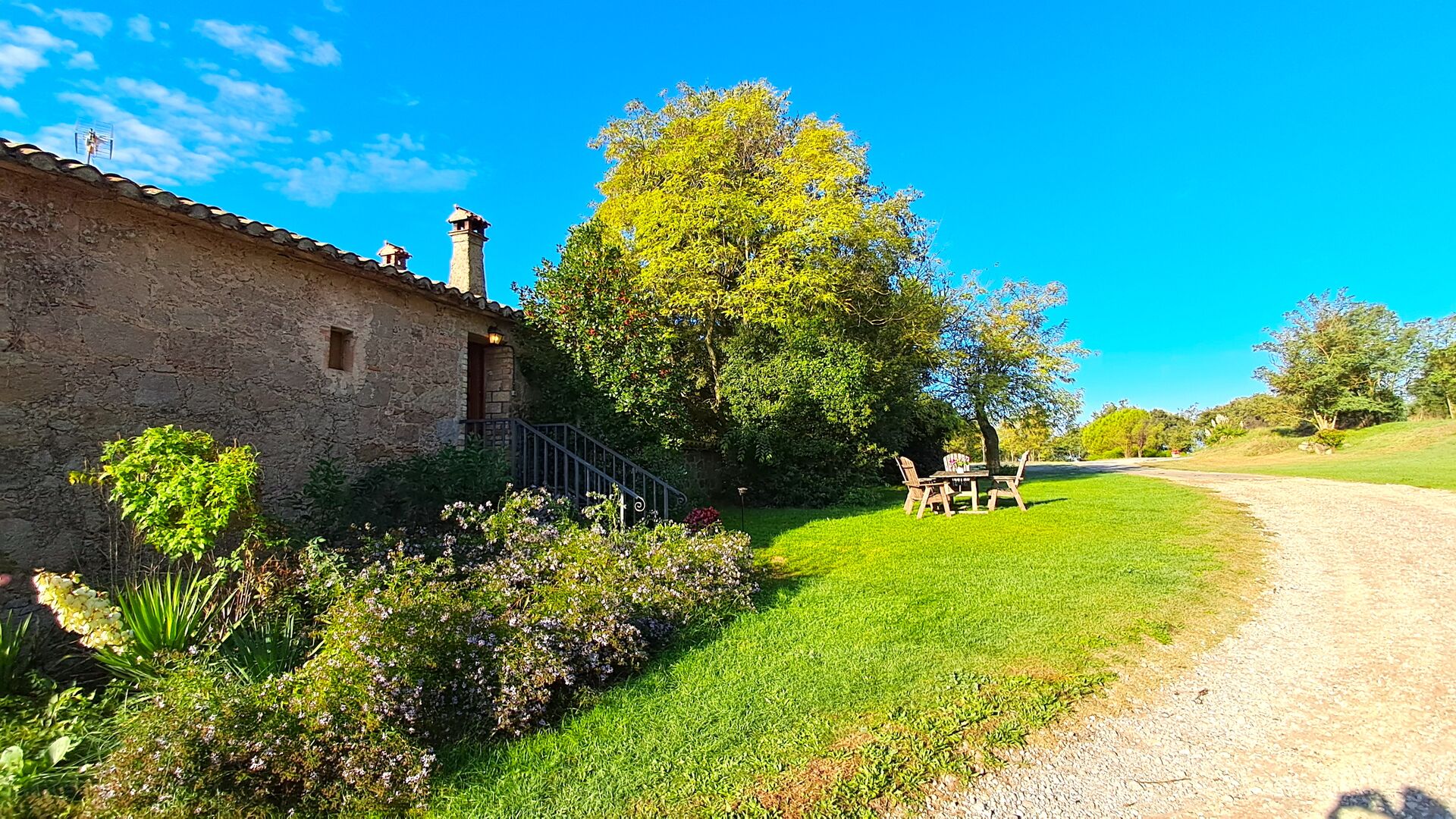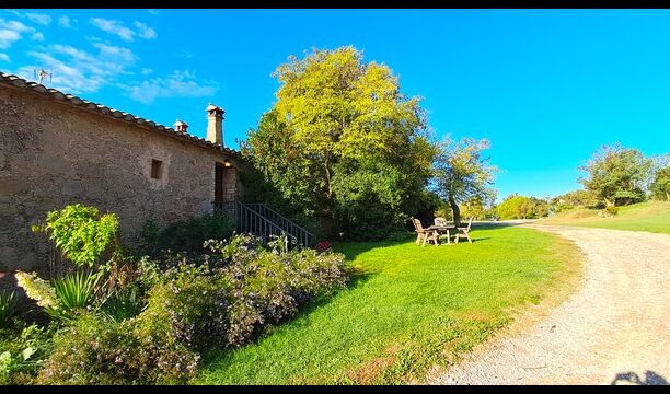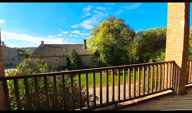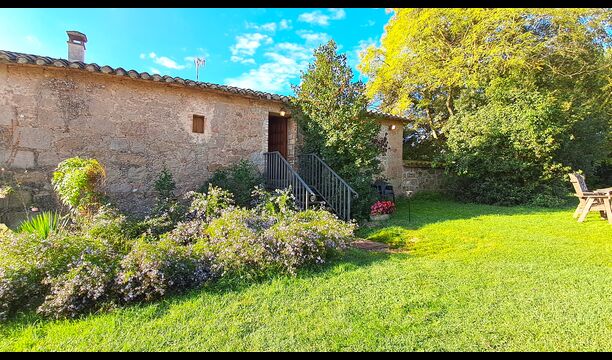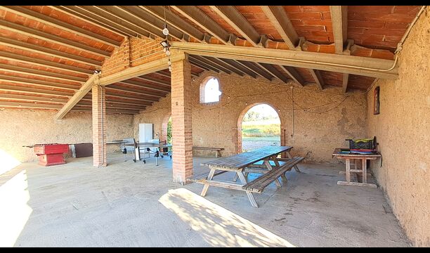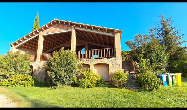 En el exterior, la casa está rodeada de césped y árboles. Hay una gran zona de terrasse / actividad ideal para comer al aire libre y una bonita vista sobre el paisaje catalán. El jardín muy bonito tiene su propia pista de tenis privada (concreto) y un campo de fútbol.