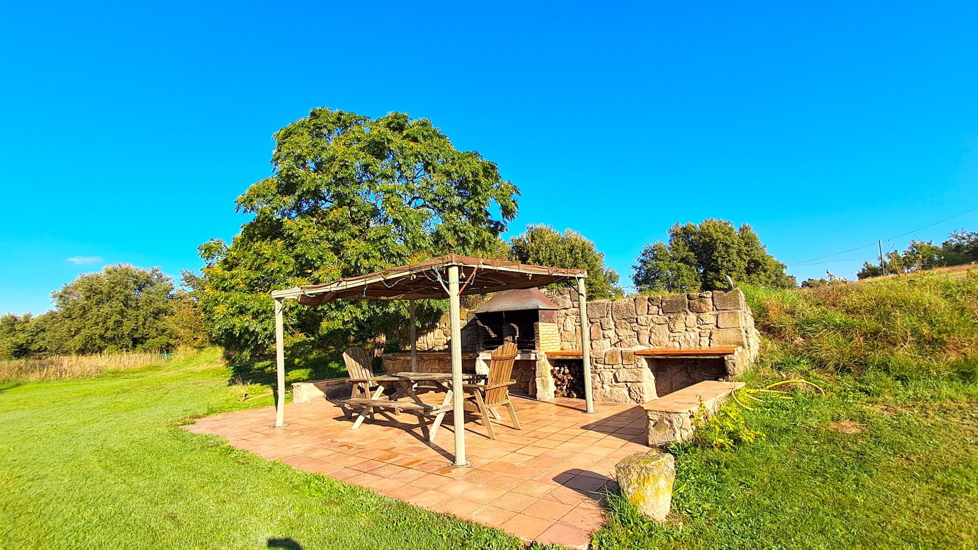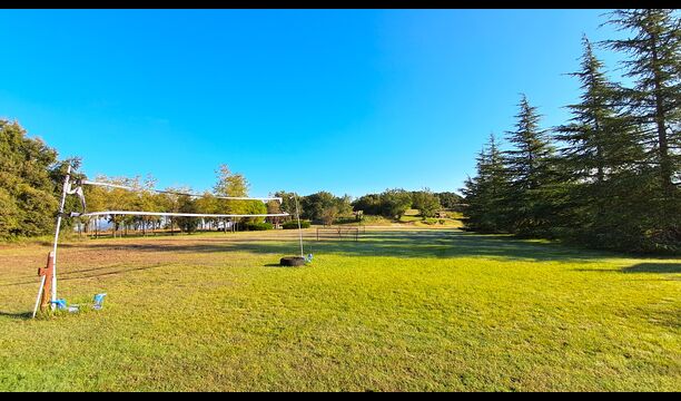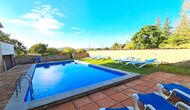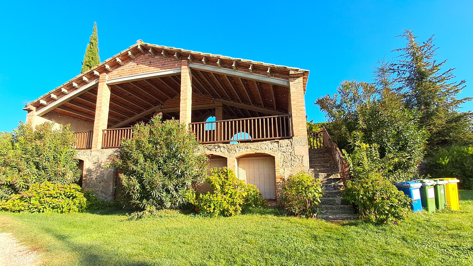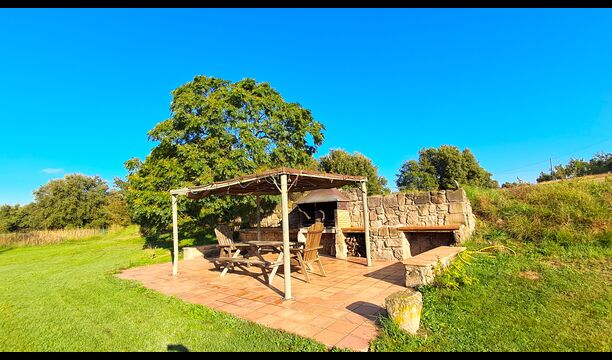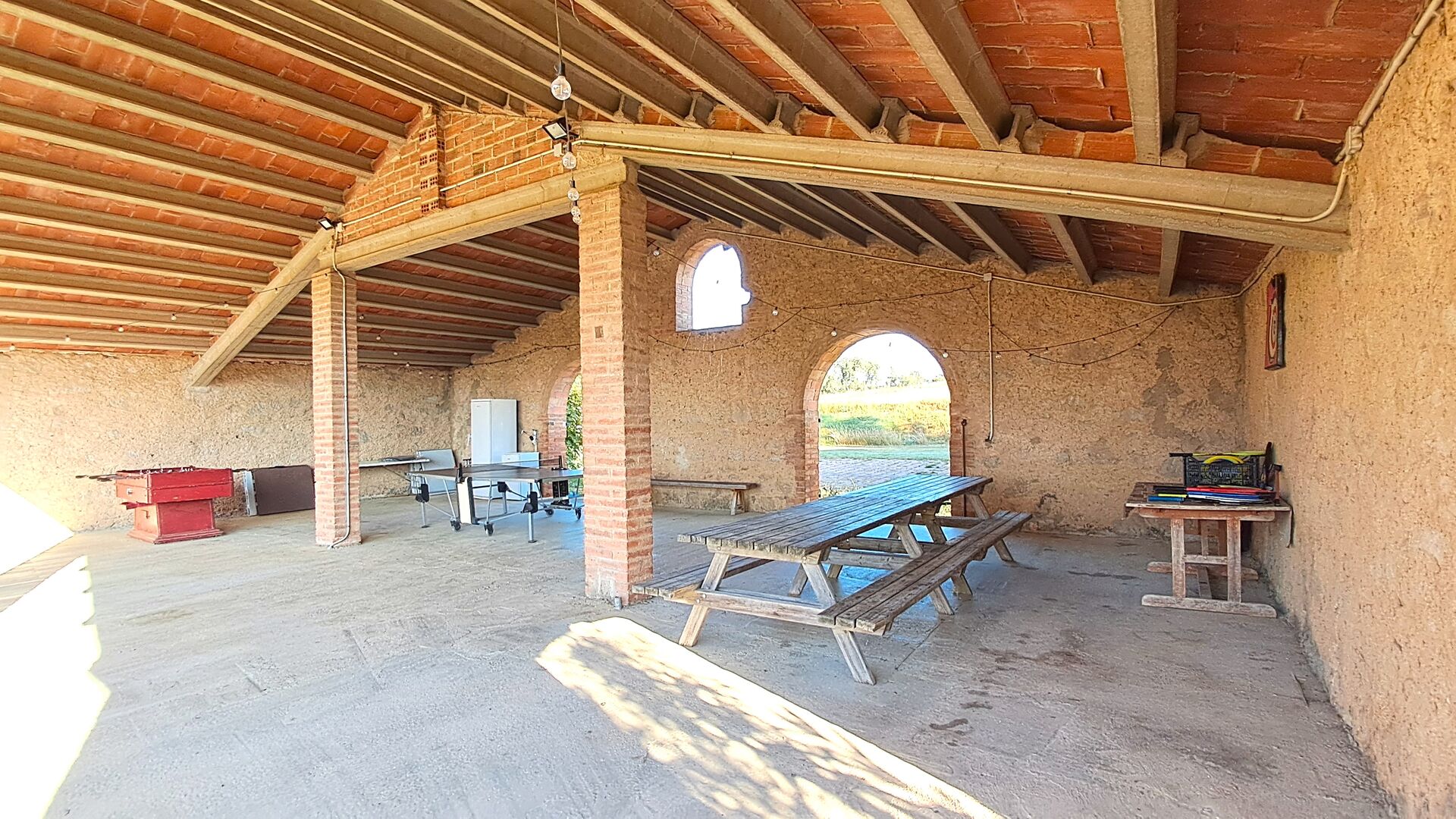 En el exterior, la casa está rodeada de césped y árboles. Hay una gran zona de terrasse / actividad ideal para comer al aire libre y una bonita vista sobre el paisaje catalán. El jardín muy bonito tiene su propia pista de tenis privada (concreto) y un campo de fútbol.