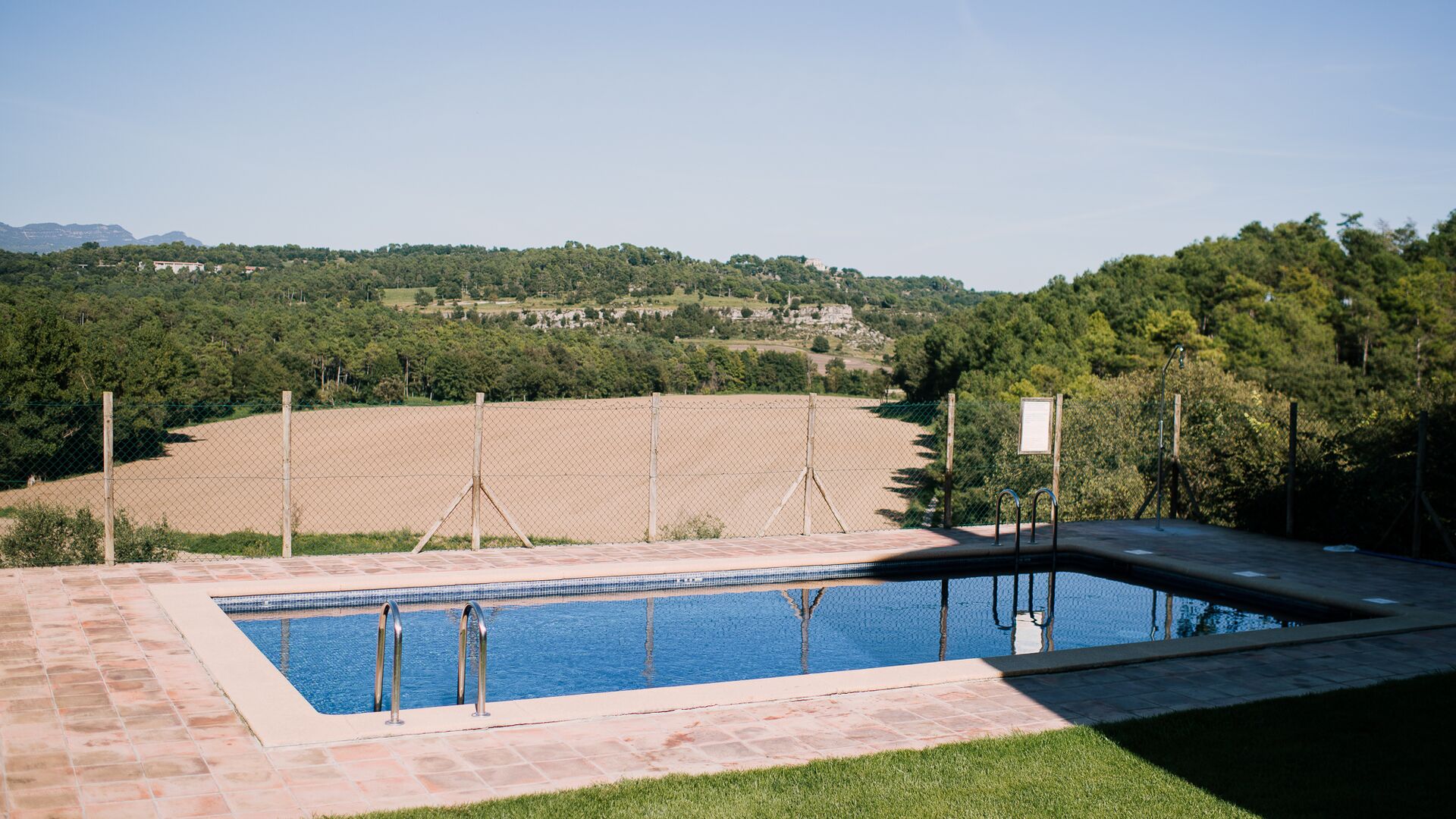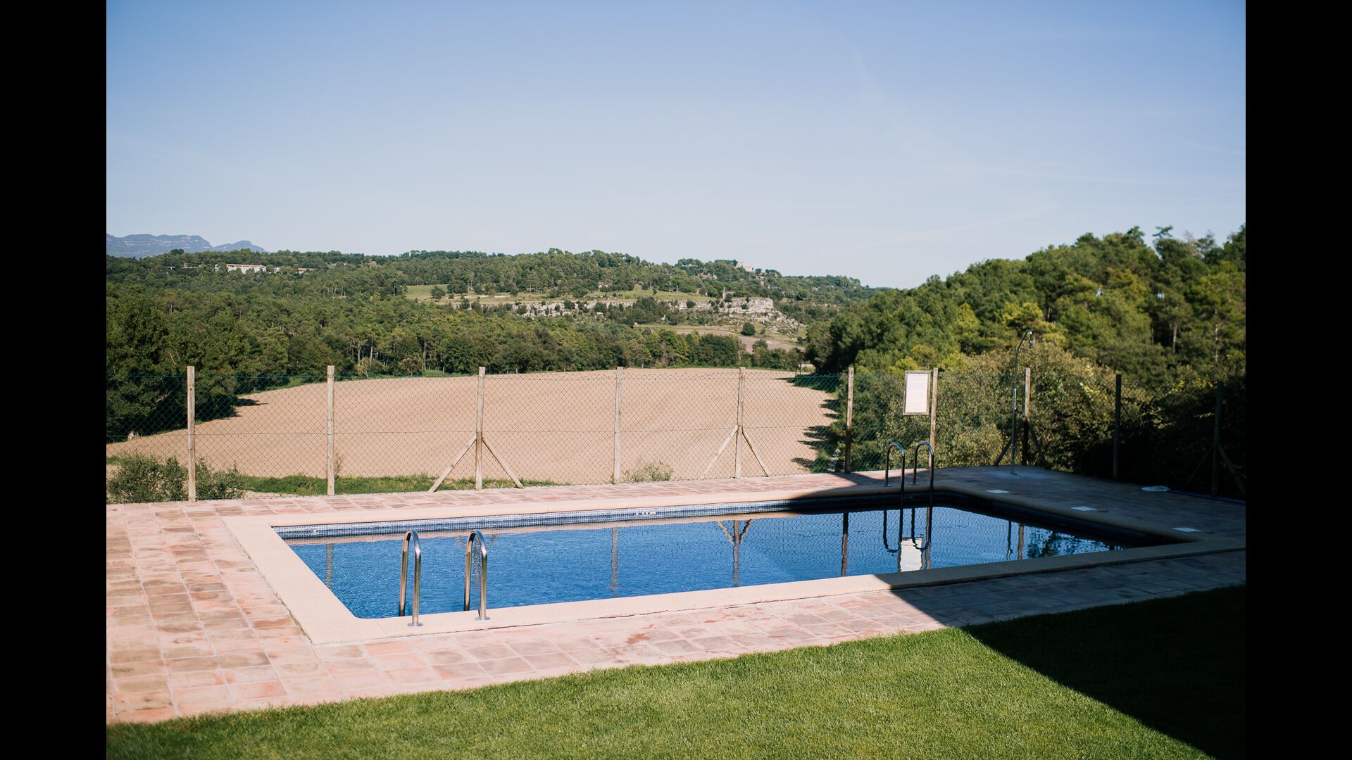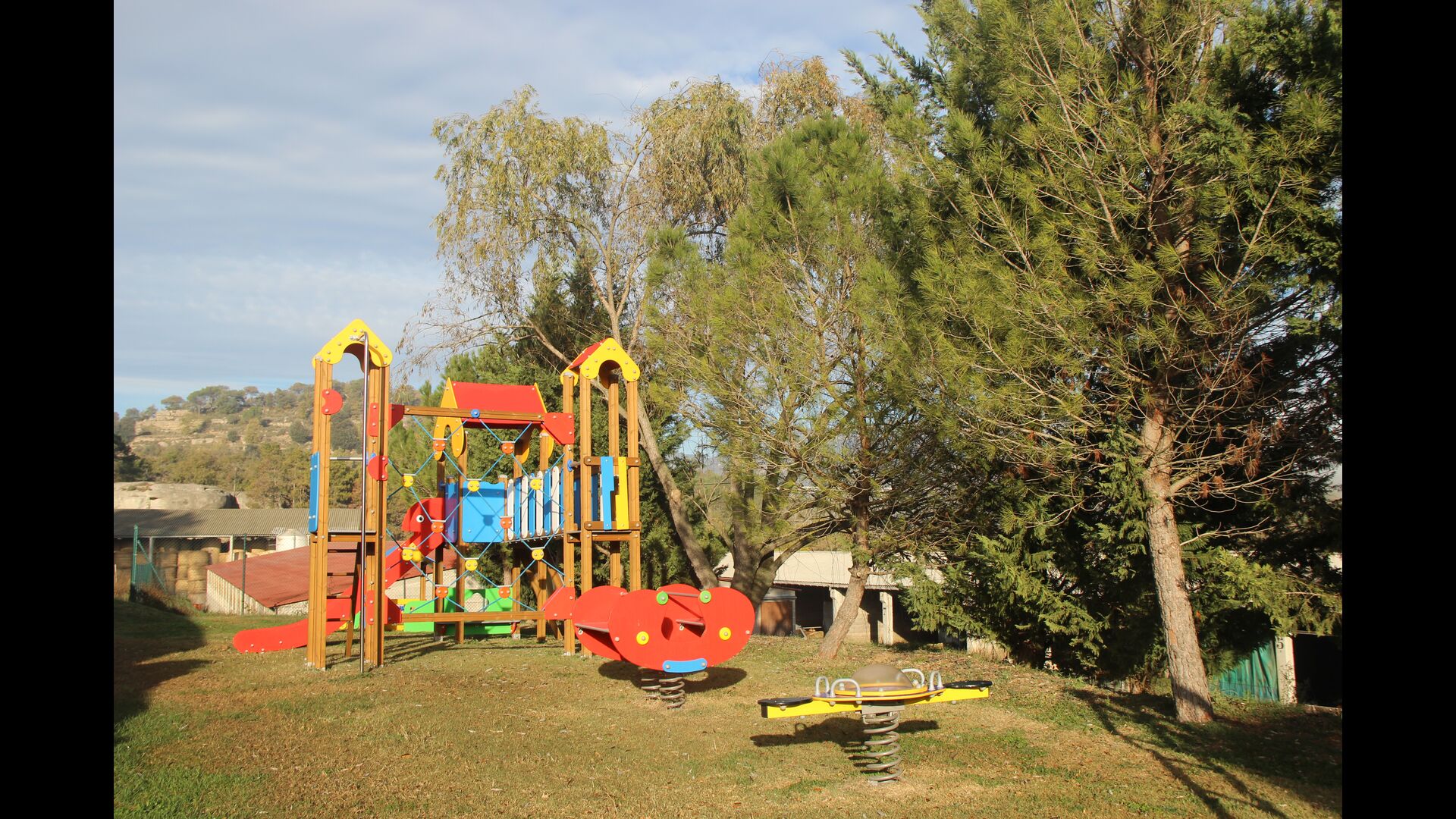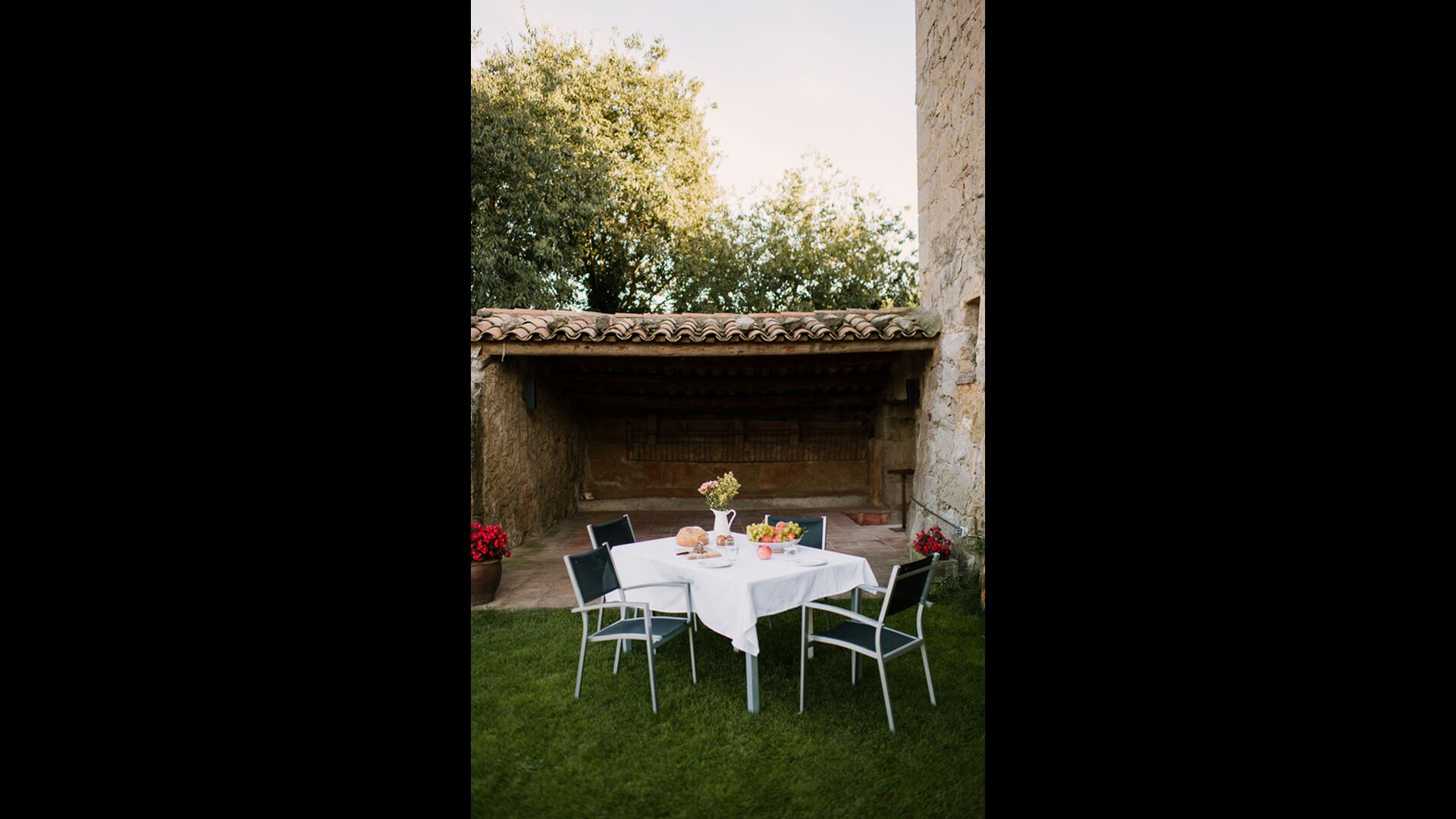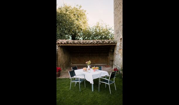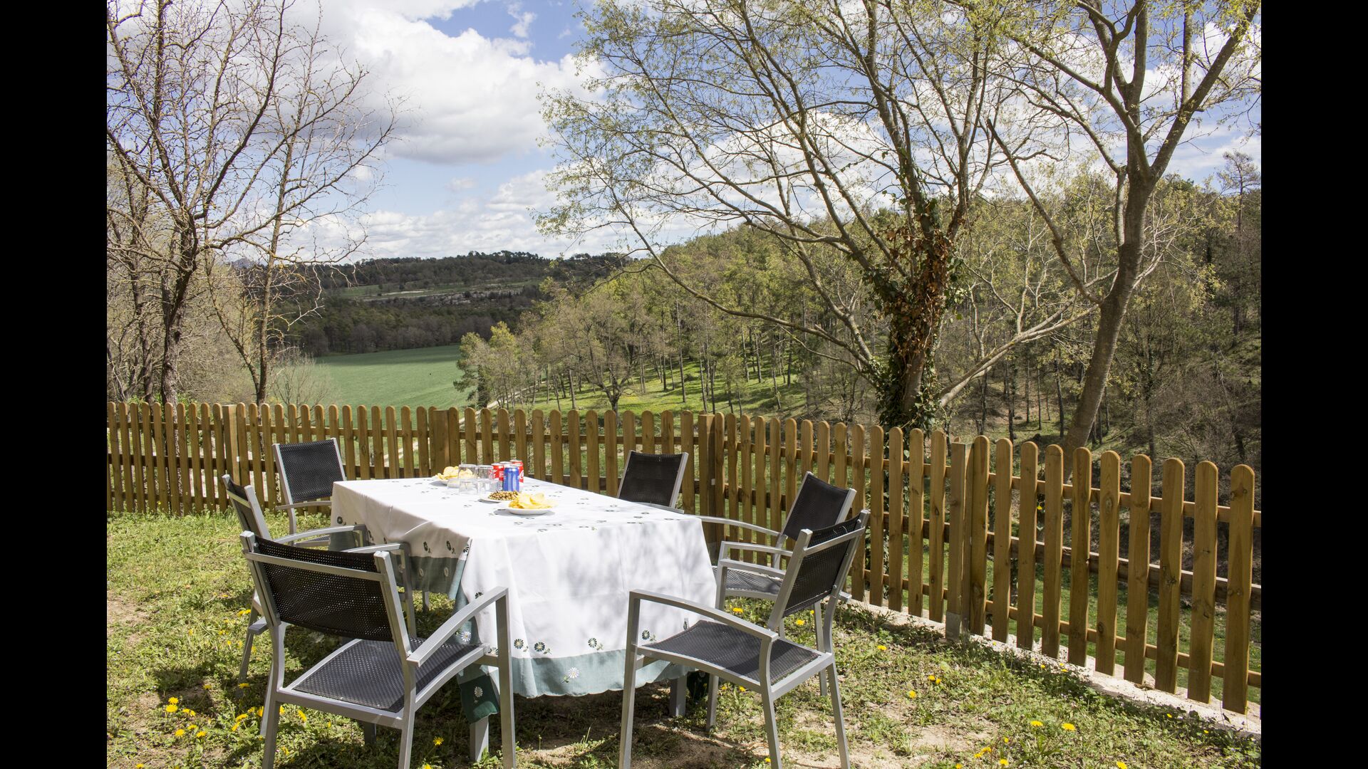Alrededor de la casa, hay una terraza cubierta con una mesa para comer y también una barbacoa. Por el otro lado de la casa, puedes encontrar la piscina y un jardín con césped. Desde la casa, hay una puerta directa que va al jardín, por lo tanto no habrá que rodear la casa para acceder en ella. Desde las tumbonas tienes unas excelentes vistas a los campos y en el fondo puedes ver los Pirineos. La entrada a la zona de la piscina esta cerrada por una puerta para proteger a los niños pequeños.