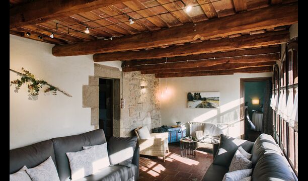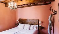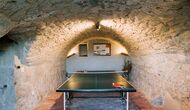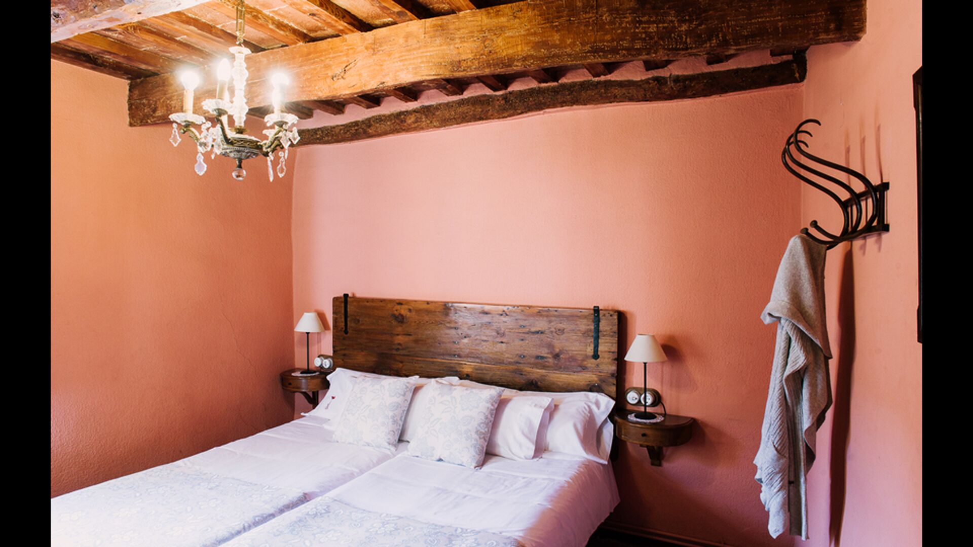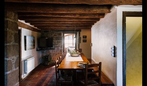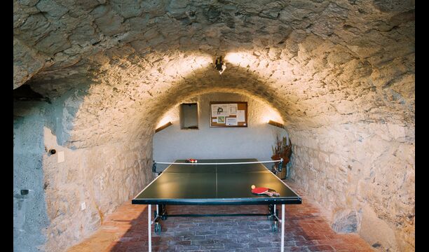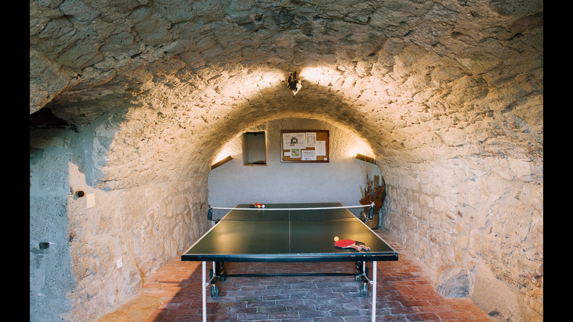 Entras en la planta baja de la casa por una bonita entrada. Previamente, esta zona era donde había los animales, pero esta area es ahora un increíble camino transformado en dos suits con cama doble y baño privado, todo con un diseño de interior moderno. A la planta baja, también hay una sala con una mesa de ping-pong.