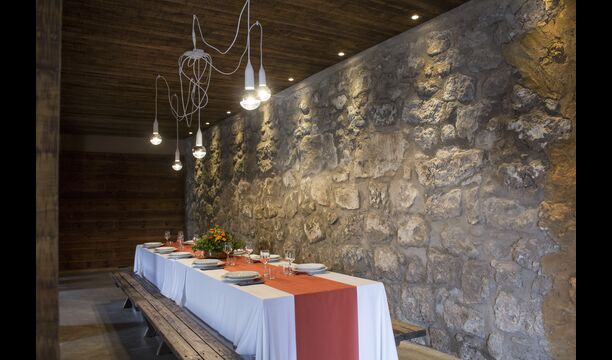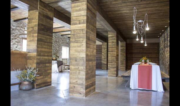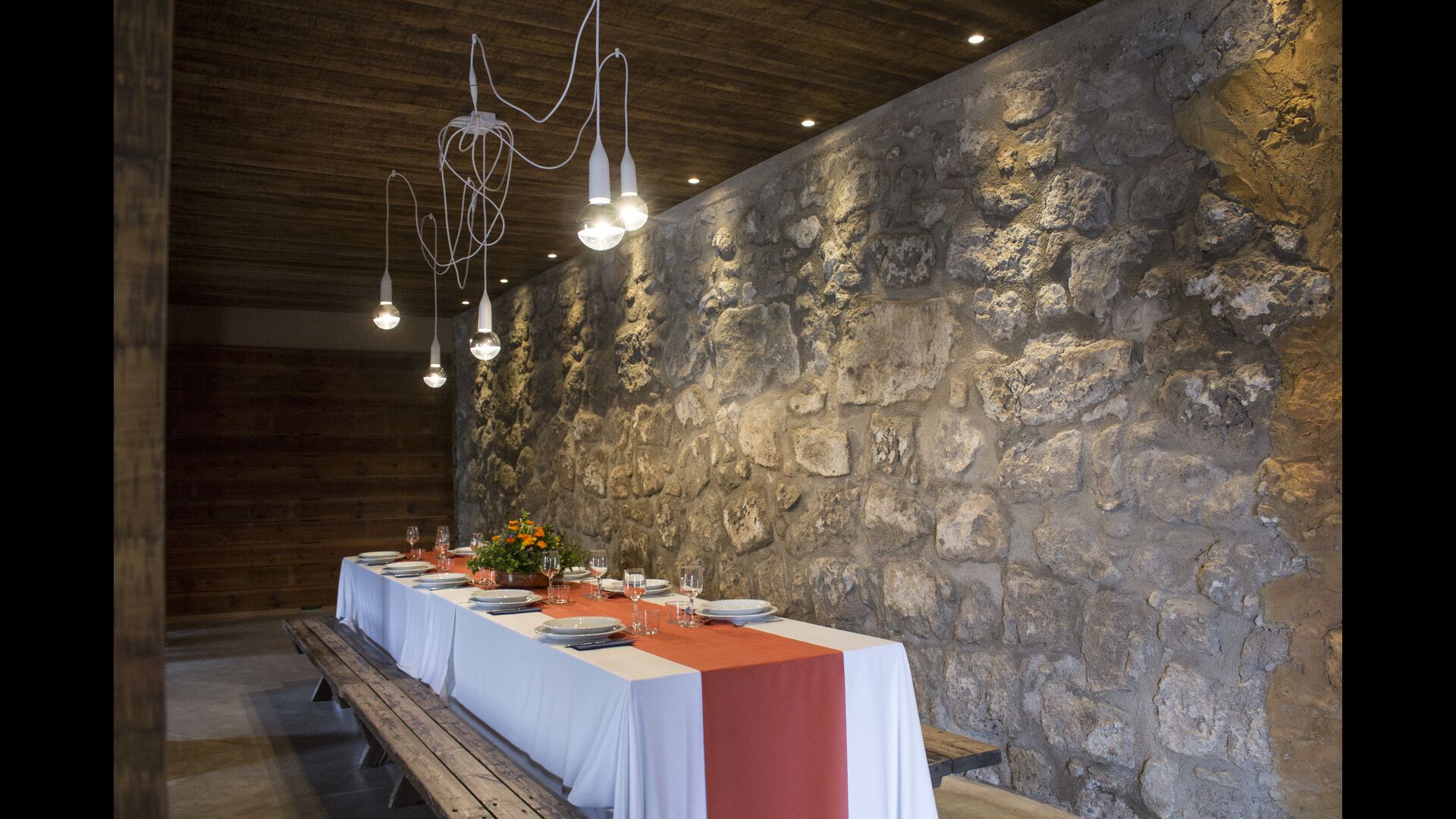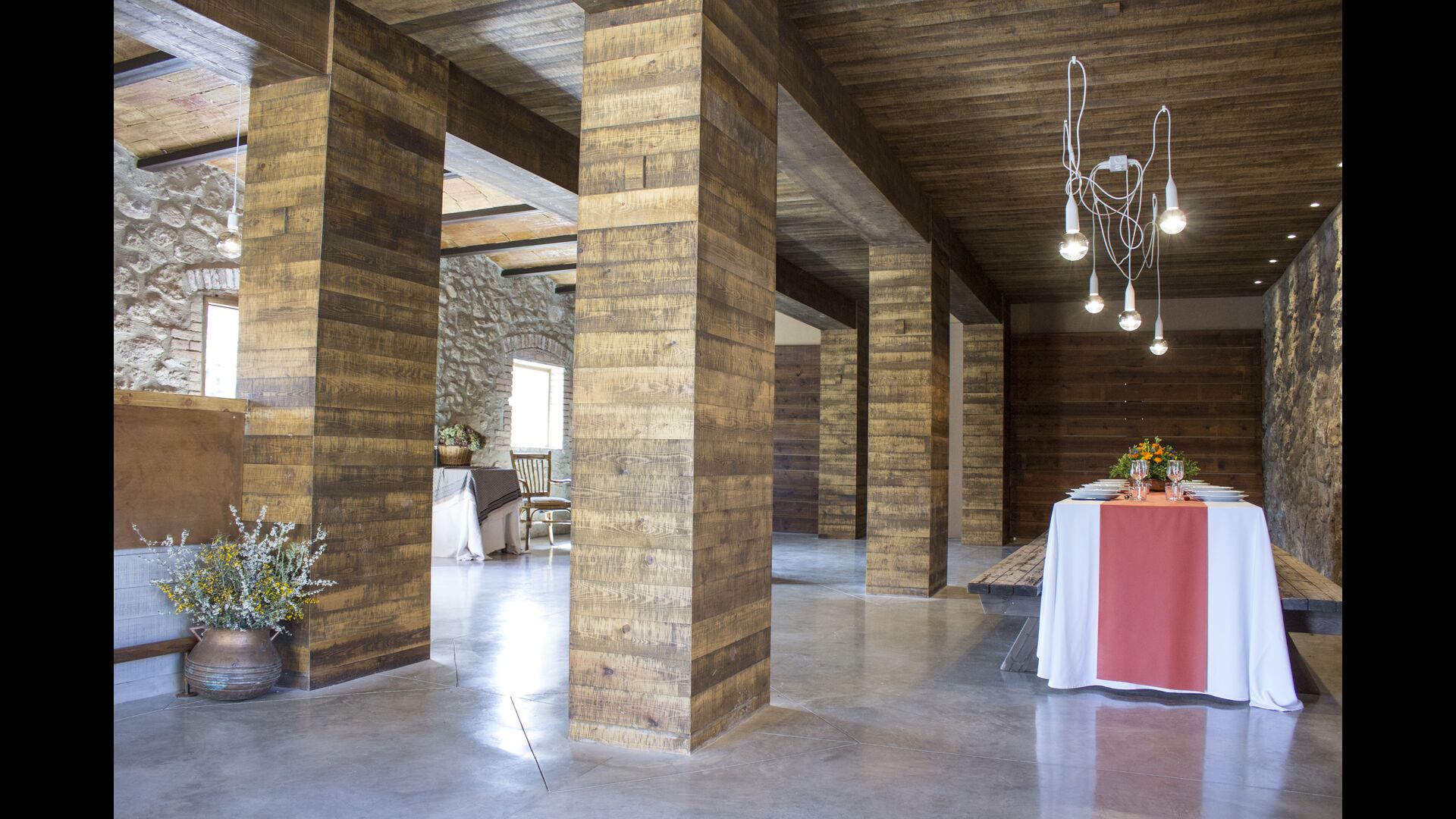 A la parte de delante de la casa, hay una sala polivalente con una barra, una pica y una nevera, y también con dos mesas grandes con bancos, donde podréis reuniros, comer o hacer una pequeña celebración.