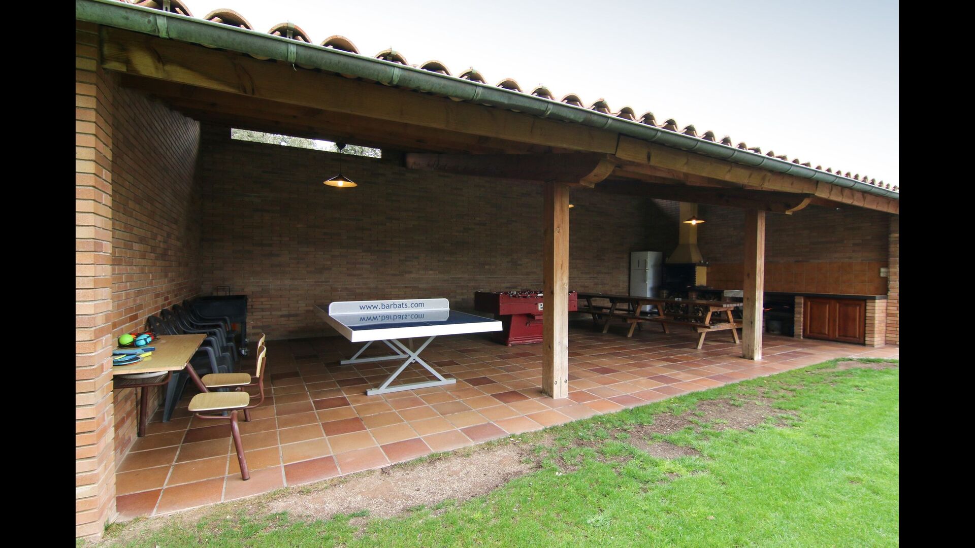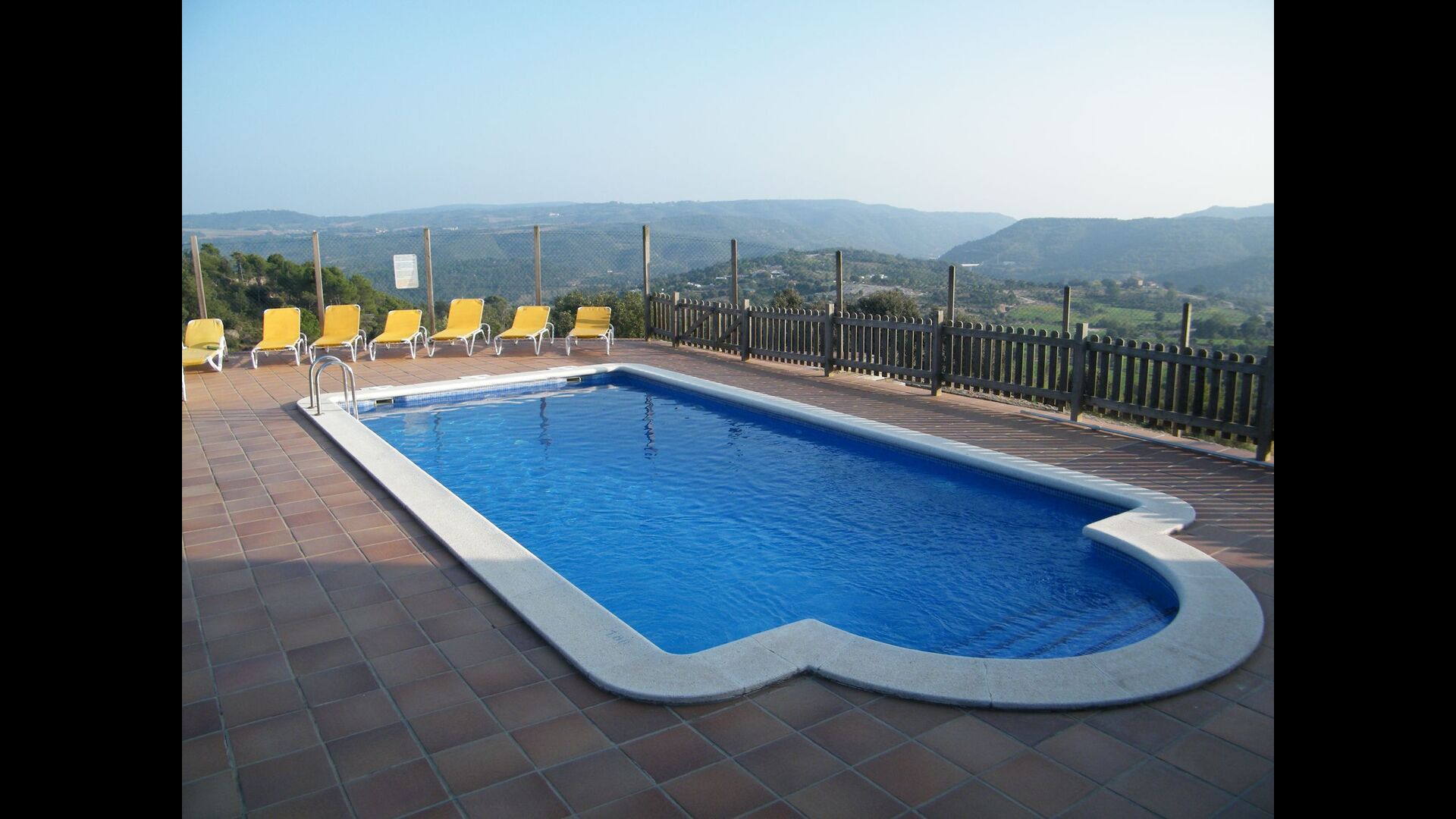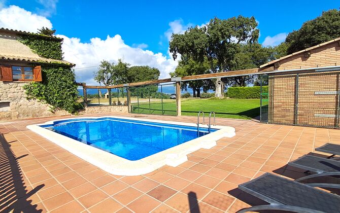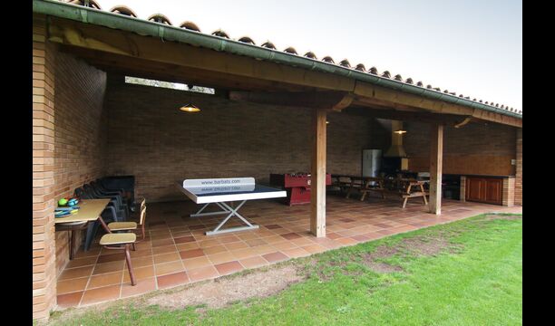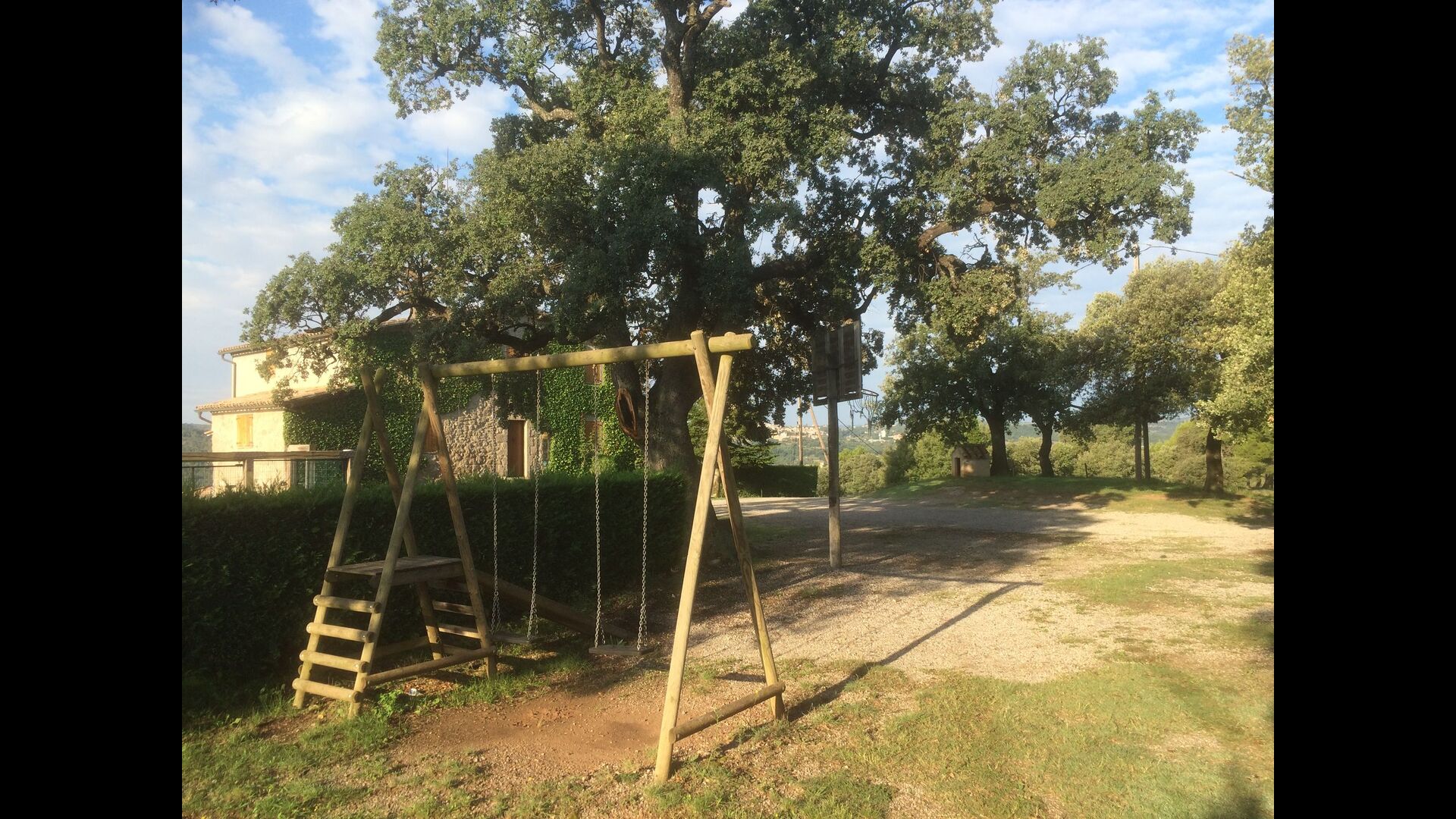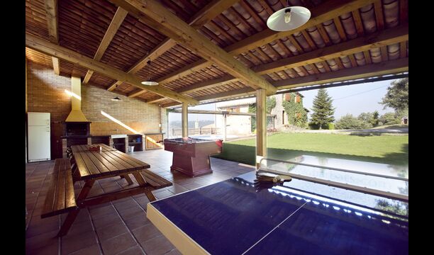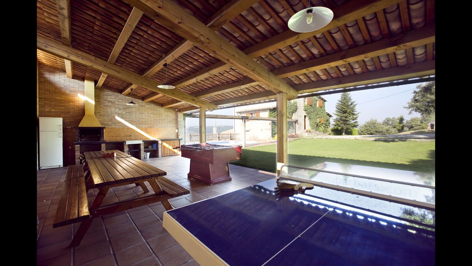 Las zonas al aire libre están muy bien, ya que hay una gran piscina con tumbonas y una terraza cubierta con cocina al aire libre justo al lado. La piscina se puede disfrutar especialmente durante el día, cuando el calor catalán se puede complementar con una inmersión en el agua refrescante. También está cercado, lo cual es muy bueno cuando tienes niños pequeños en vacaciones. La terraza cubierta tiene un fregadero, parrillas para barbacoa, leña y herramientas. Aquí puede cocinar comida casera. Luego se puede disfrutar en la mesa de madera muy larga y hermosa al lado. Hay muchas instalaciones en el jardín: columpios, básquetbol, tenis de mesa, futbolín y mucho espacio. Por otra parte, los robles viejos y grandes que crecen alrededor dan muchos rincones sombríos donde realmente puede relajarse.
