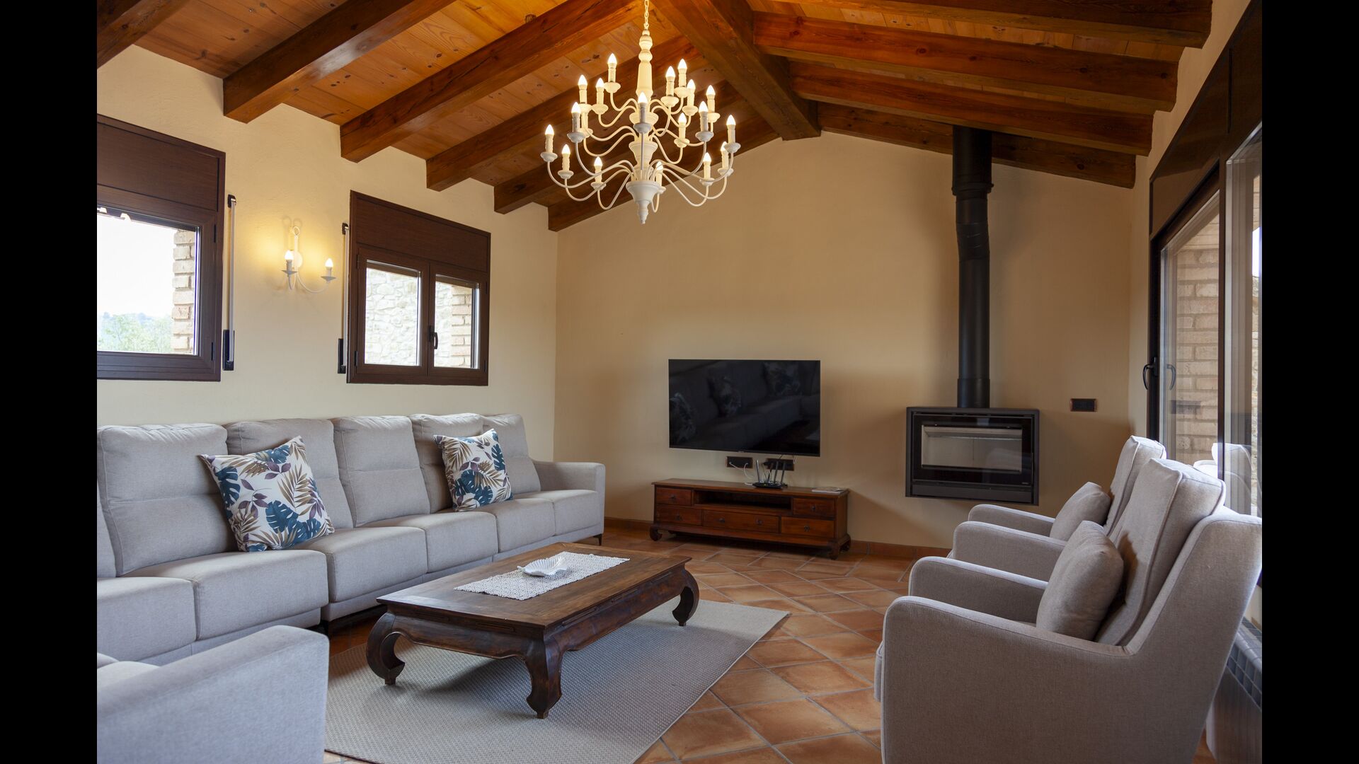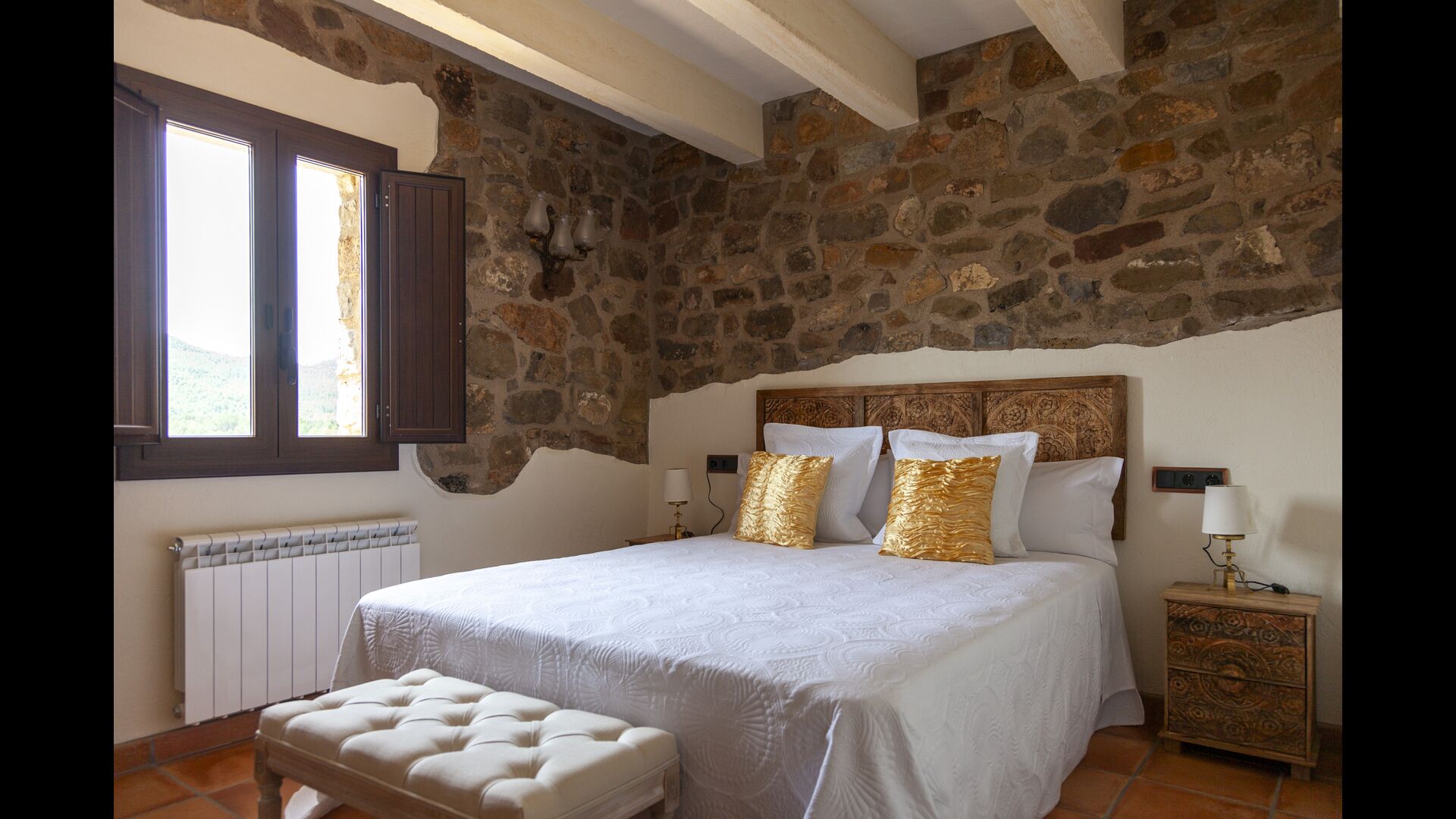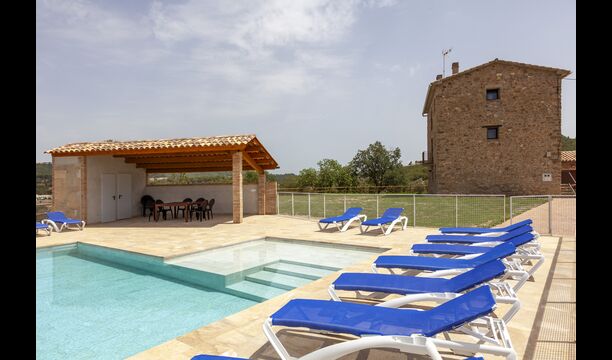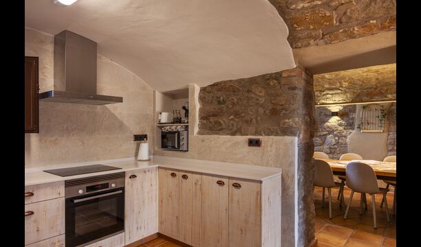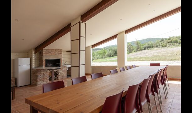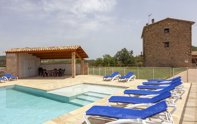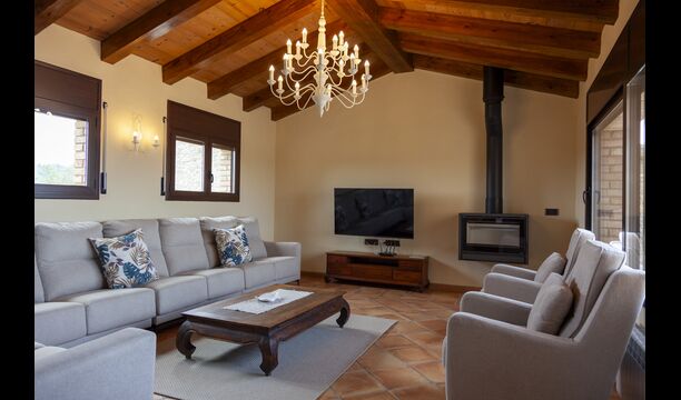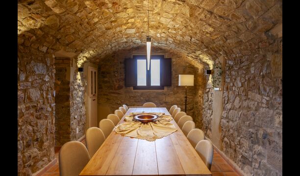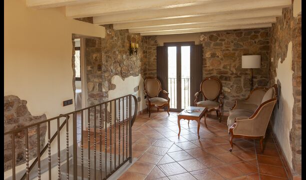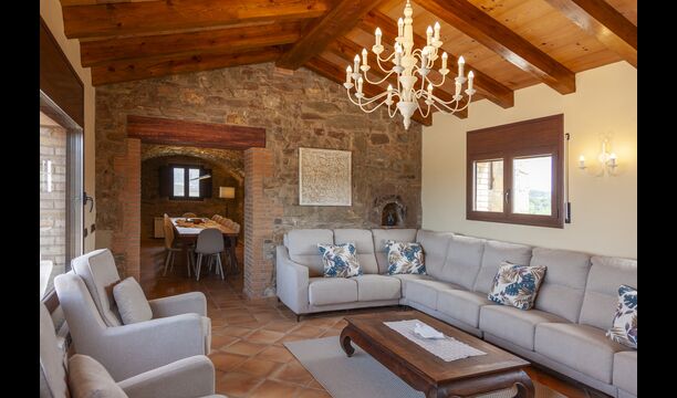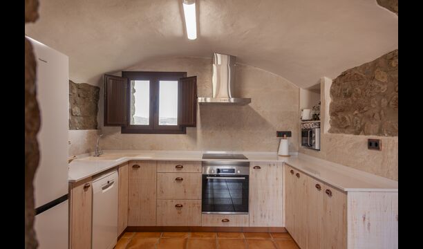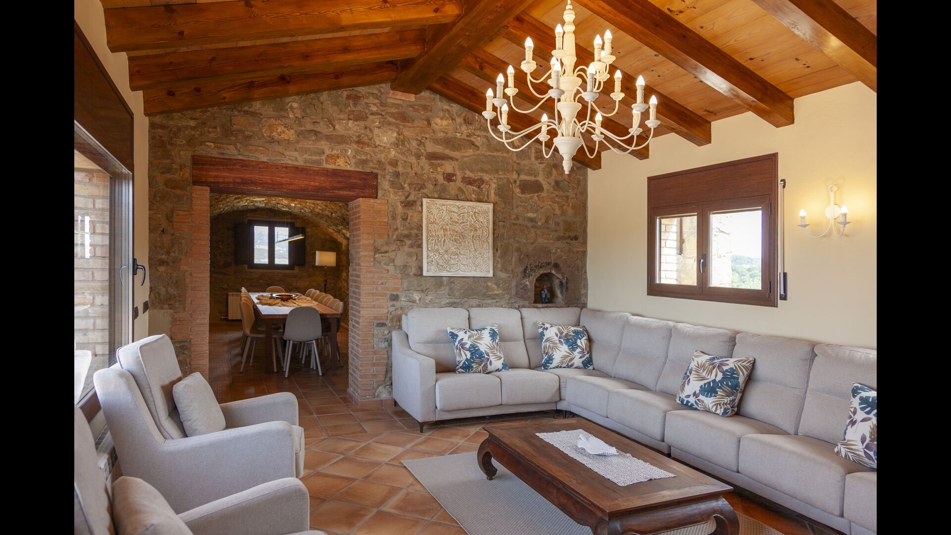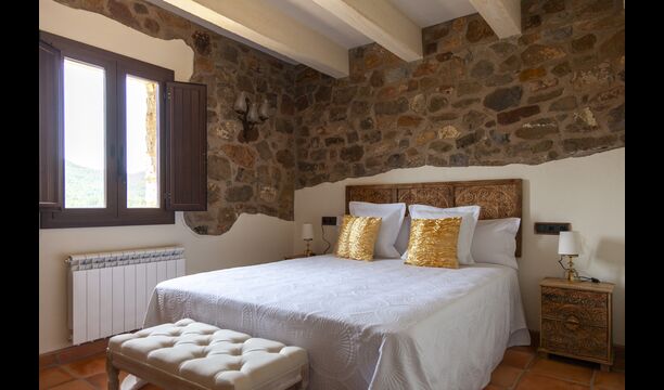 La casa está diseñada para alojar hasta 16 personas con 8 habitaciones dobles y 5 baños, garantizando una estancia espaciosa y cómoda. Sus interiores combinan a la perfección el encanto rústico con las comodidades modernas, con paredes de piedra, vigas de madera y un mobiliario elegante que crea un ambiente cálido y acogedor.