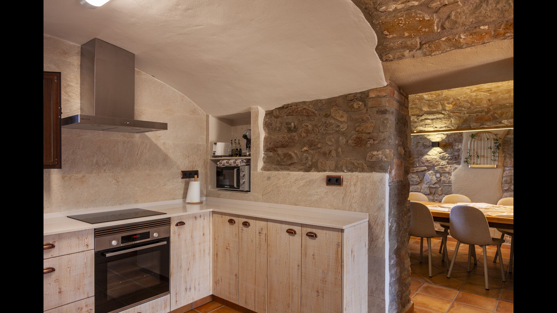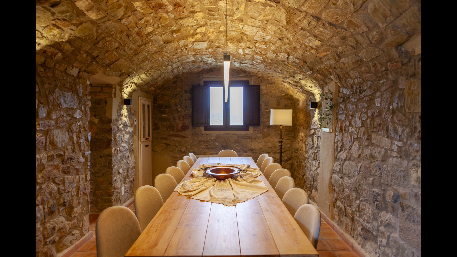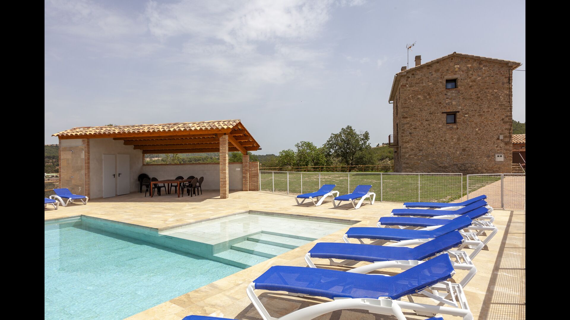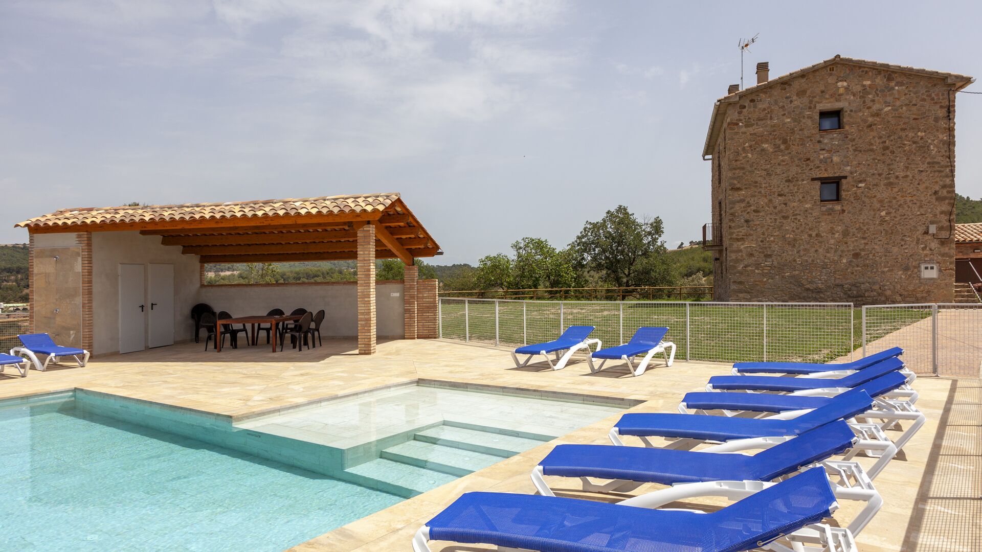 La casa está diseñada para alojar hasta 16 personas con 8 habitaciones dobles y 5 baños, garantizando una estancia espaciosa y cómoda. Sus interiores combinan a la perfección el encanto rústico con las comodidades modernas, con paredes de piedra, vigas de madera y un mobiliario elegante que crea un ambiente cálido y acogedor.