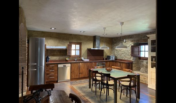 La cocina está equipada con dos refrigeradores, uno con congelador, placas de cerámica, horno, microondas, lavavajillas, prensas de jugo, cafetera, tostadora, licuadora, tostadora y una paellera para 15-20 personas.