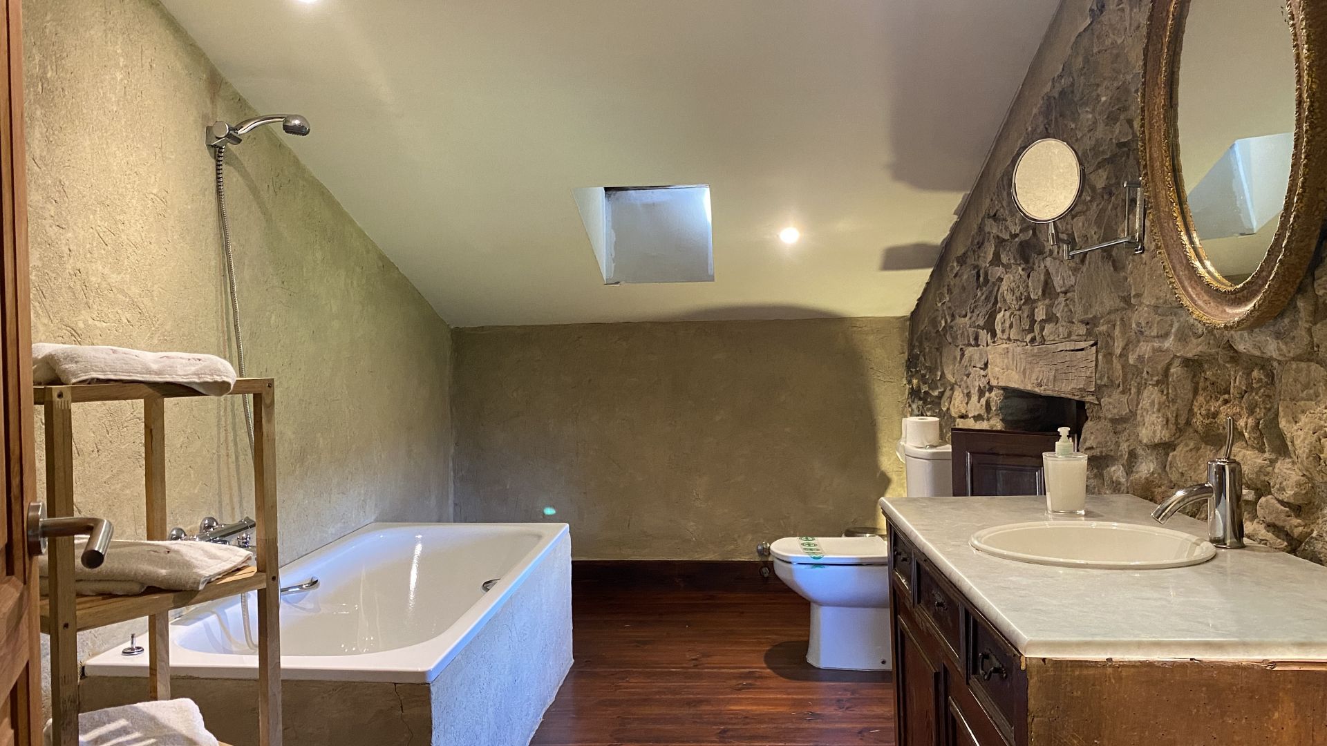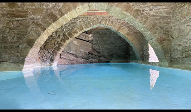 Los 450 m2 en total divididos en tres plantas han sido renovados respetando el estilo rústico y ofrecen una cocina totalmente equipada, una hermosa sala de estar curva con chimenea, seis habitaciones dobles y una habitación triple, todas con baño privado. Como se mencionó, hay una piscina cubierta, que permite nadar durante todo el año.